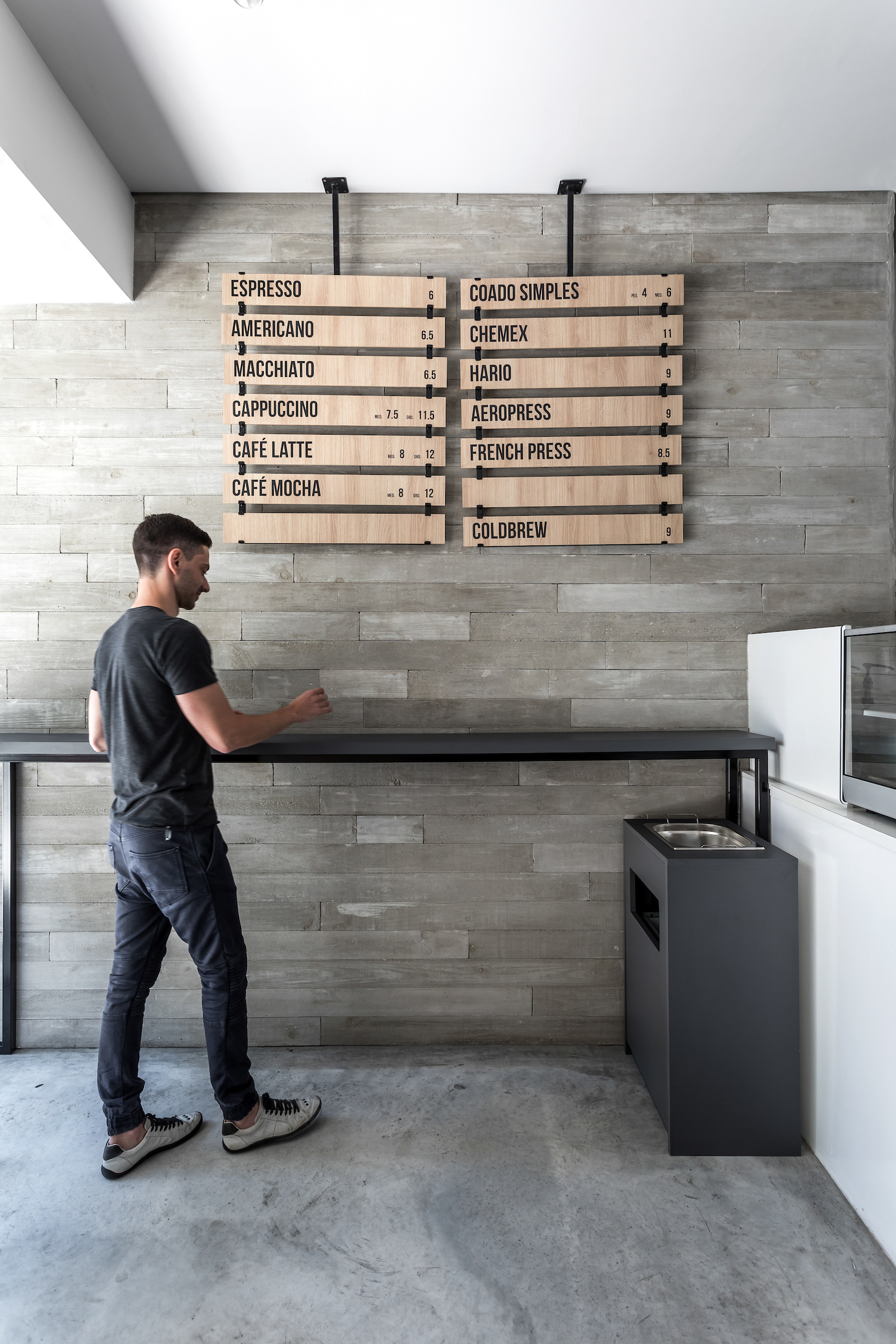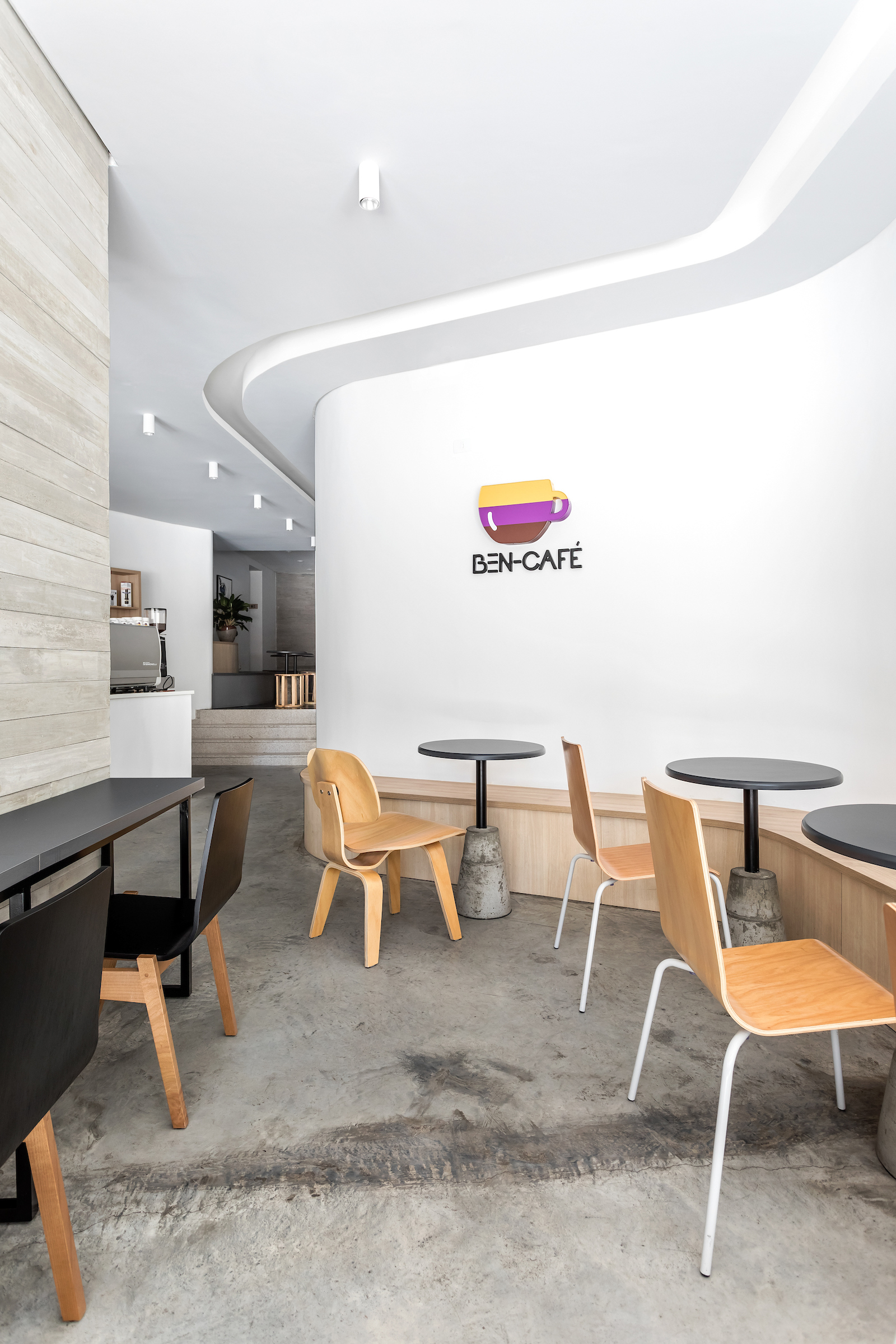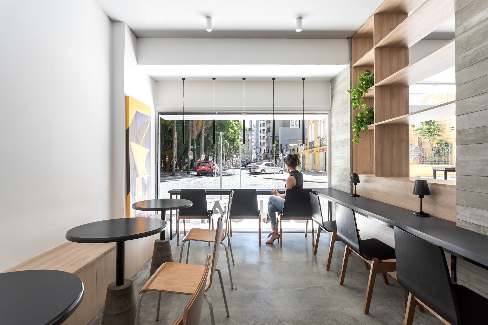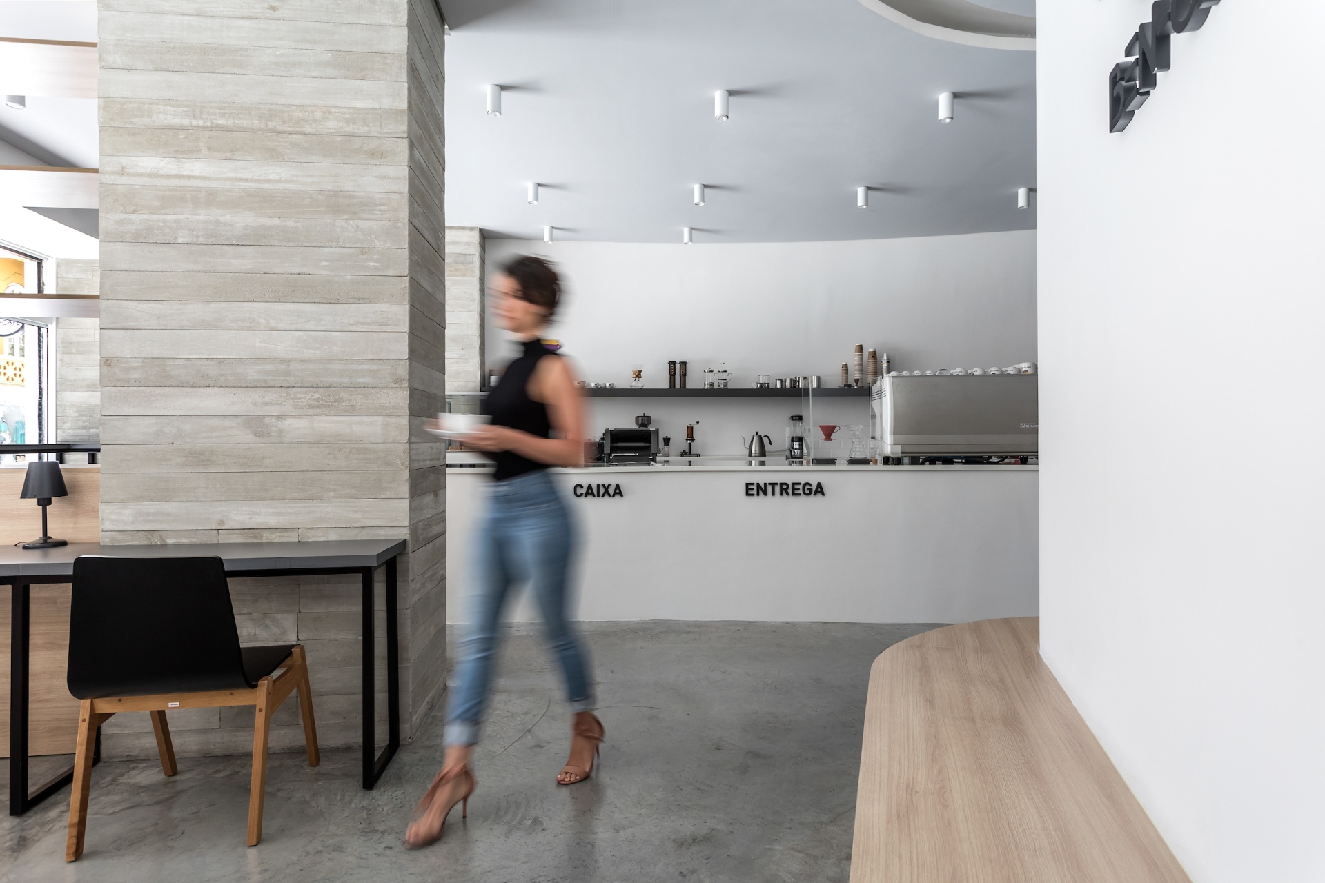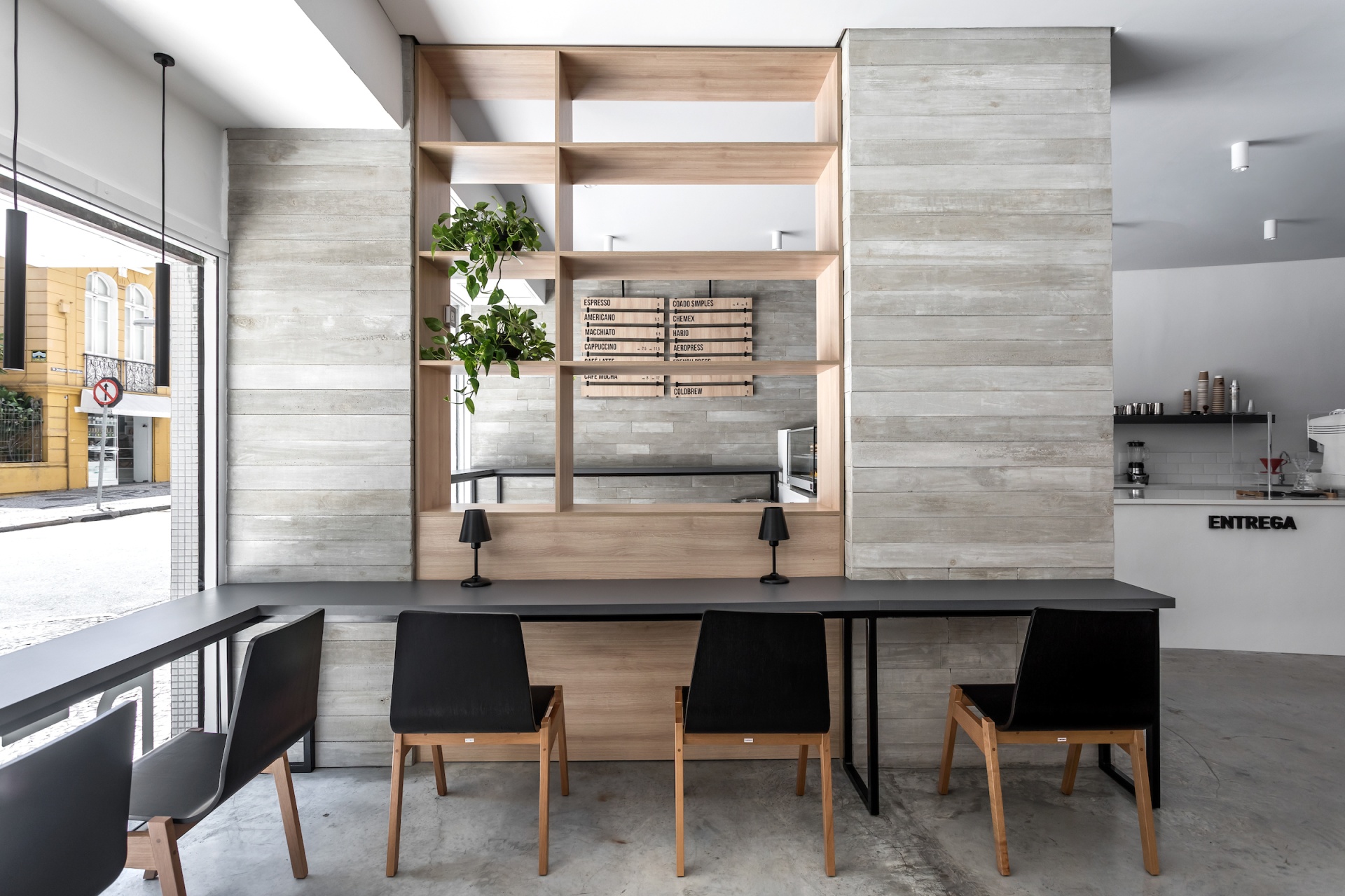 Ben-Café appears in a subtle way, inside an important modernist building in downtown Curitiba, mixing minimalist and industrial references to create a welcoming atmosphere. The original plant – organic and full of curves – had its concept reinforced with the makeover, determining that the furniture should relate to it. In carpentry, benches shaped in a sinuous way outline walls and gives a light sensation with the wood tone. The service desk is a prominent central volume, curved, and defines the main circulation, while the dining benches are close to the windows to take advantage of natural lightning and visuals from the Osório square. Homogeneous and with as industrial reference, the burnt cement floor creates a neutral base and the large pillar – covered with concrete slats – delimits the wood bookcase. The white palete invades the space and is balanced by the rusticity of the cement.In an unusual proposal that strives for functional organization with balanced aesthetics, the integration connects the rooms and allows moments of permanence to happen in the cafe.
