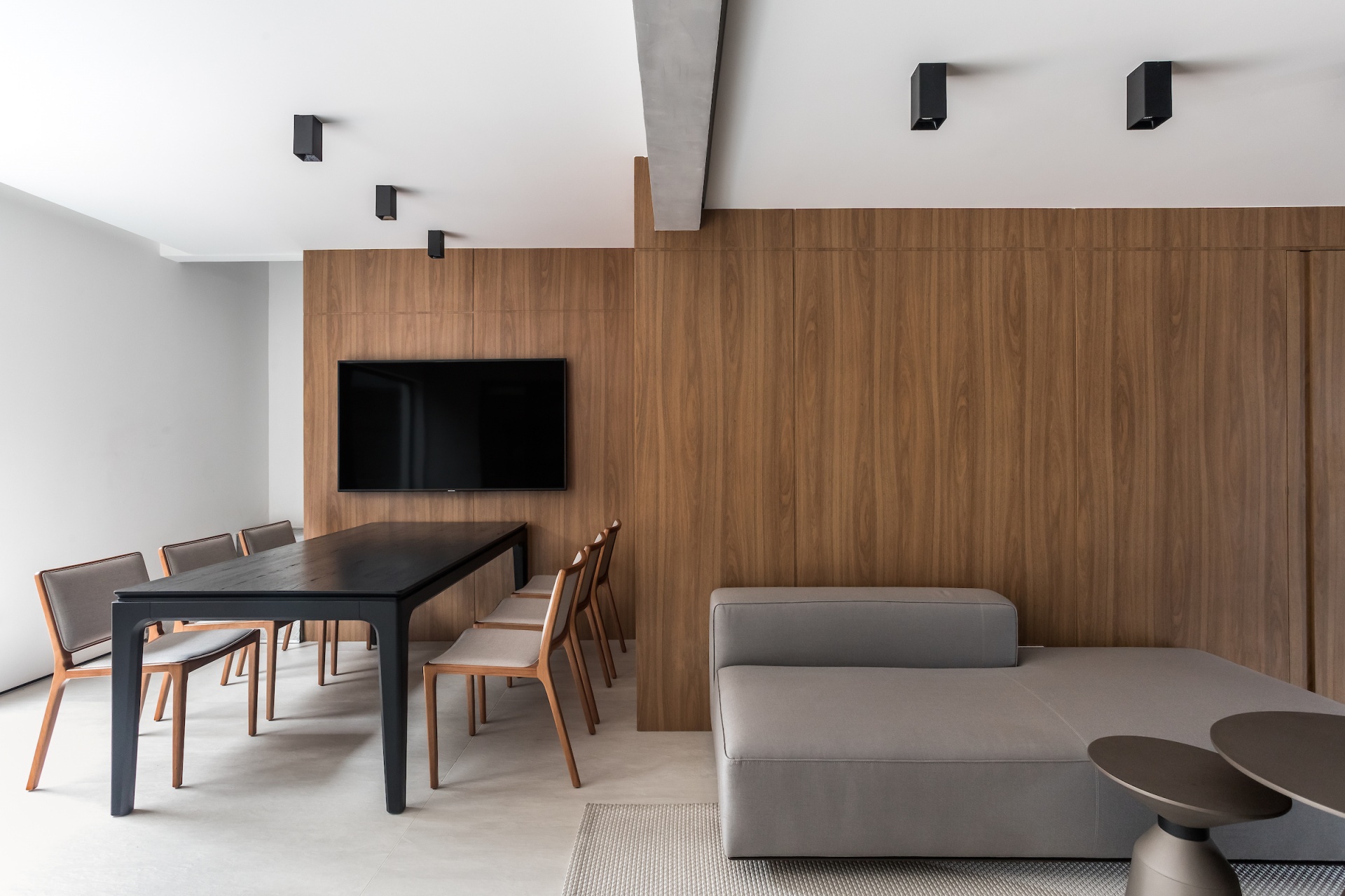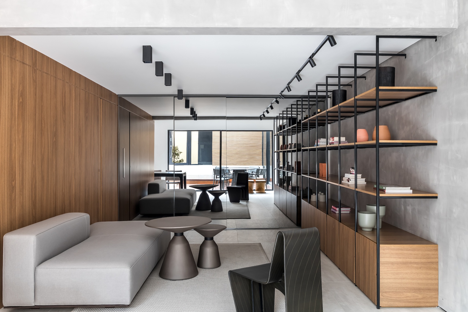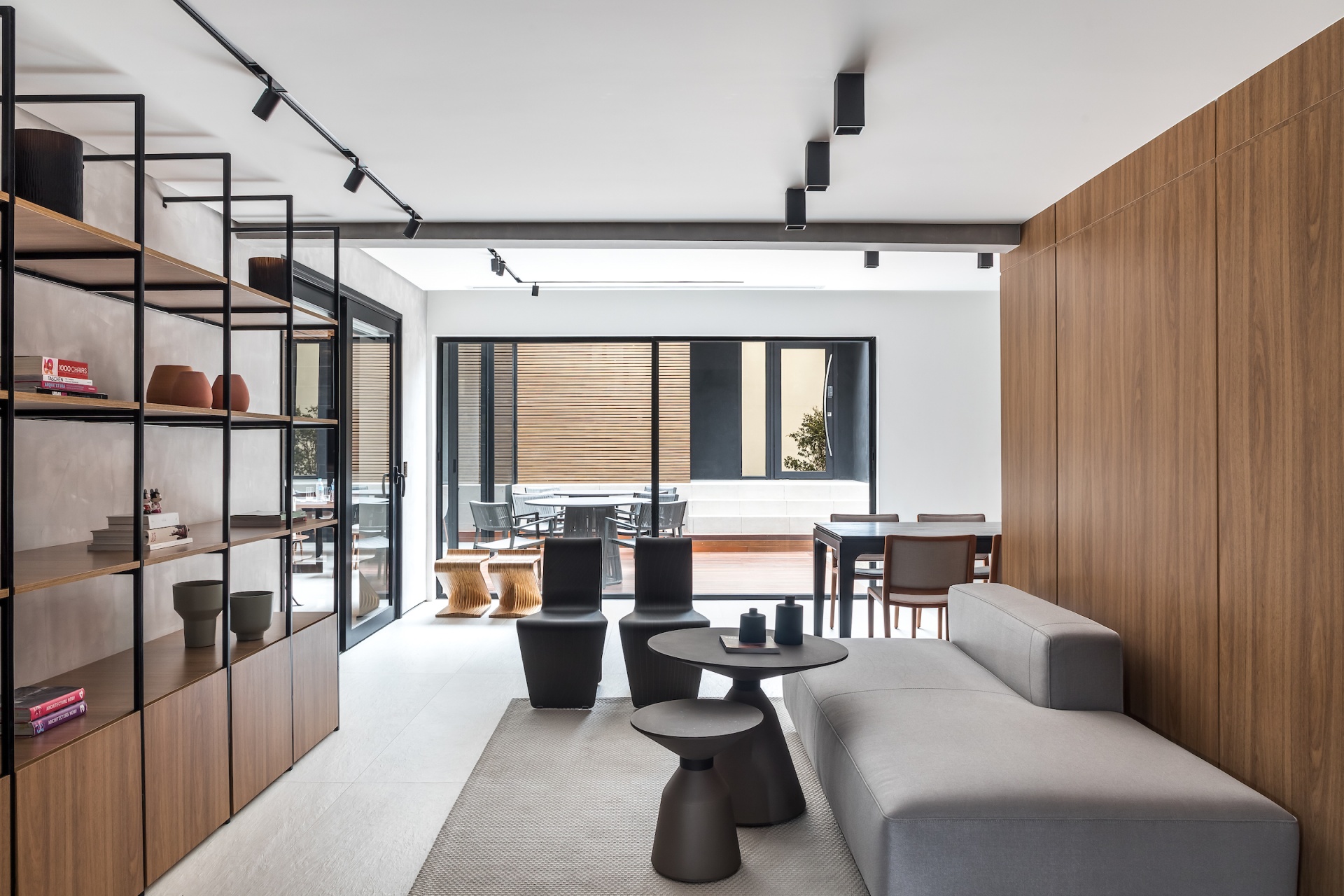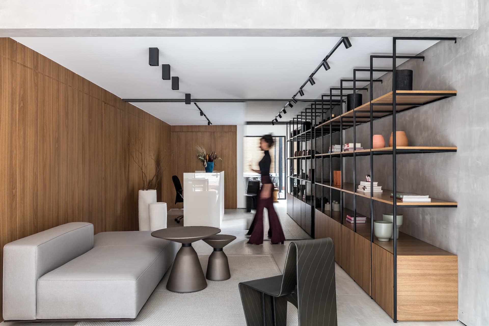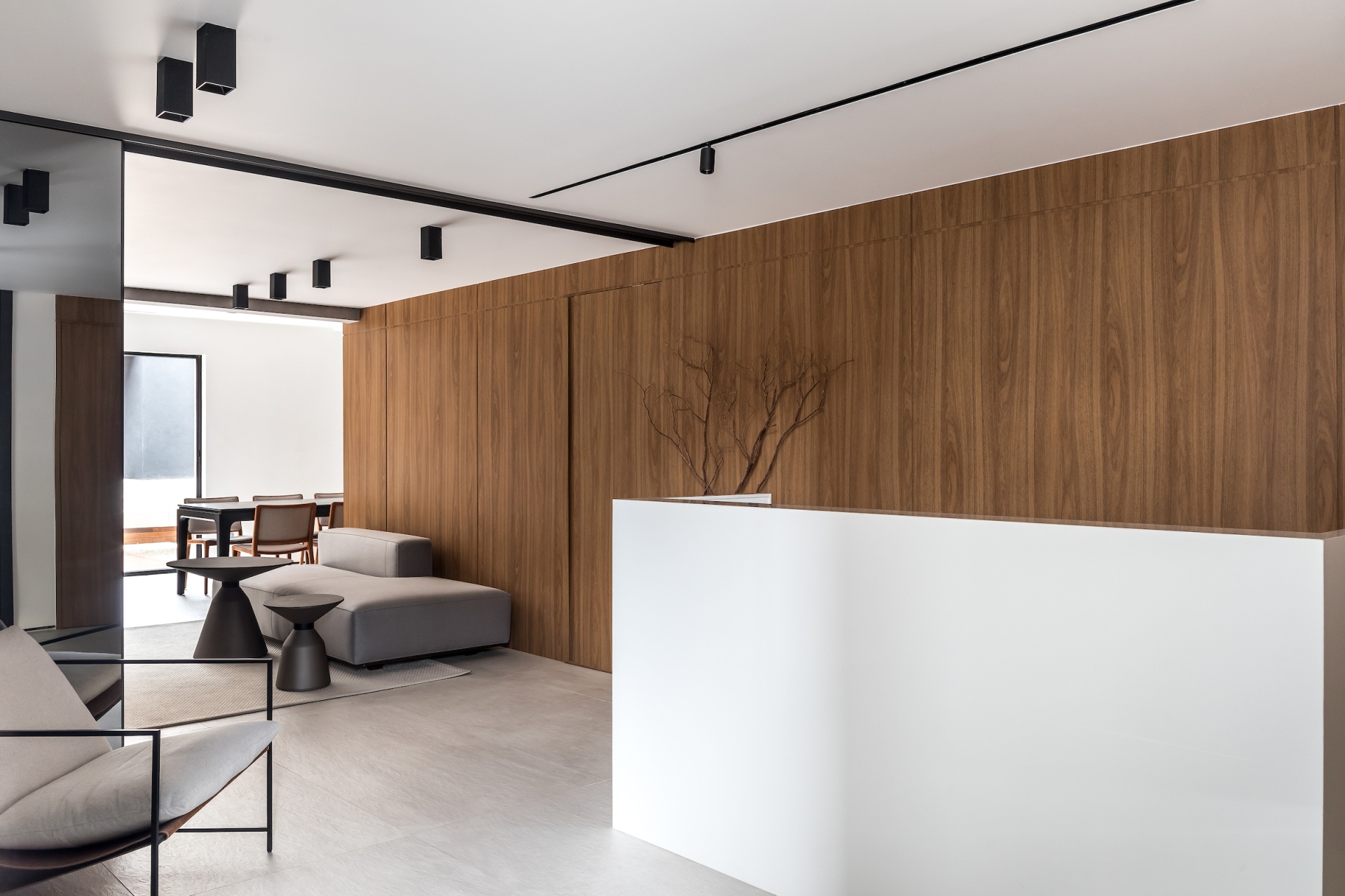 The proposal for the reception of Bidese Construtora has a neutral language in its tones, balancing neutral tones, white volumes, black lines and wood finishes. In the same environment, the lobby area and living area are integrated. To separate them, the sliding mirror doors close, providing privacy and allowing small meetings andR team training. On the one side, the wood panel, and on the other the metallic bookcase, giving the feeling of closing the space, making the atmosphere more intimate.