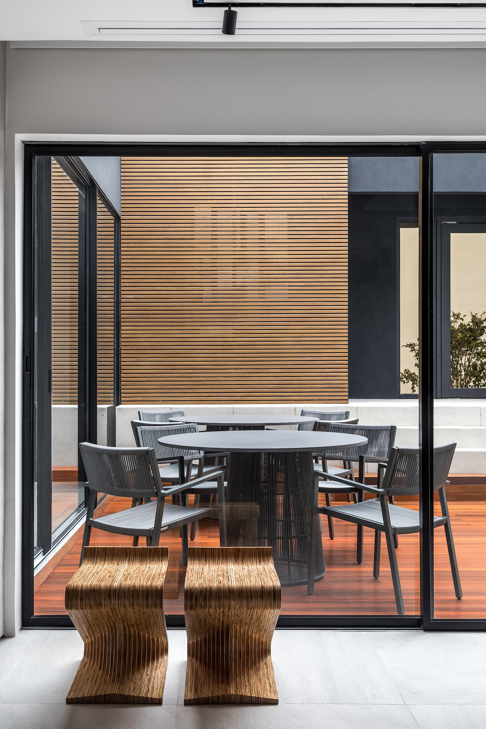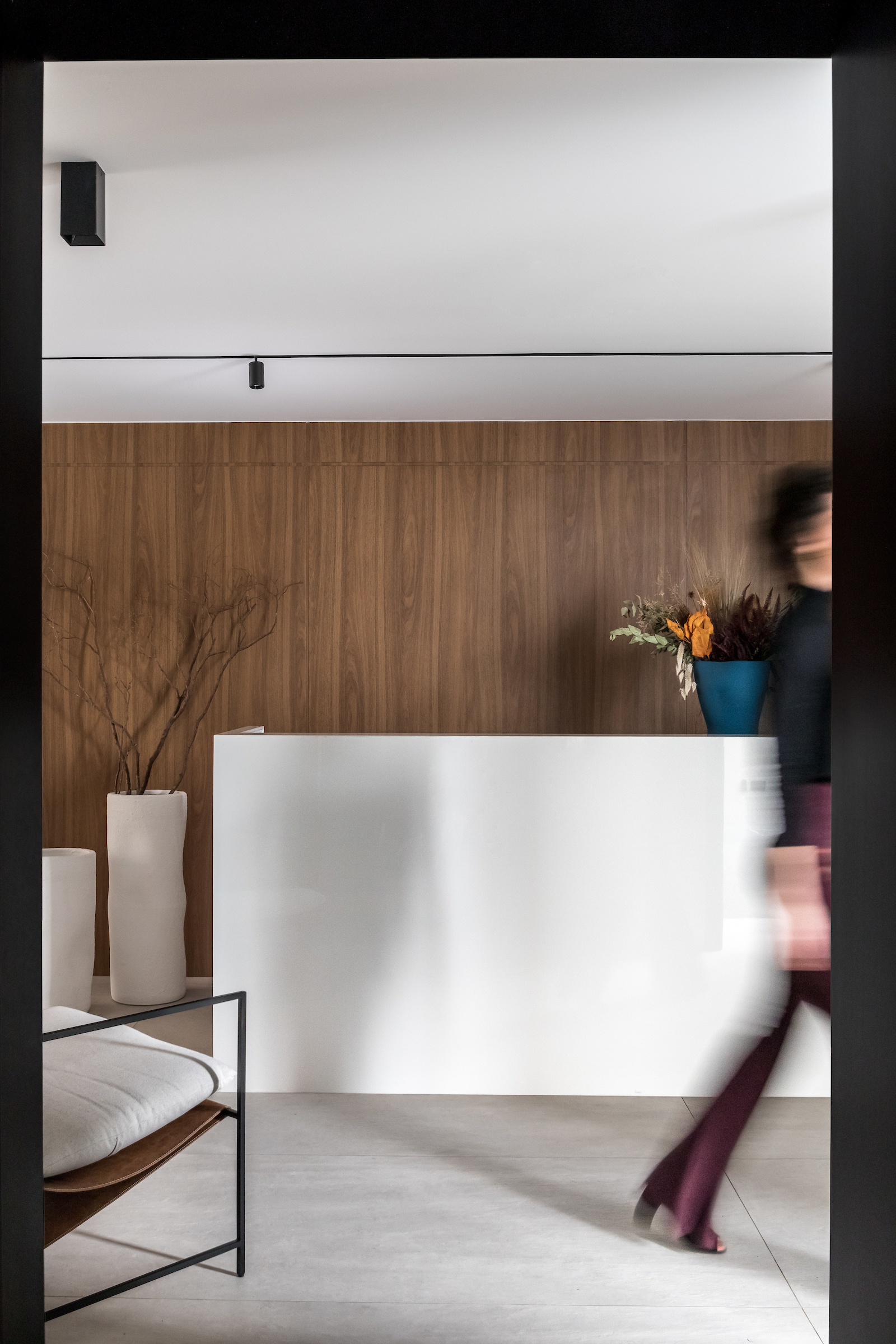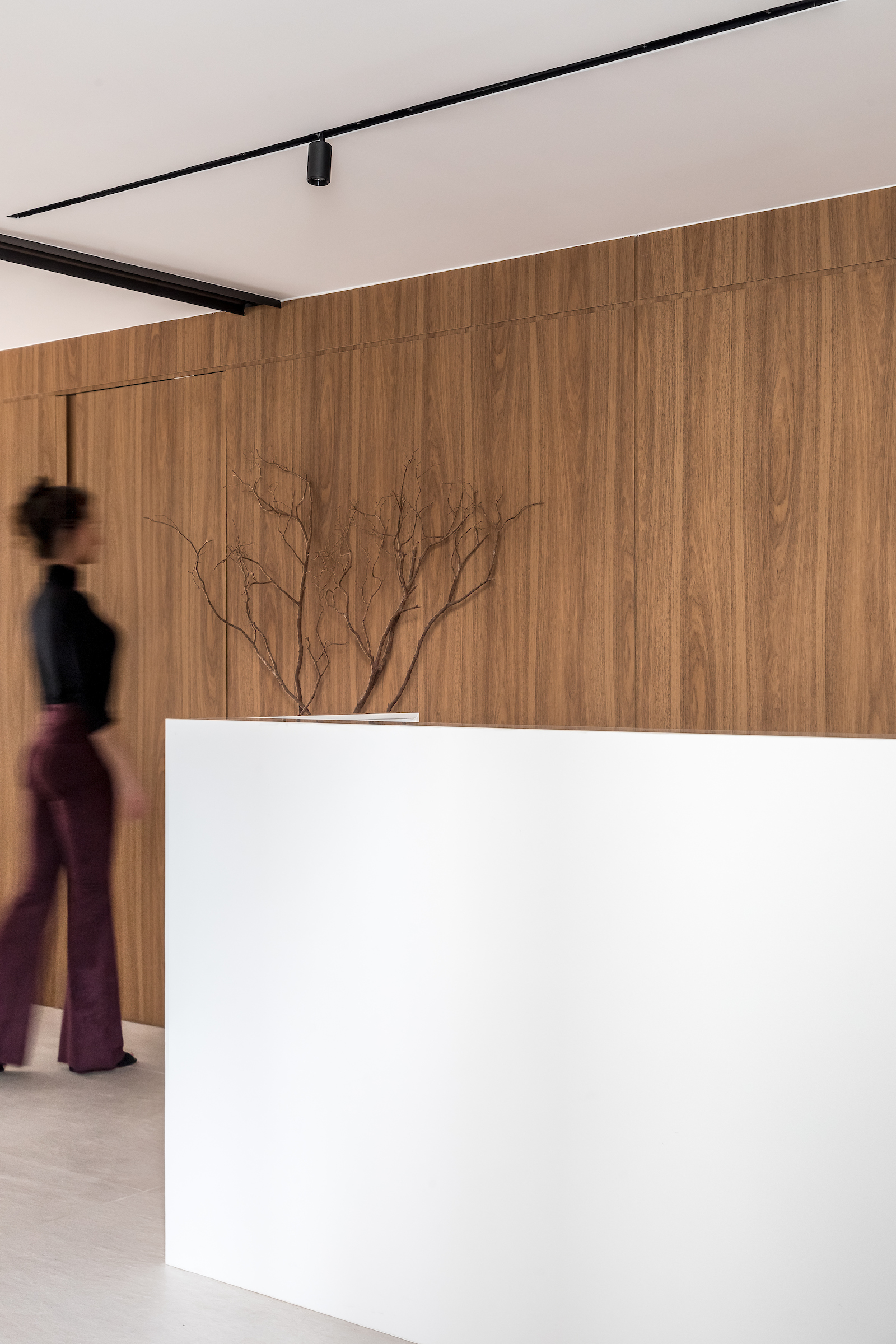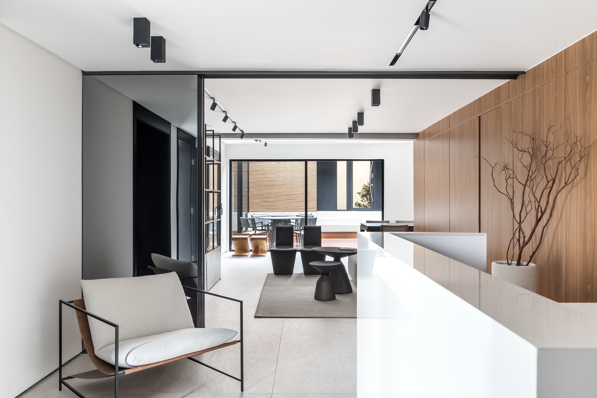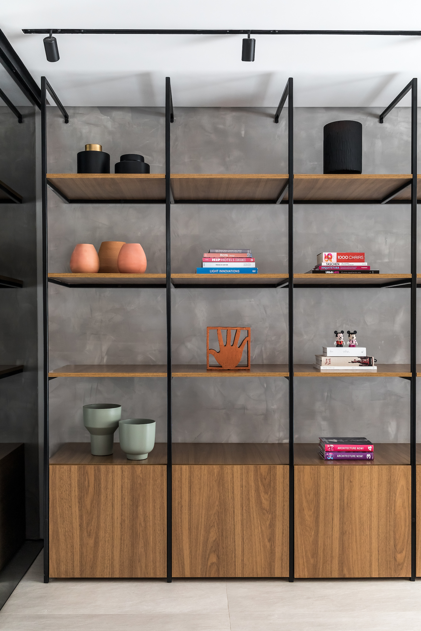 The proposal for the reception of Bidese Construtora has a neutral language in its tones, balancing neutral tones, white volumes, black lines and wood finishes. In the same environment, the lobby area and living area are integrated. To separate them, the sliding mirror doors close, providing privacy and allowing small meetings andR team training. On the one side, the wood panel, and on the other the metallic bookcase, giving the feeling of closing the space, making the atmosphere more intimate.