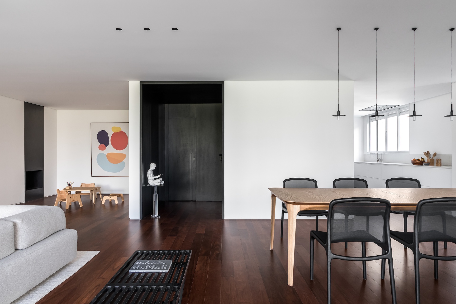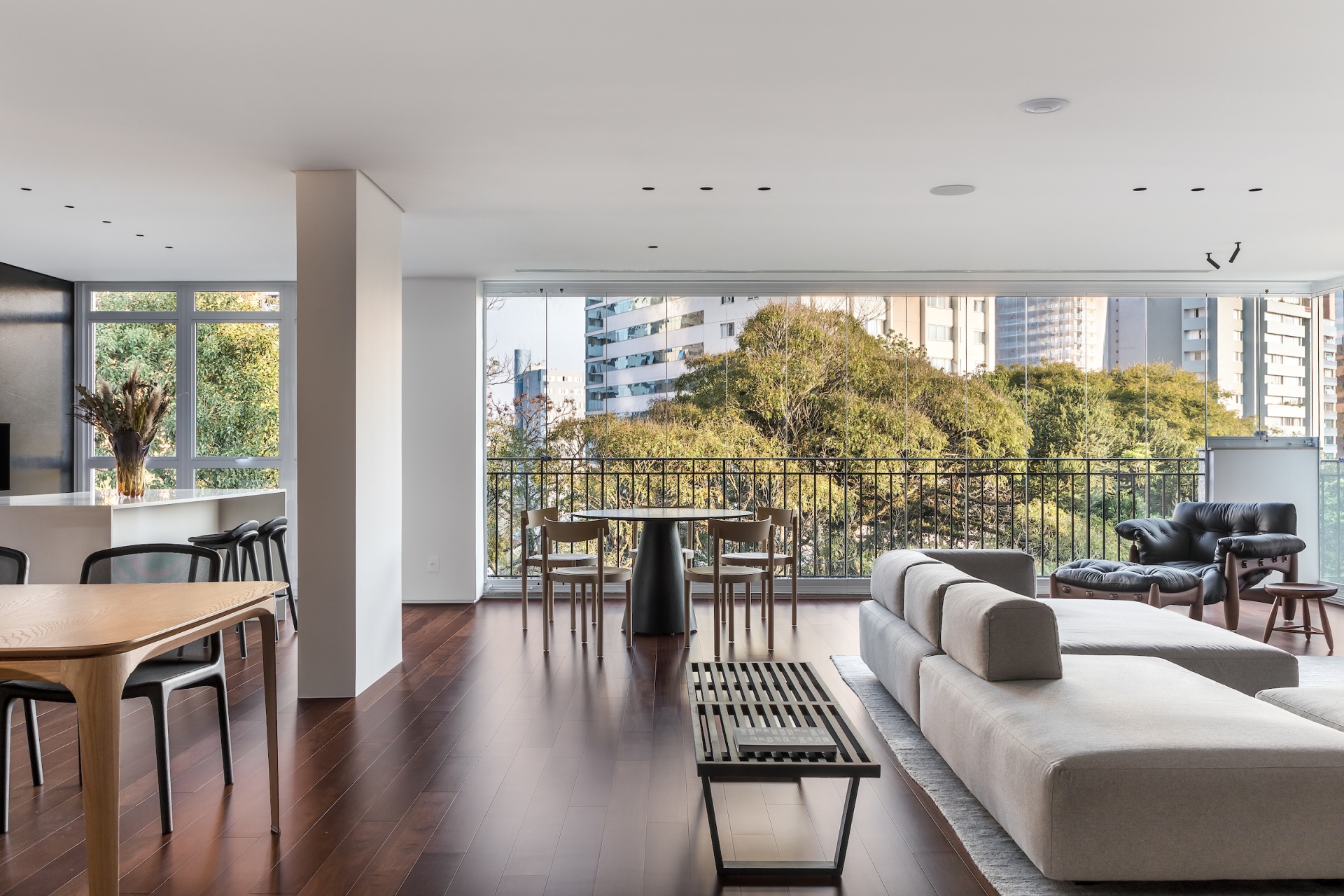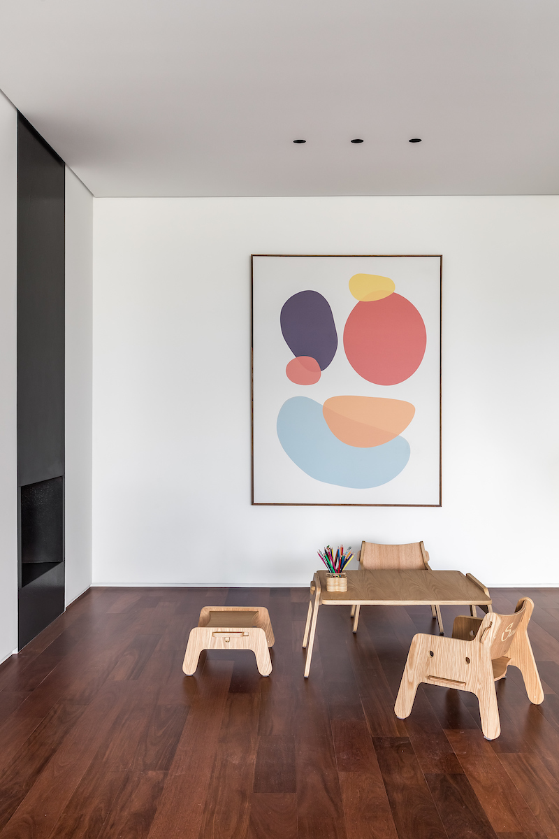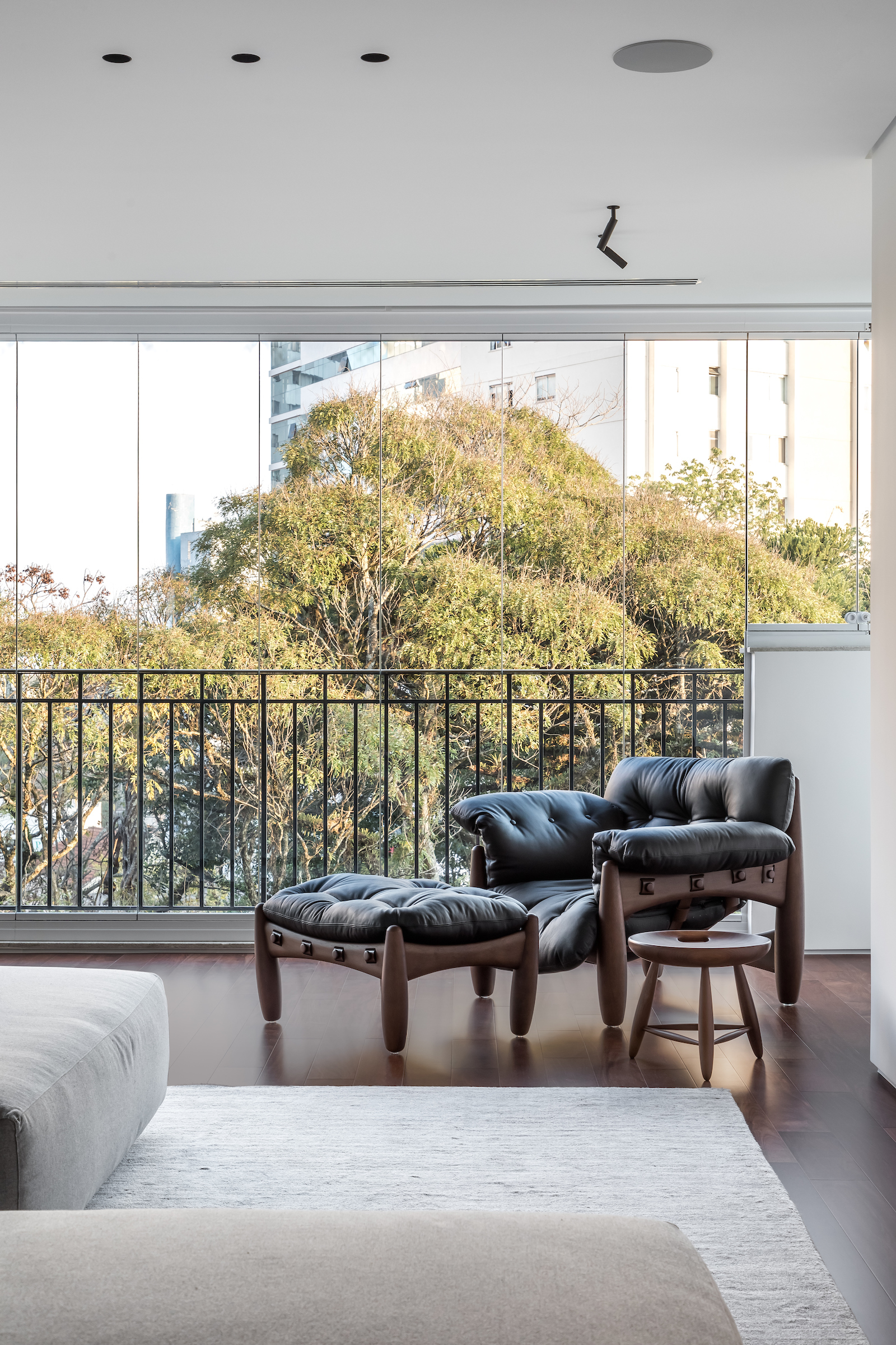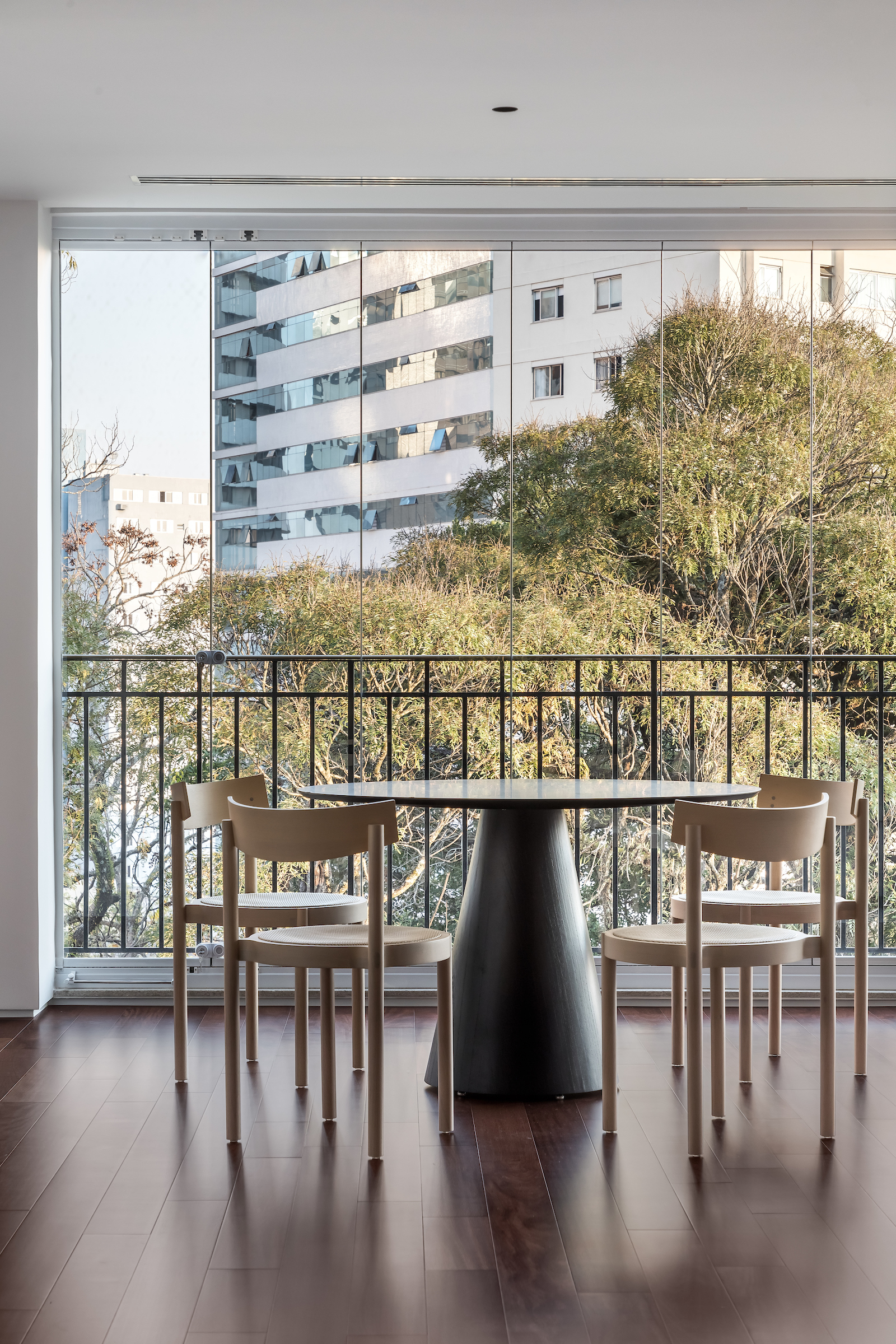 As soon as you step into the 290 m² apartment in Curitiba, PR, you enter a small black box where ebonized wood in the ceiling and walls conceals the lift and restroom doors in the hall, creating some perspective. Just a few steps and a luminous room is disclosed, where tree canopies emerge from the windows and contrast with the clean architectural features. Among white walls, glass panes and natural wood floor – where, surprisingly, even a playroom has its place –, the carefully chosen curvilinear loose furniture stands out, with pieces signed by Sergio Rodrigues, Jader Almeida, Guilherme Wentz and Estudiobola.