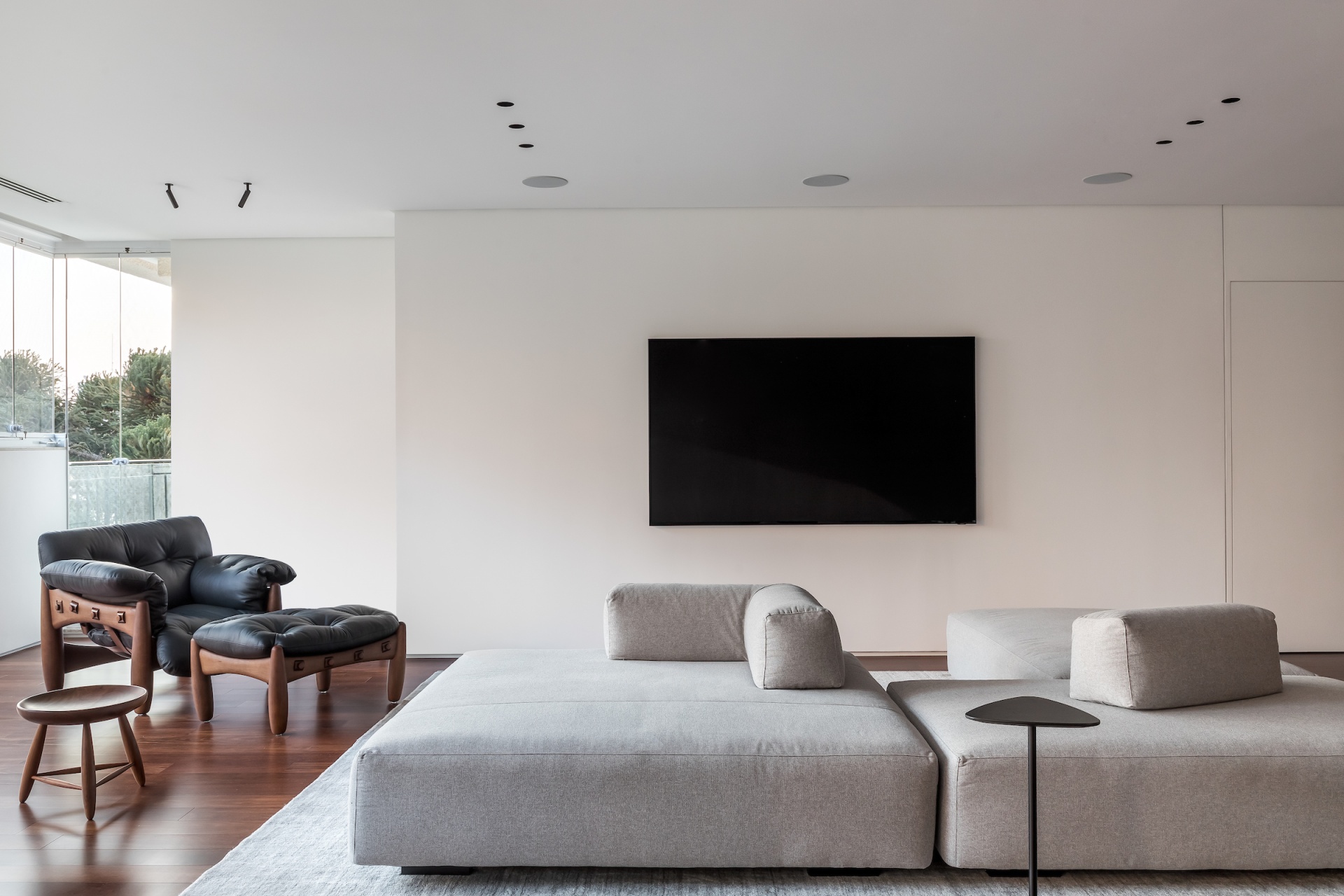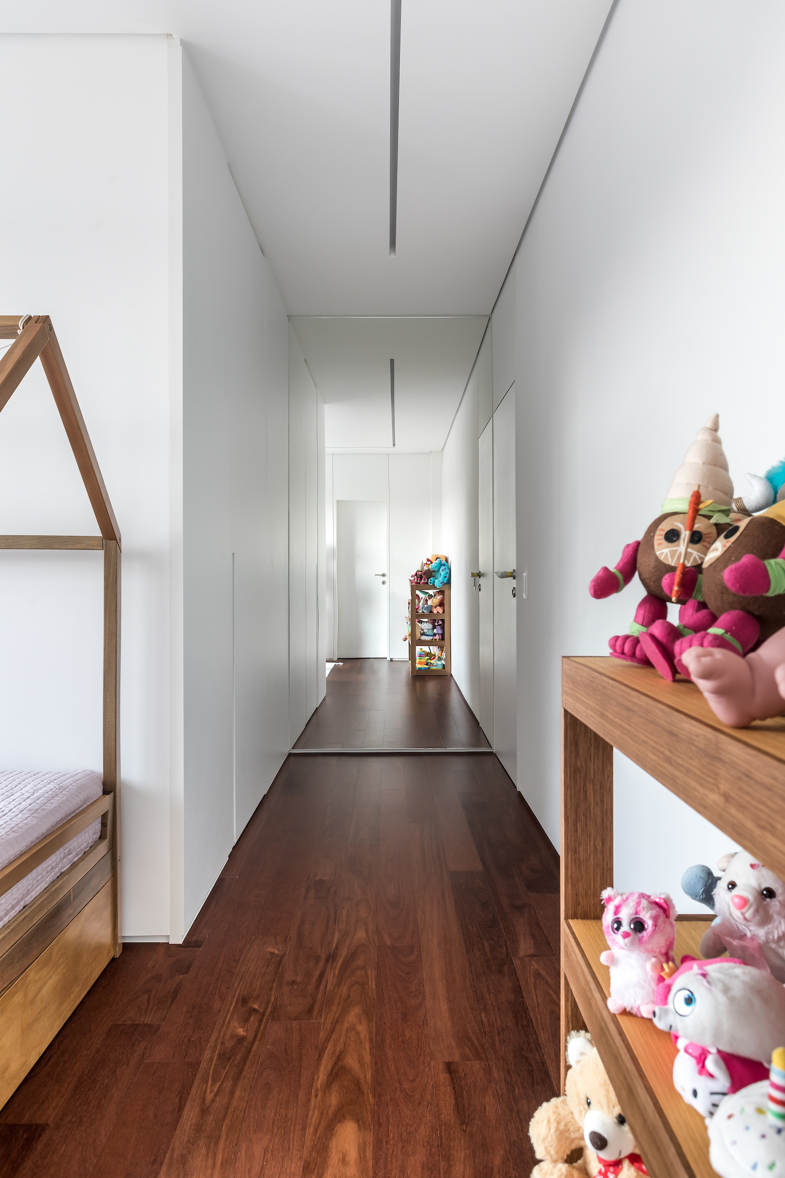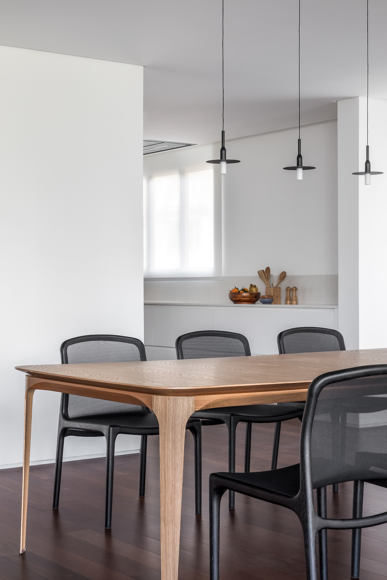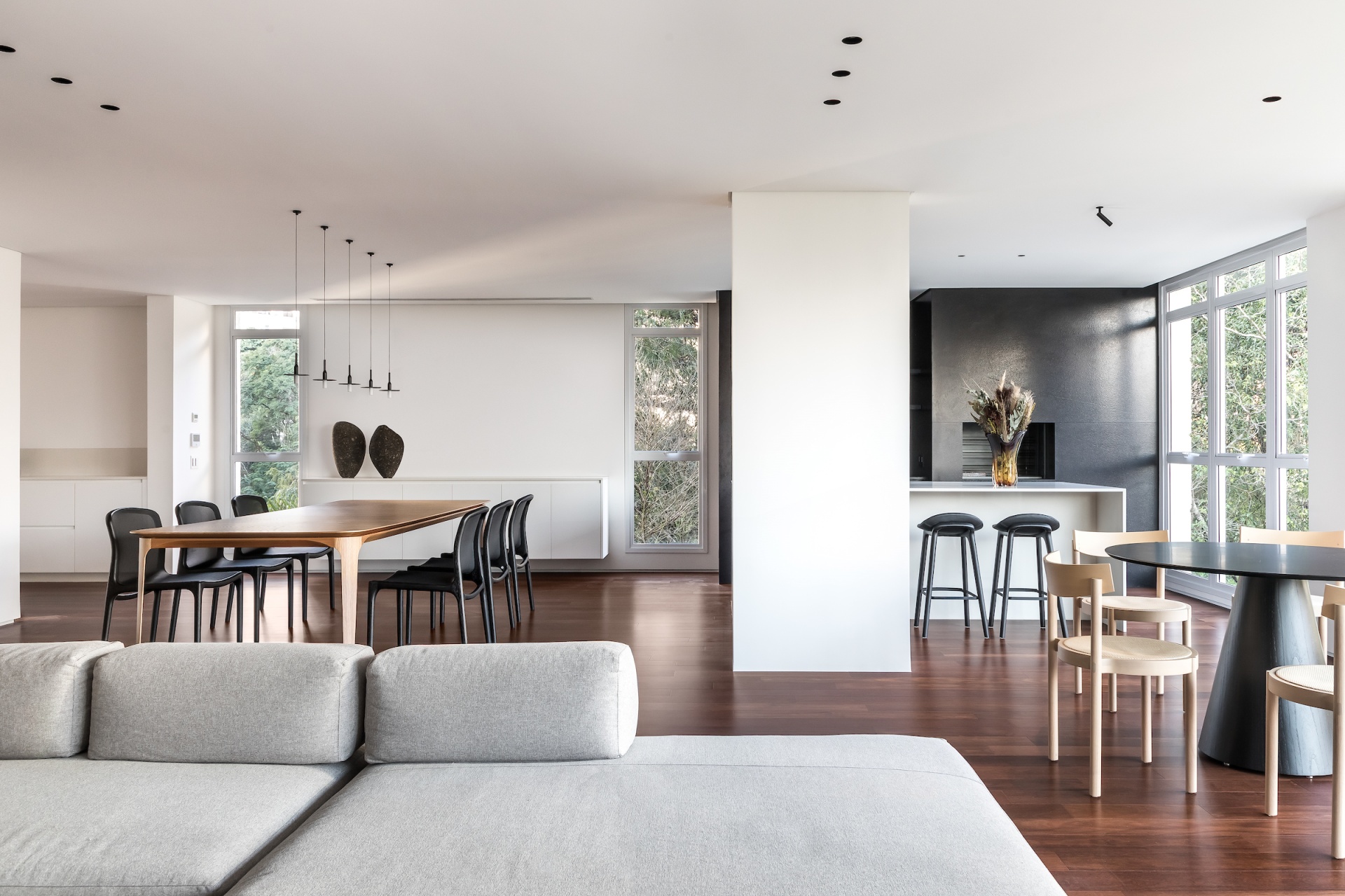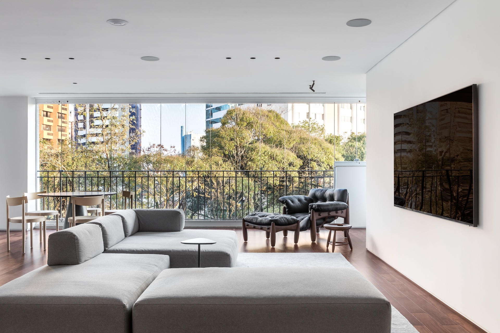 As soon as you step into the 290 m² apartment in Curitiba, PR, you enter a small black box where ebonized wood in the ceiling and walls conceals the lift and restroom doors in the hall, creating some perspective. Just a few steps and a luminous room is disclosed, where tree canopies emerge from the windows and contrast with the clean architectural features. Among white walls, glass panes and natural wood floor – where, surprisingly, even a playroom has its place –, the carefully chosen curvilinear loose furniture stands out, with pieces signed by Sergio Rodrigues, Jader Almeida, Guilherme Wentz and Estudiobola.