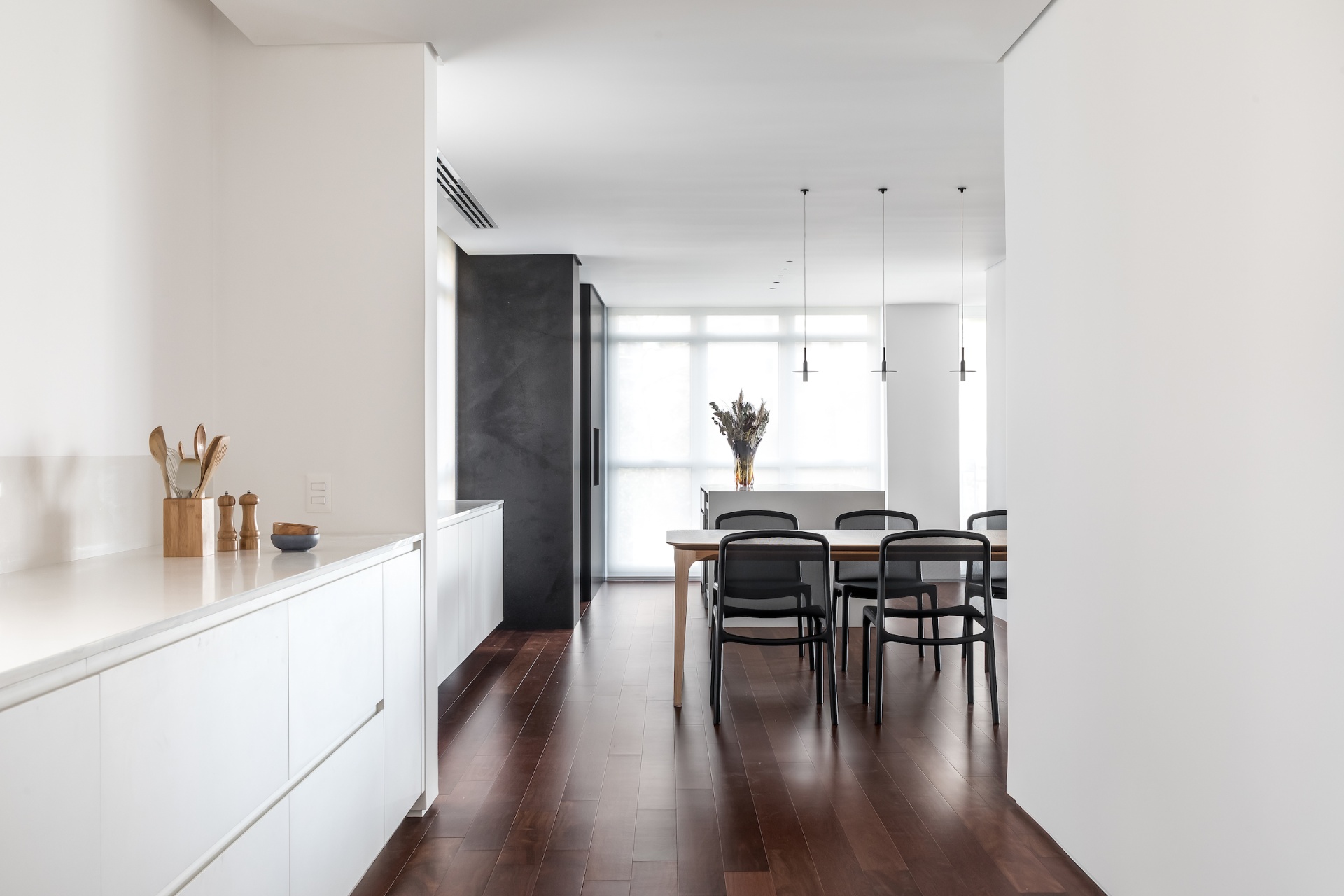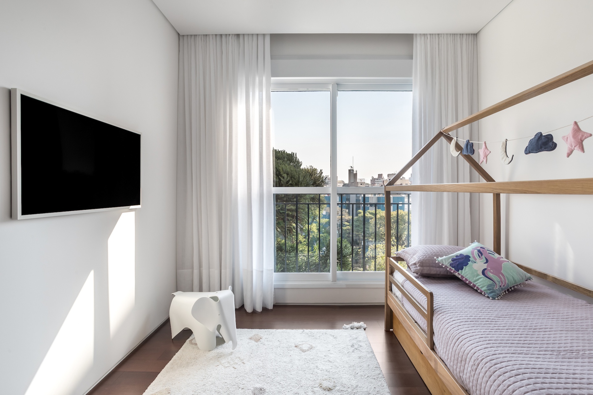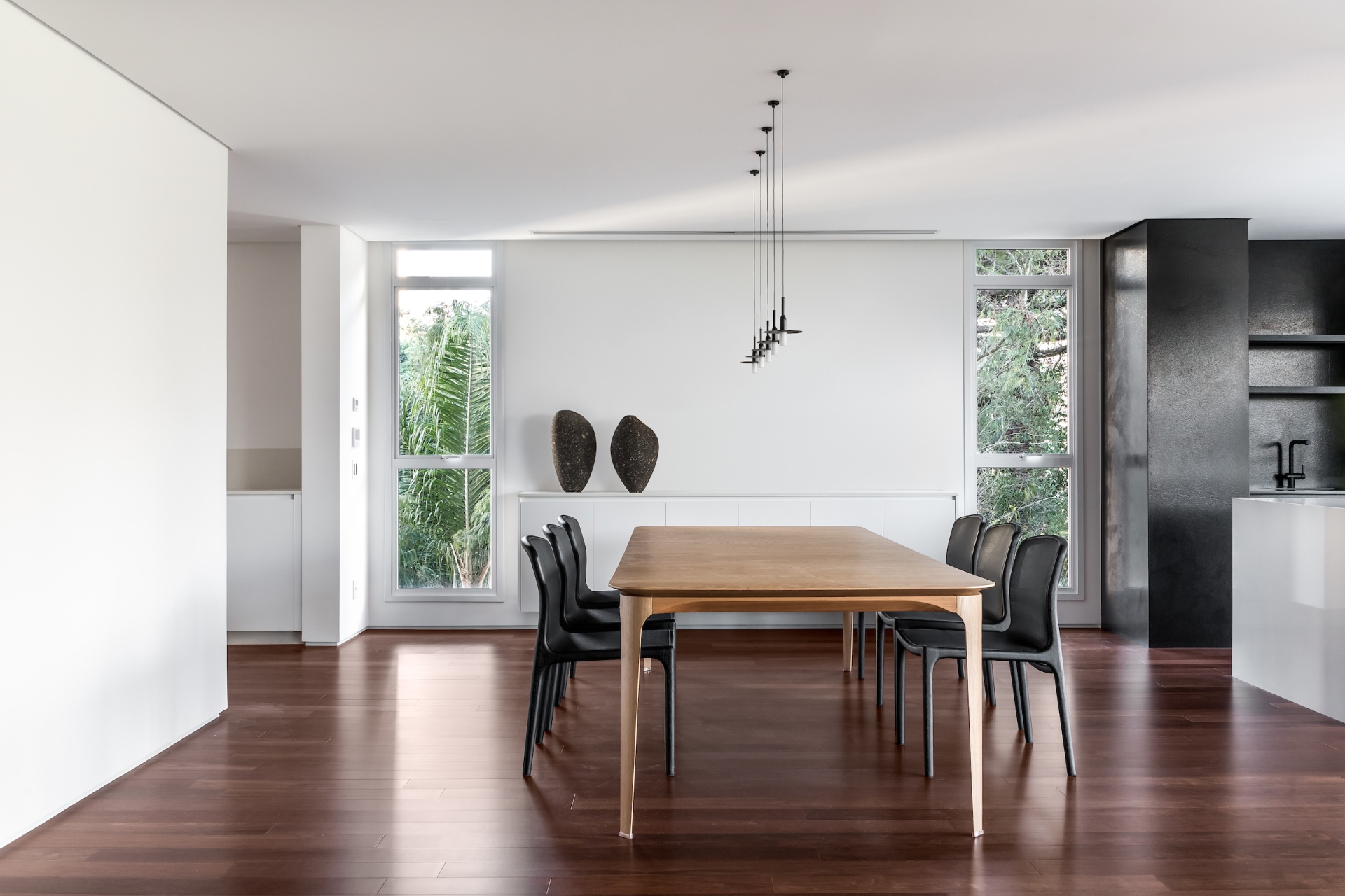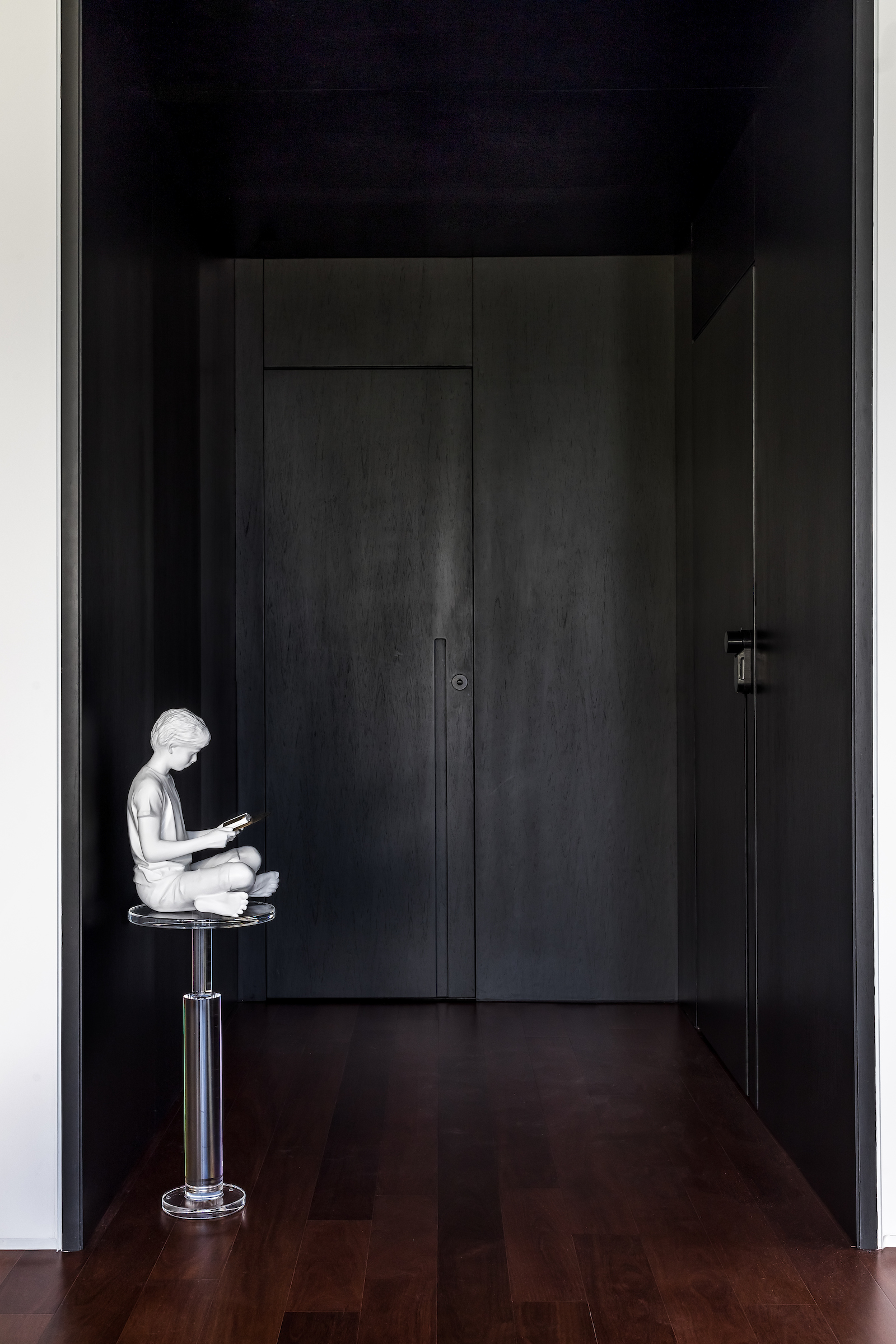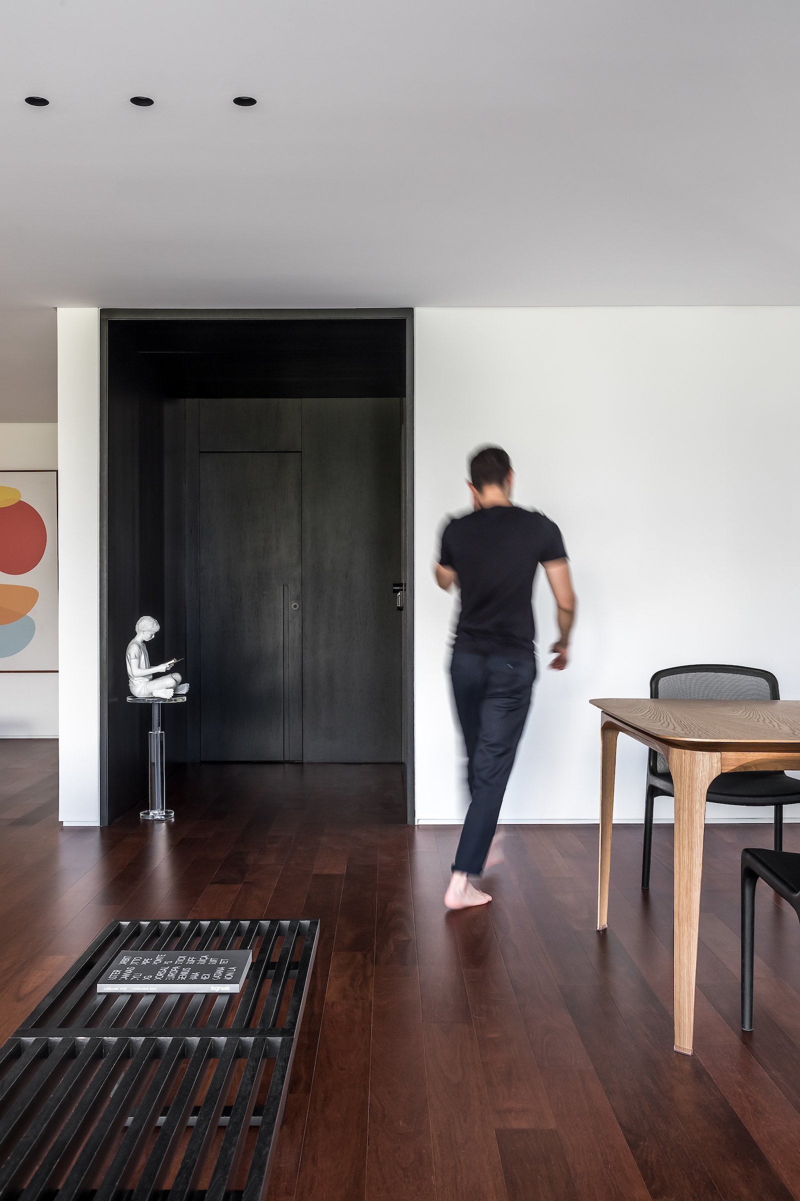 As soon as you step into the 290 m² apartment in Curitiba, PR, you enter a small black box where ebonized wood in the ceiling and walls conceals the lift and restroom doors in the hall, creating some perspective. Just a few steps and a luminous room is disclosed, where tree canopies emerge from the windows and contrast with the clean architectural features. Among white walls, glass panes and natural wood floor – where, surprisingly, even a playroom has its place –, the carefully chosen curvilinear loose furniture stands out, with pieces signed by Sergio Rodrigues, Jader Almeida, Guilherme Wentz and Estudiobola.