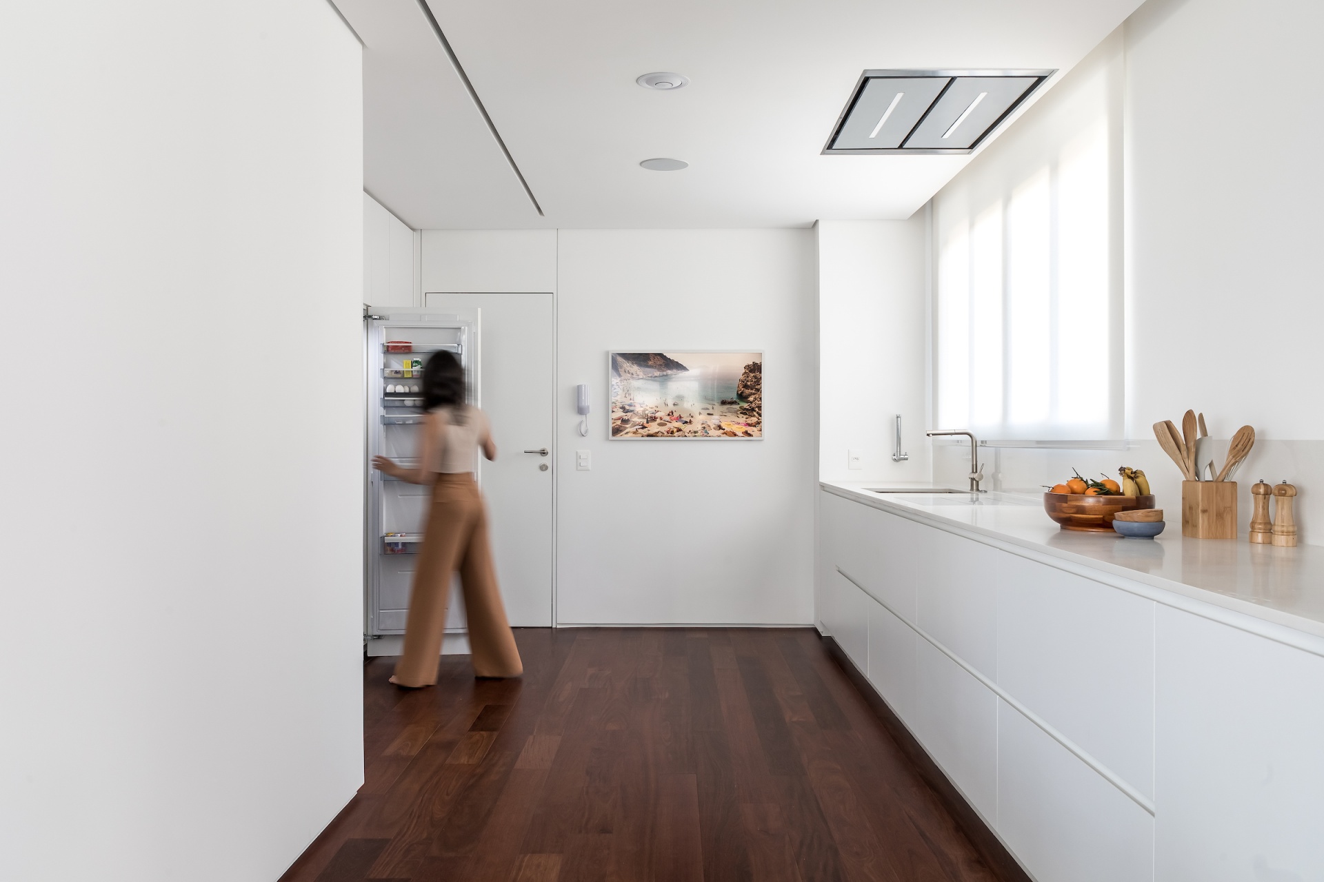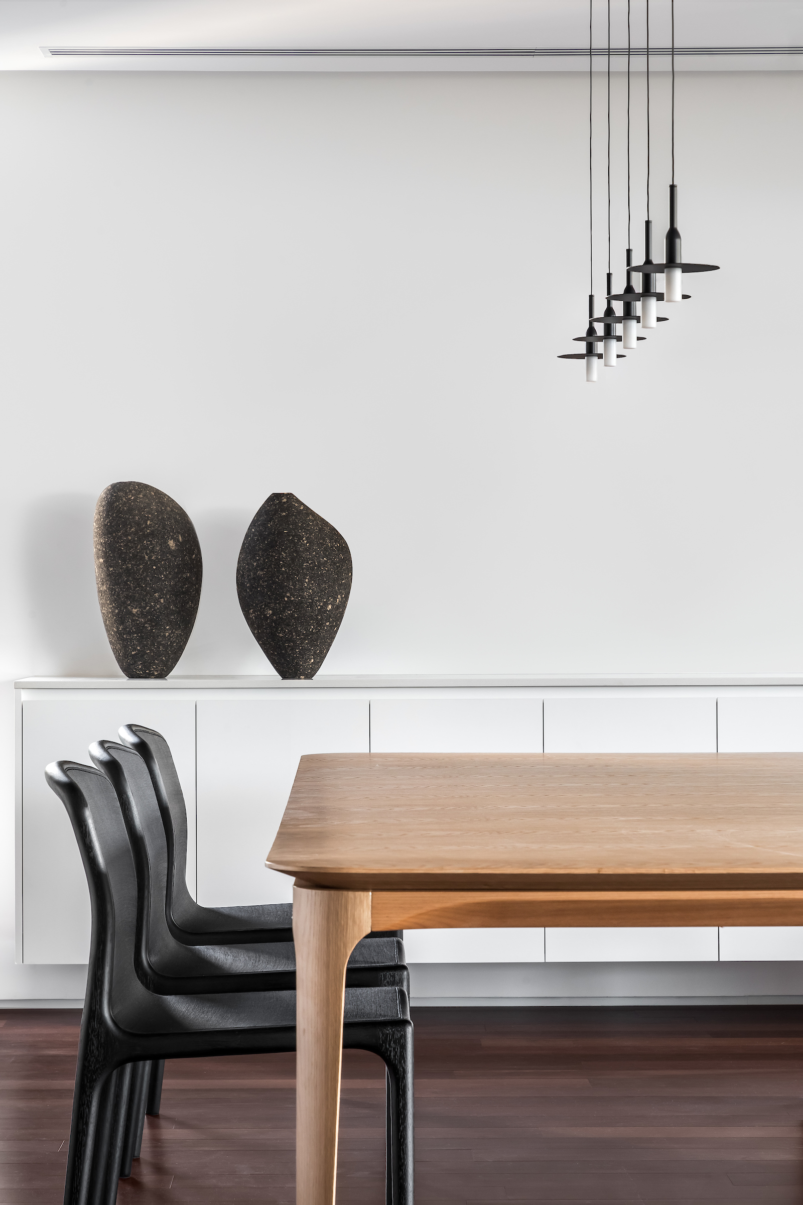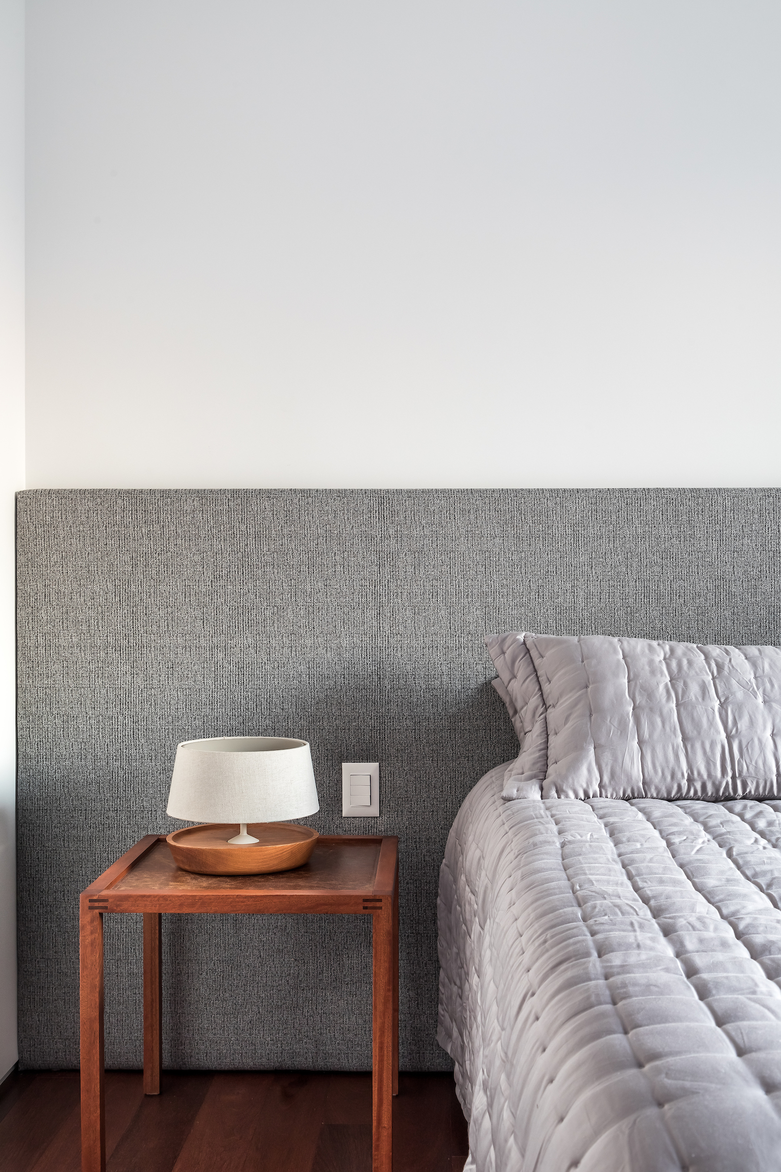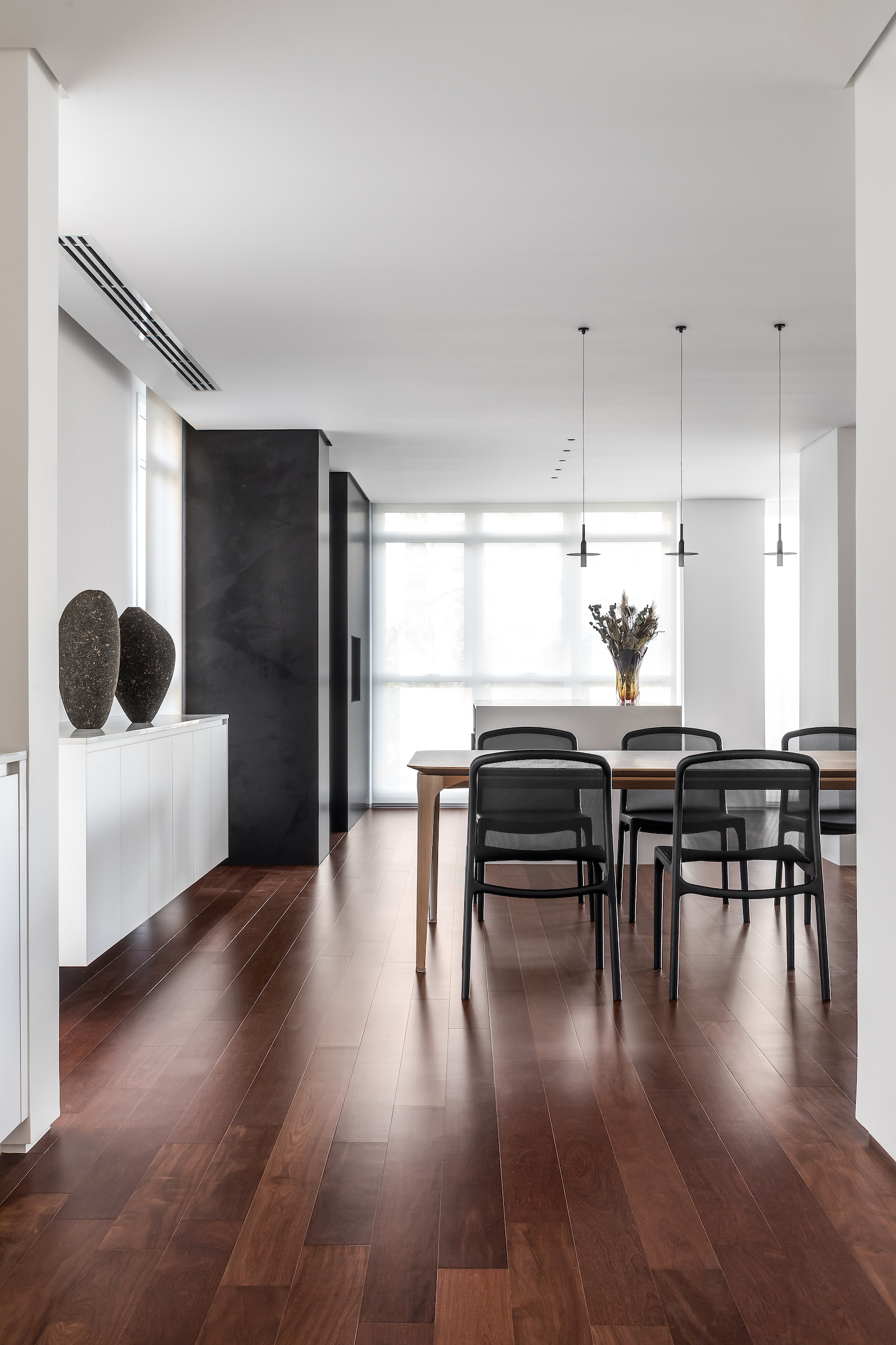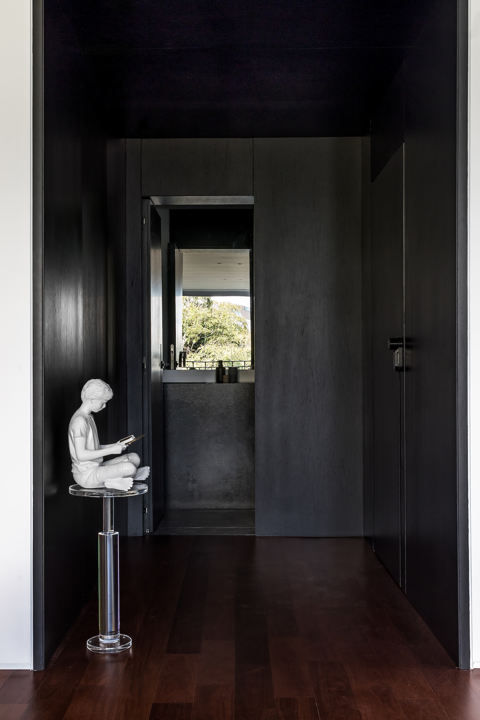As soon as you step into the 290 m² apartment in Curitiba, PR, you enter a small black box where ebonized wood in the ceiling and walls conceals the lift and restroom doors in the hall, creating some perspective. Just a few steps and a luminous room is disclosed, where tree canopies emerge from the windows and contrast with the clean architectural features. Among white walls, glass panes and natural wood floor – where, surprisingly, even a playroom has its place –, the carefully chosen curvilinear loose furniture stands out, with pieces signed by Sergio Rodrigues, Jader Almeida, Guilherme Wentz and Estudiobola.