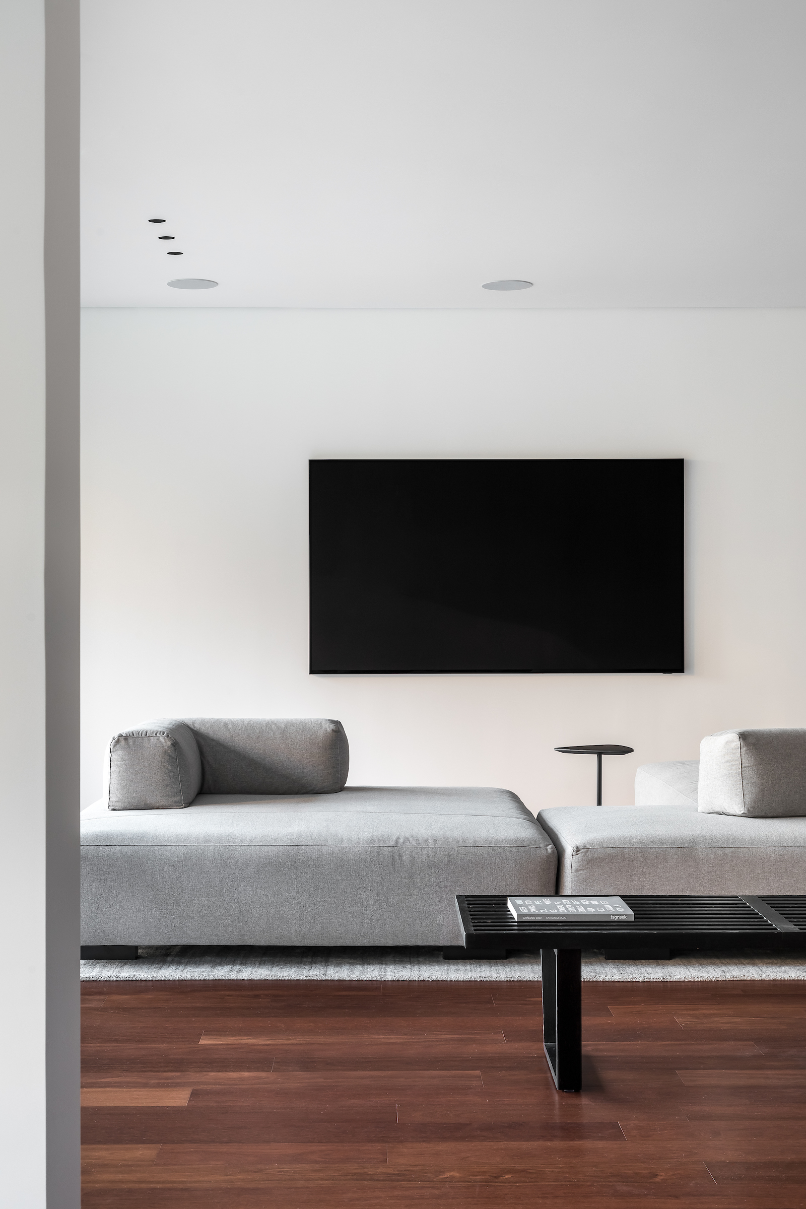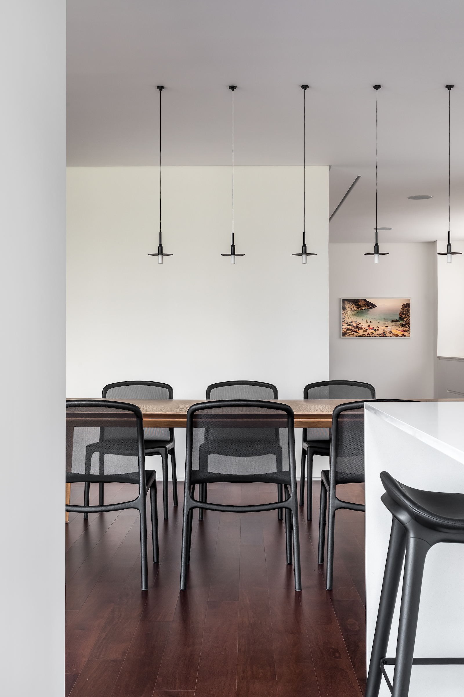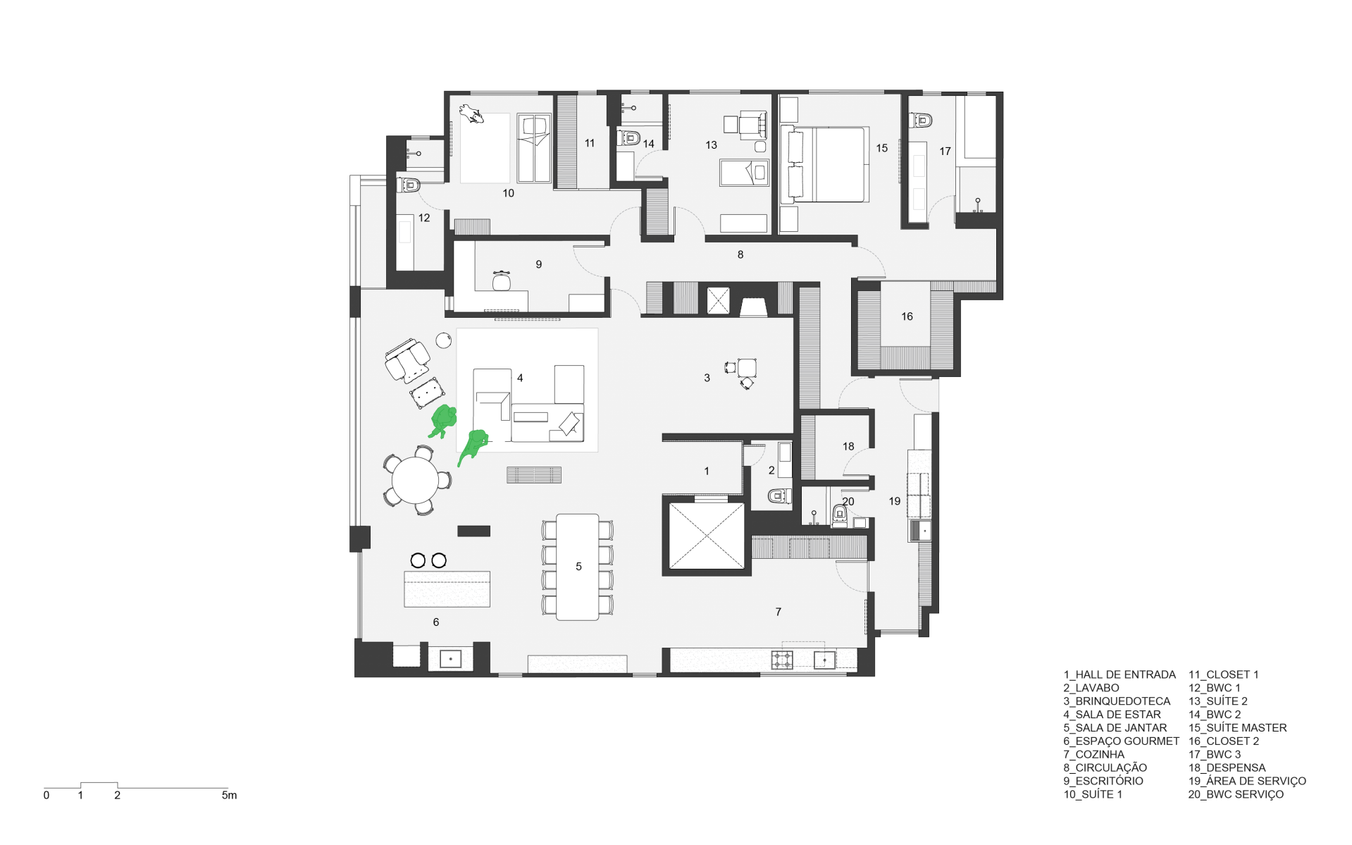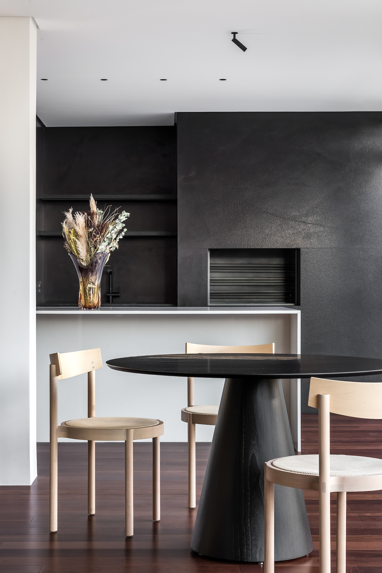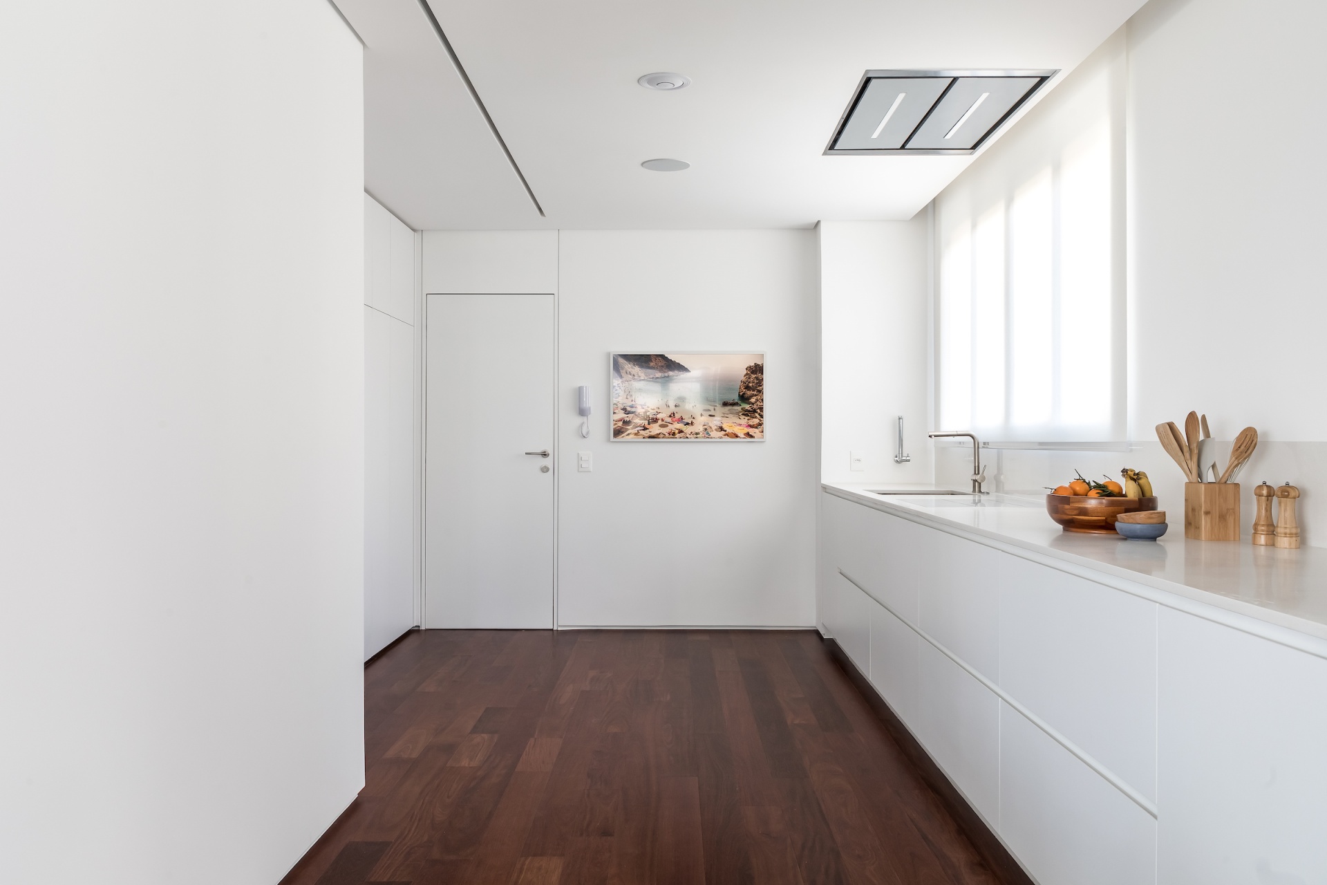 As soon as you step into the 290 m² apartment in Curitiba, PR, you enter a small black box where ebonized wood in the ceiling and walls conceals the lift and restroom doors in the hall, creating some perspective. Just a few steps and a luminous room is disclosed, where tree canopies emerge from the windows and contrast with the clean architectural features. Among white walls, glass panes and natural wood floor – where, surprisingly, even a playroom has its place –, the carefully chosen curvilinear loose furniture stands out, with pieces signed by Sergio Rodrigues, Jader Almeida, Guilherme Wentz and Estudiobola.