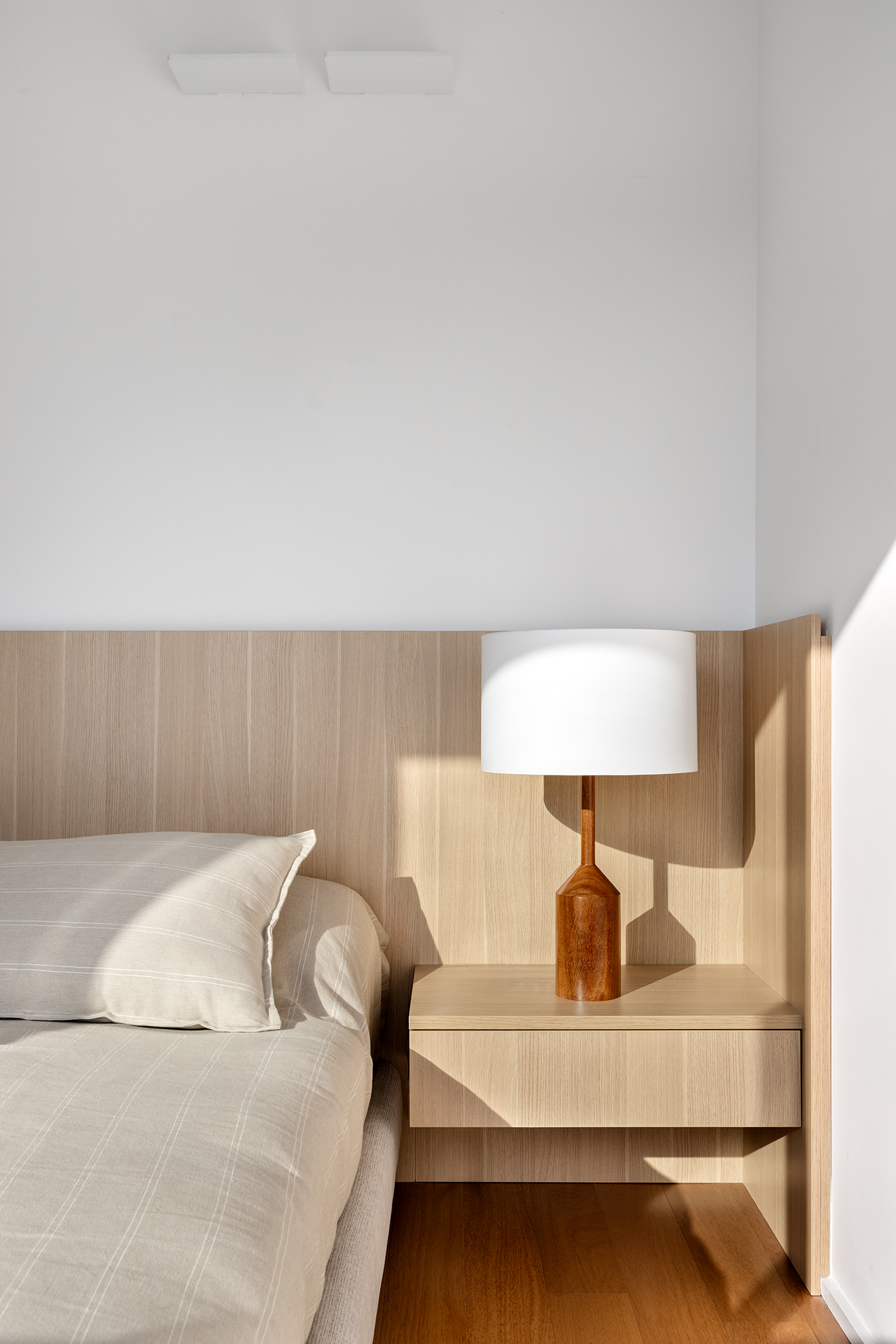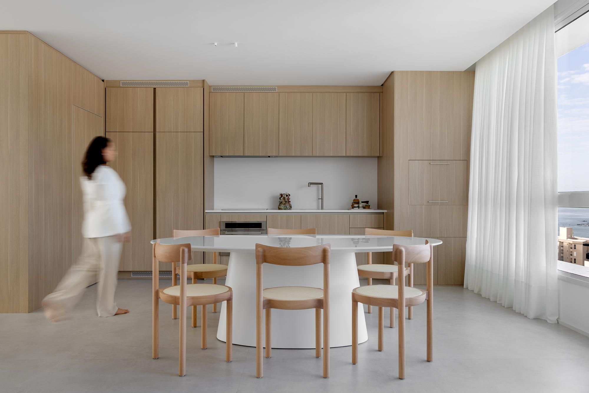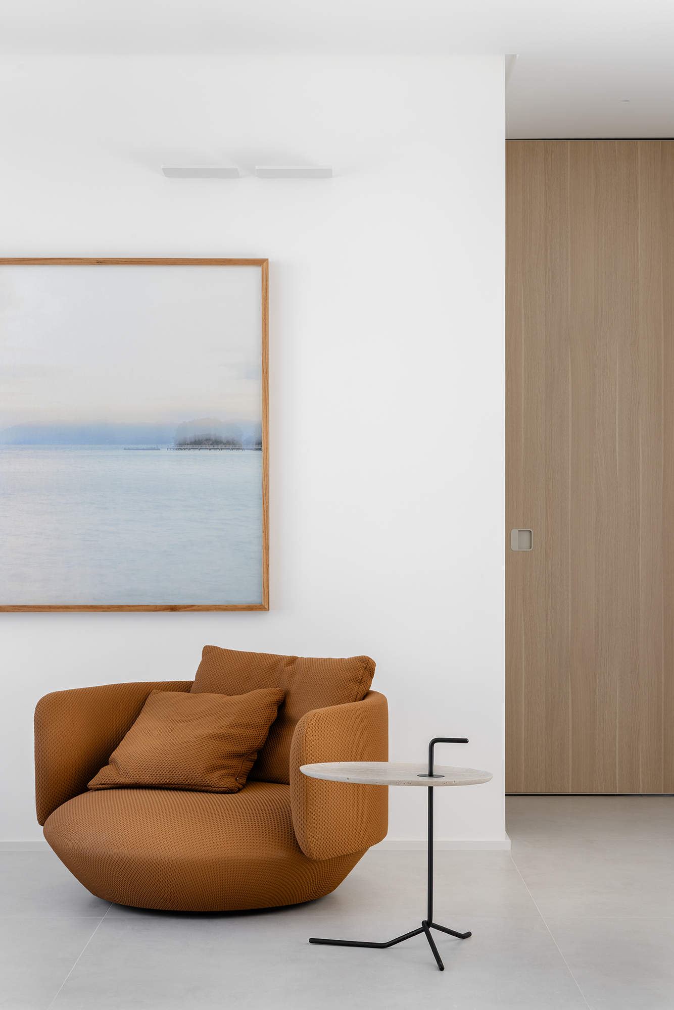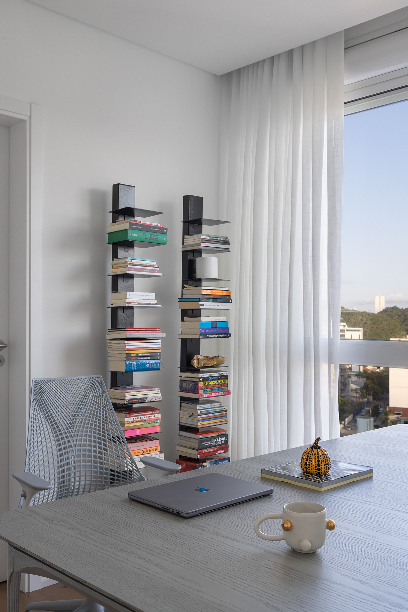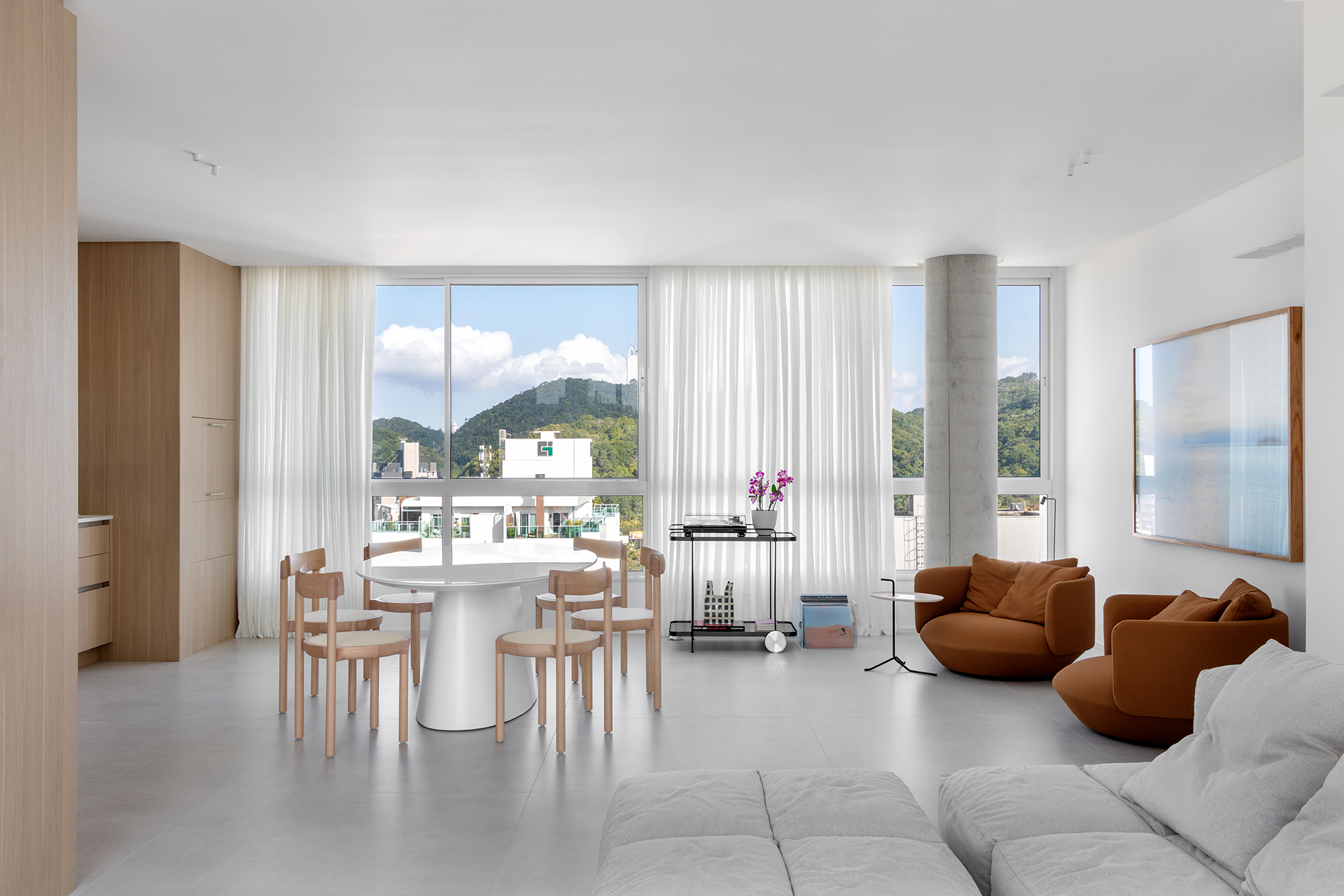 The Sea and the Beach as the greatest inspiration. An elegant simplicity. The chosen materials and textures play a supporting role, serving as a backdrop for the views that the large windows provide of the landscape. Wood and cement are important contrasts that bring depth to the composition. In this concept of an apartment where only the necessary enters, the curation of the furniture was designed to make sense. A highlight is the Banco Dominó by Claudia Moreira Salles, which welcomes those who enter, along with the composition on the Ballon table from Estudiobola. Complementing this composition is a replica of the art Sazanami by Heihachiro FUKUDA, brought by the owners from one of their trips to Japan. The armchairs in the living room are positioned so that, in addition to reading a book, the clients can admire the sea view and the hills of Praia Brava in Itajaí. The painting behind the armchairs is by the resident himself, who is a photographer. It's called Naoshima Dream. A project designed for rest, contemplation, and especially for a lighter life.