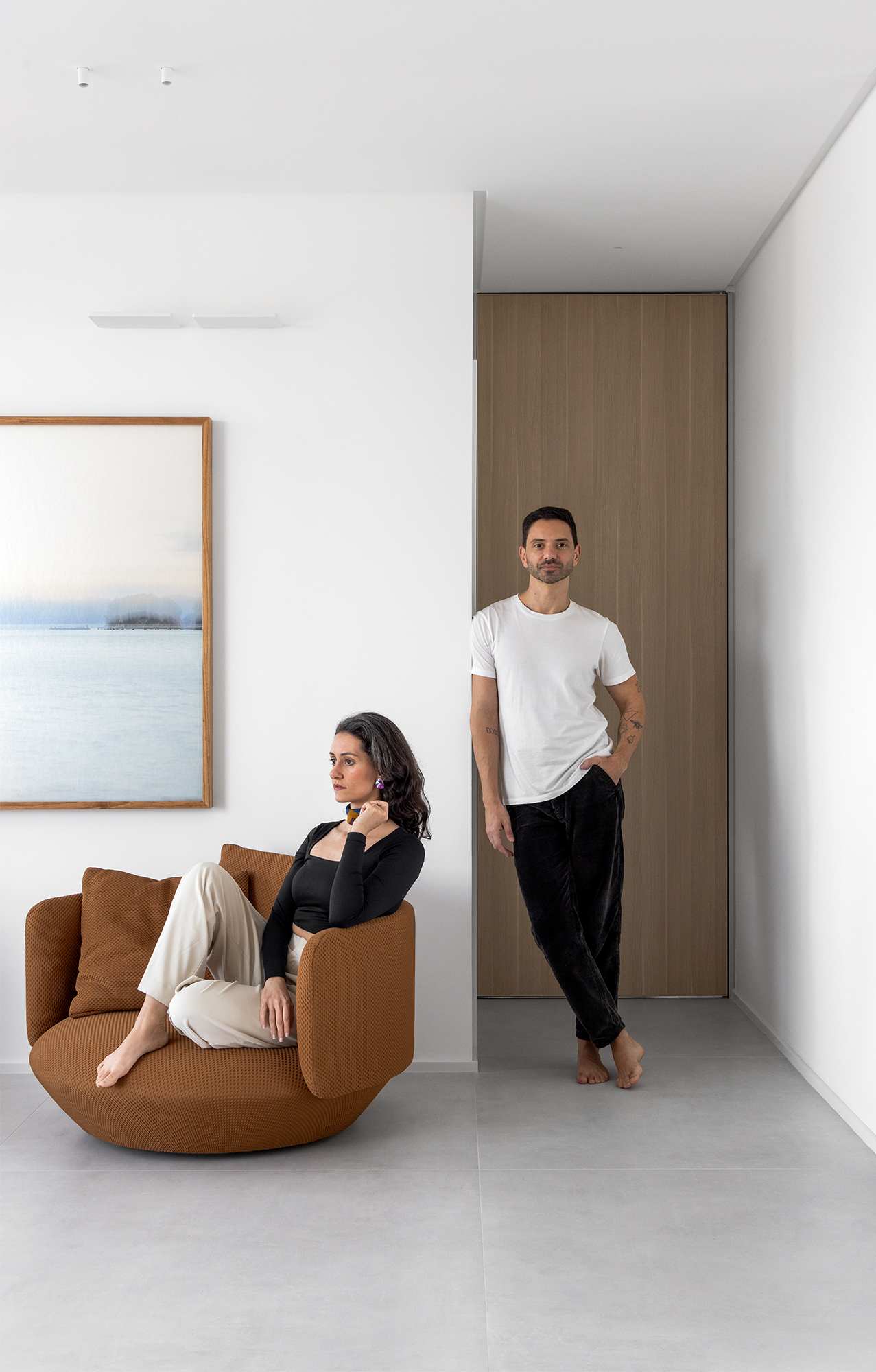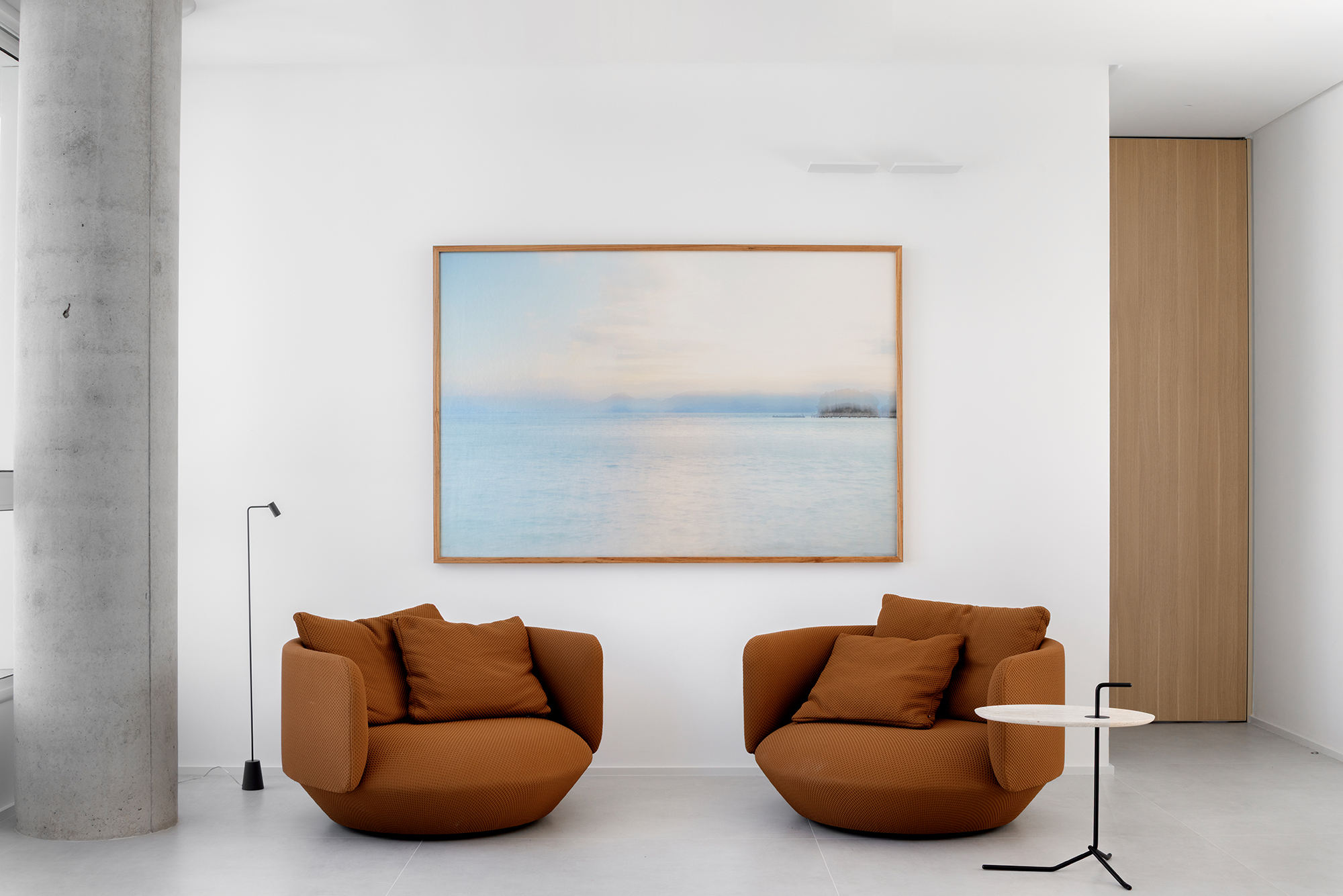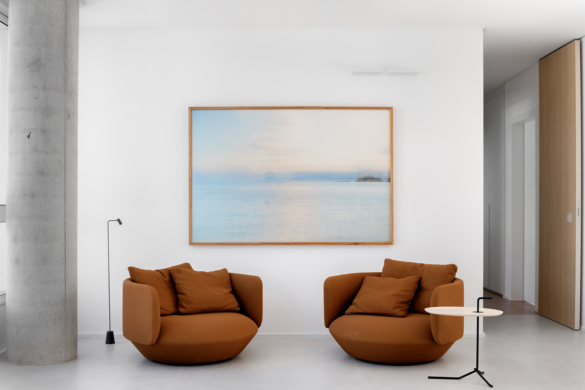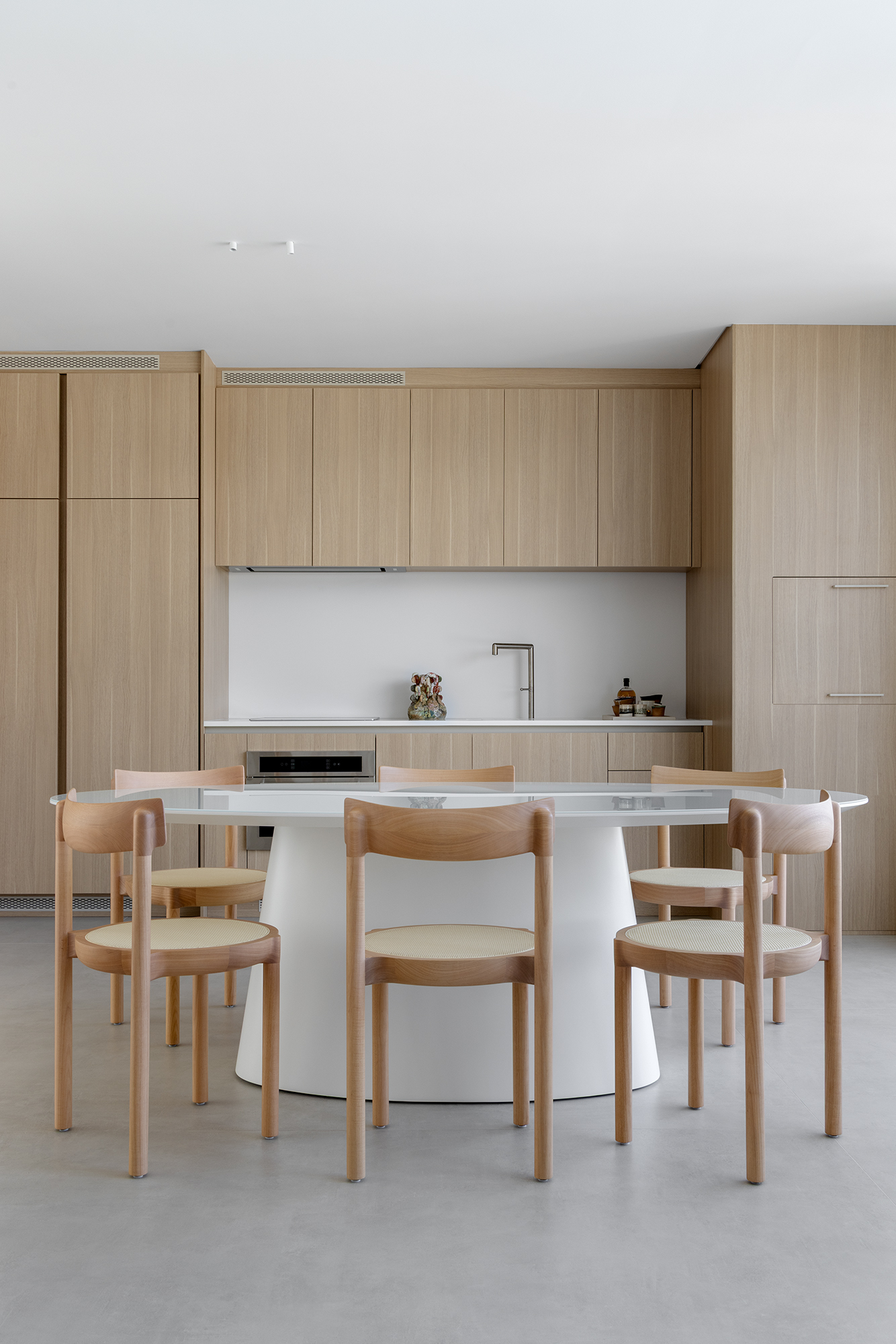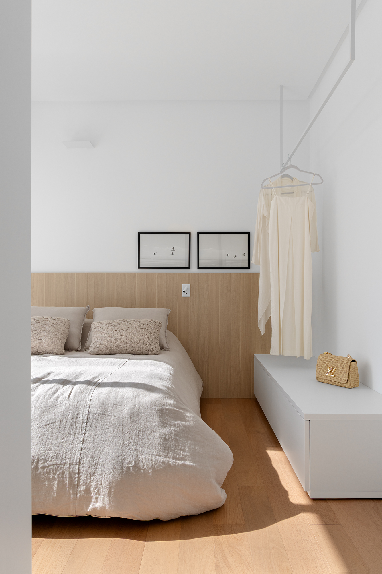 The Sea and the Beach as the greatest inspiration. An elegant simplicity. The chosen materials and textures play a supporting role, serving as a backdrop for the views that the large windows provide of the landscape. Wood and cement are important contrasts that bring depth to the composition. In this concept of an apartment where only the necessary enters, the curation of the furniture was designed to make sense. A highlight is the Banco Dominó by Claudia Moreira Salles, which welcomes those who enter, along with the composition on the Ballon table from Estudiobola. Complementing this composition is a replica of the art Sazanami by Heihachiro FUKUDA, brought by the owners from one of their trips to Japan. The armchairs in the living room are positioned so that, in addition to reading a book, the clients can admire the sea view and the hills of Praia Brava in Itajaí. The painting behind the armchairs is by the resident himself, who is a photographer. It's called Naoshima Dream. A project designed for rest, contemplation, and especially for a lighter life.