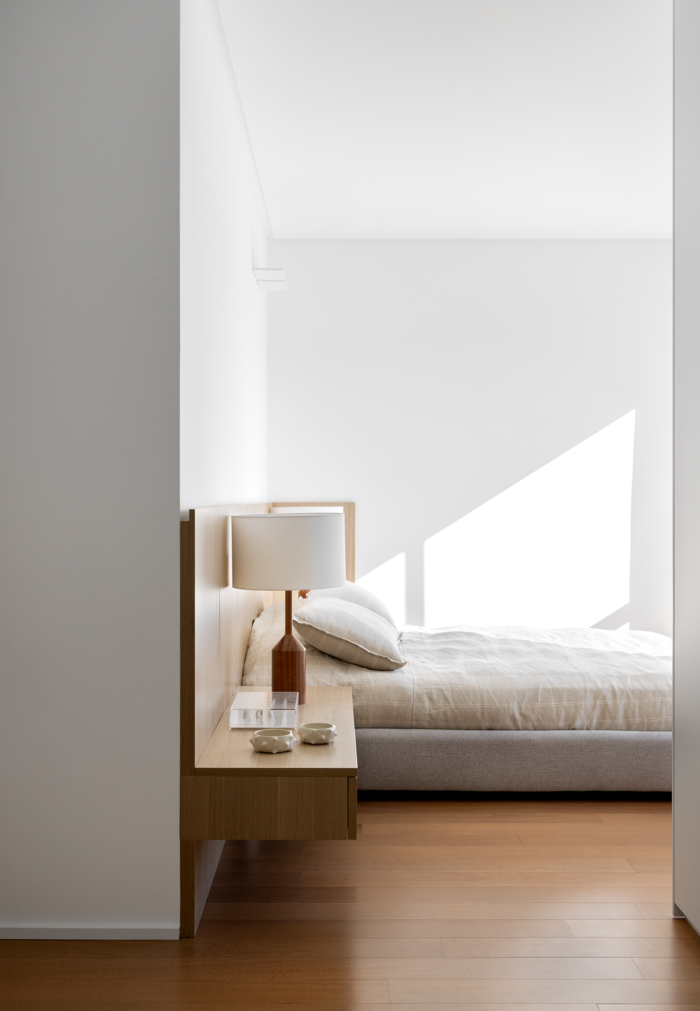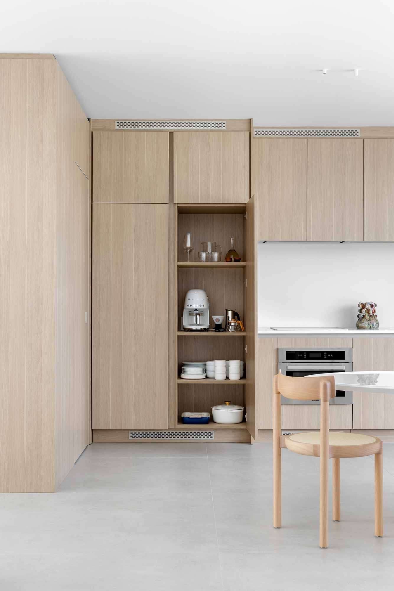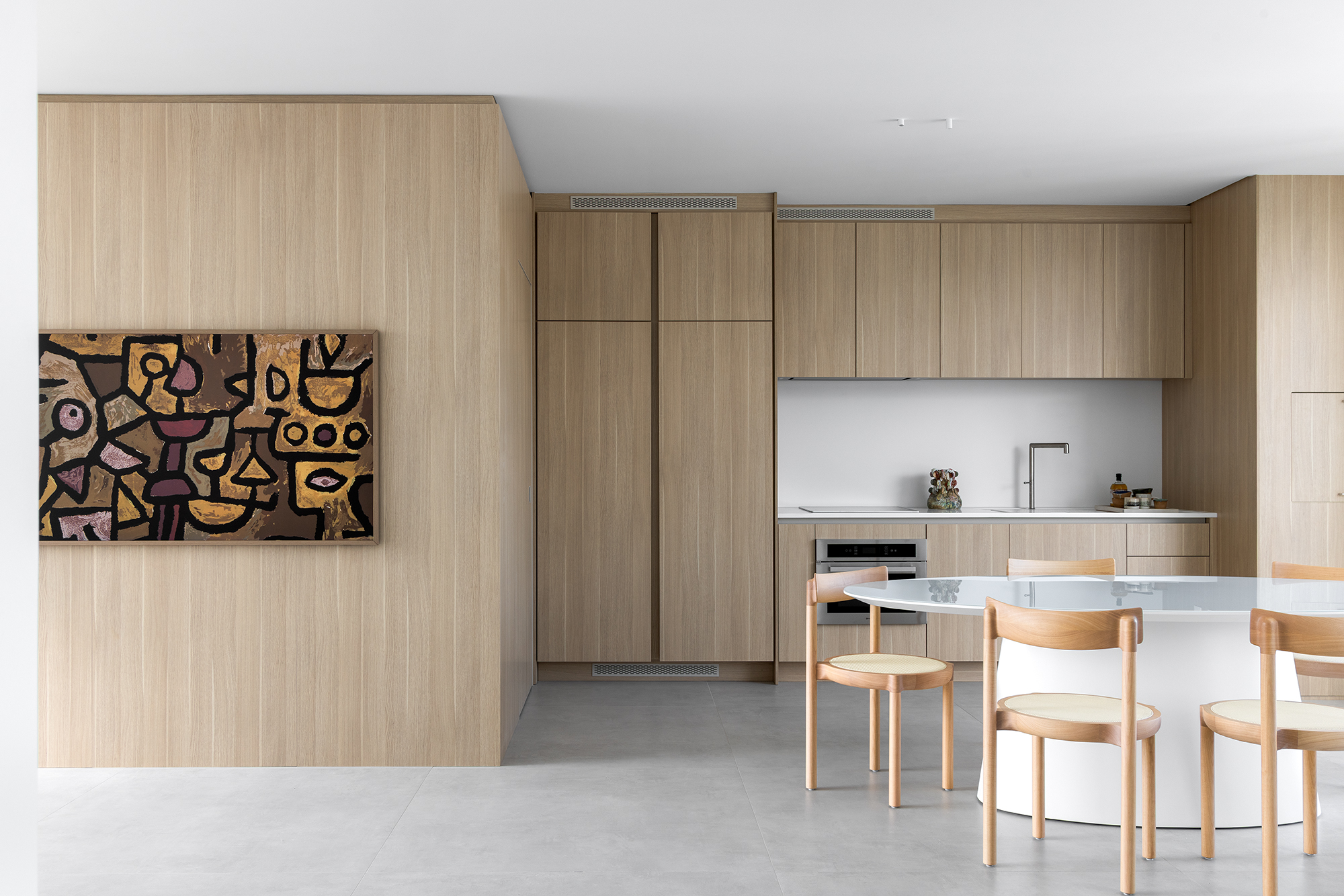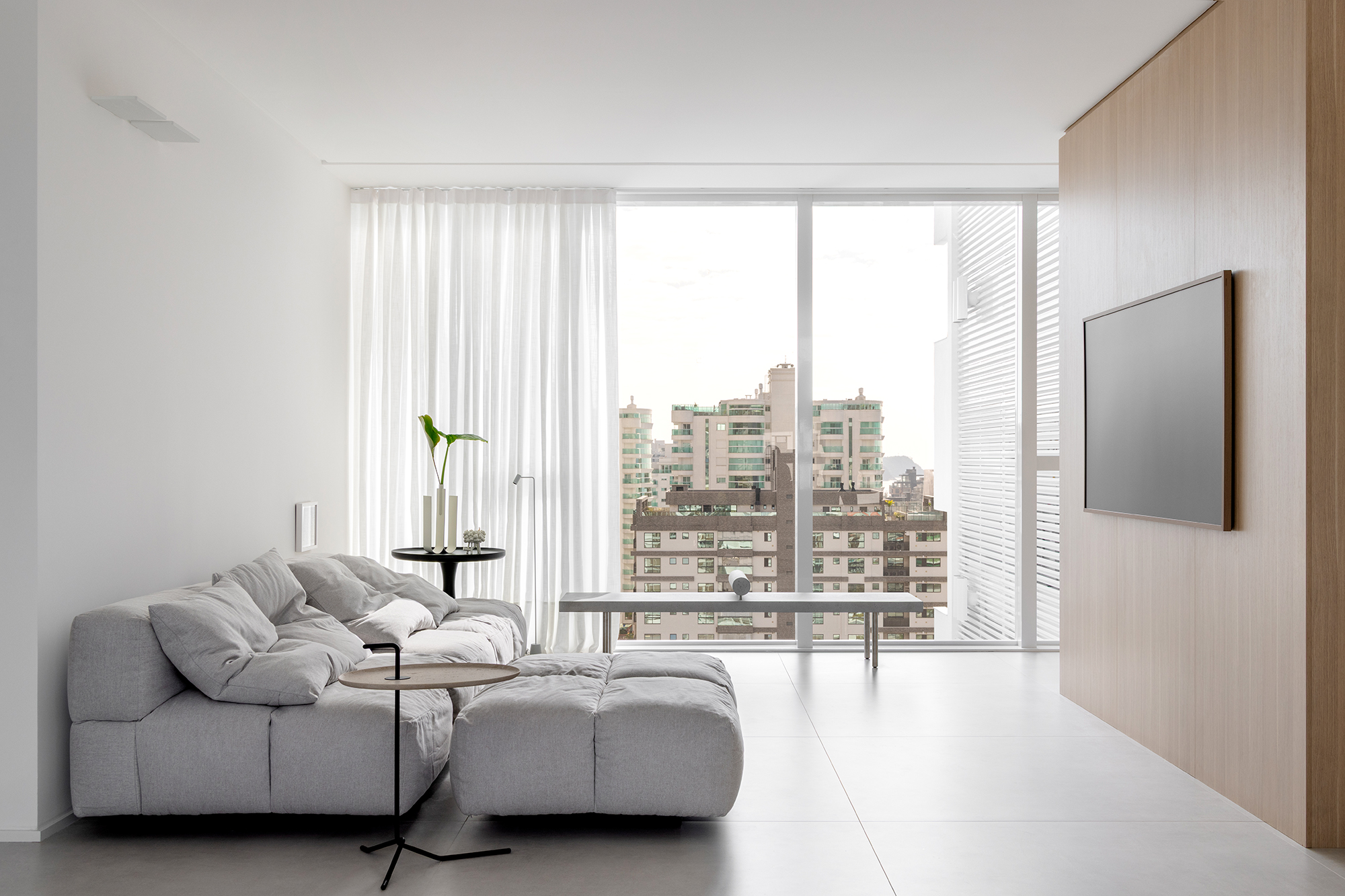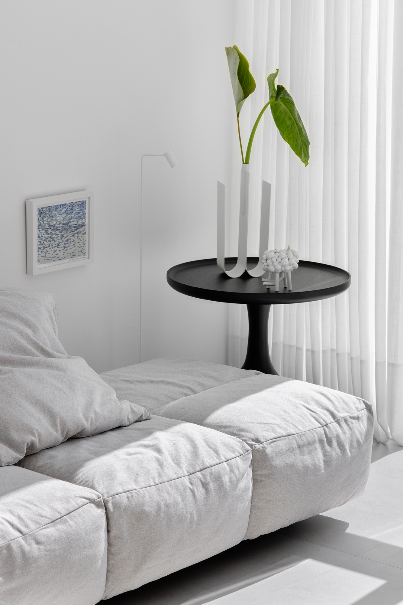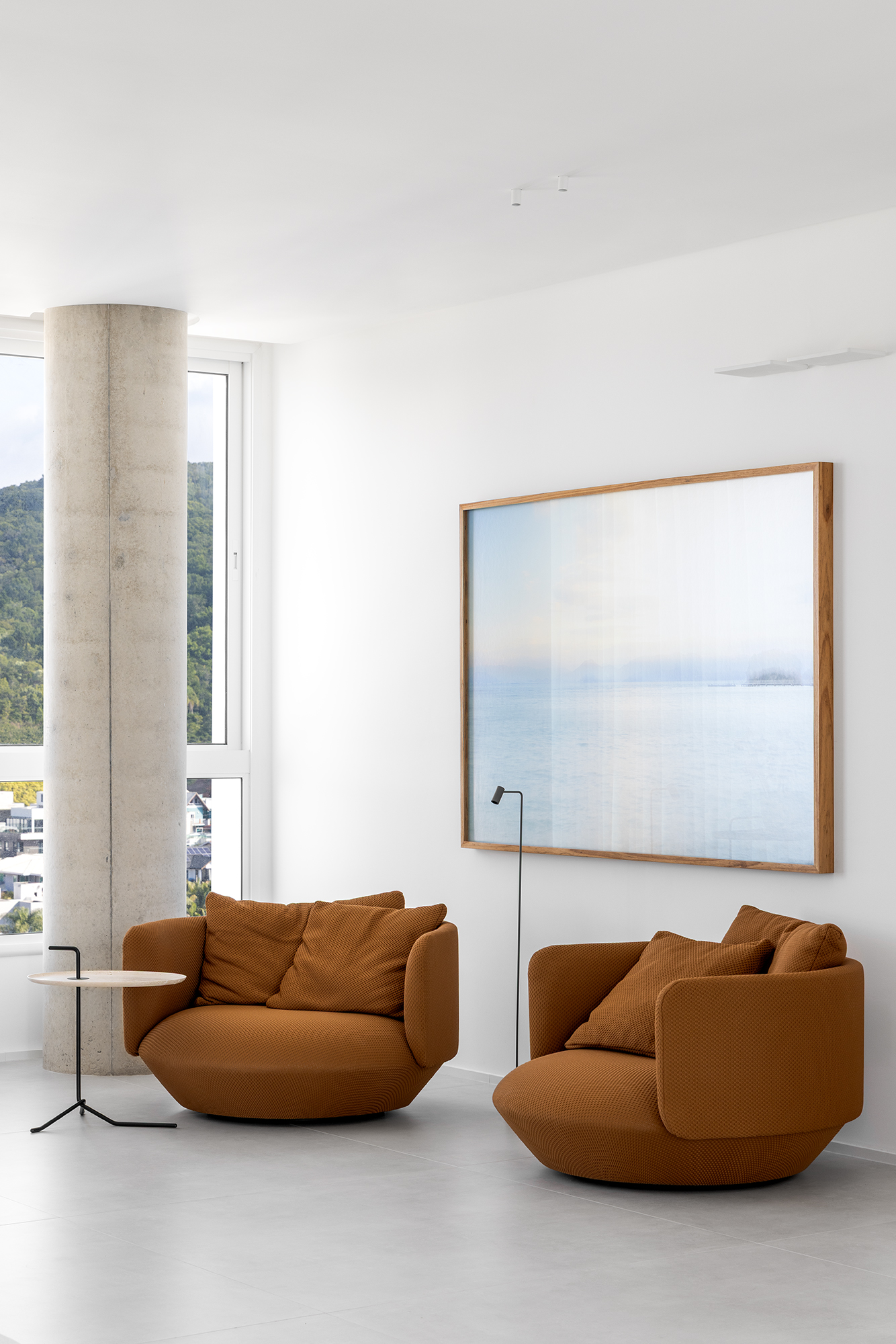 The Sea and the Beach as the greatest inspiration. An elegant simplicity. The chosen materials and textures play a supporting role, serving as a backdrop for the views that the large windows provide of the landscape. Wood and cement are important contrasts that bring depth to the composition. In this concept of an apartment where only the necessary enters, the curation of the furniture was designed to make sense. A highlight is the Banco Dominó by Claudia Moreira Salles, which welcomes those who enter, along with the composition on the Ballon table from Estudiobola. Complementing this composition is a replica of the art Sazanami by Heihachiro FUKUDA, brought by the owners from one of their trips to Japan. The armchairs in the living room are positioned so that, in addition to reading a book, the clients can admire the sea view and the hills of Praia Brava in Itajaí. The painting behind the armchairs is by the resident himself, who is a photographer. It's called Naoshima Dream. A project designed for rest, contemplation, and especially for a lighter life.