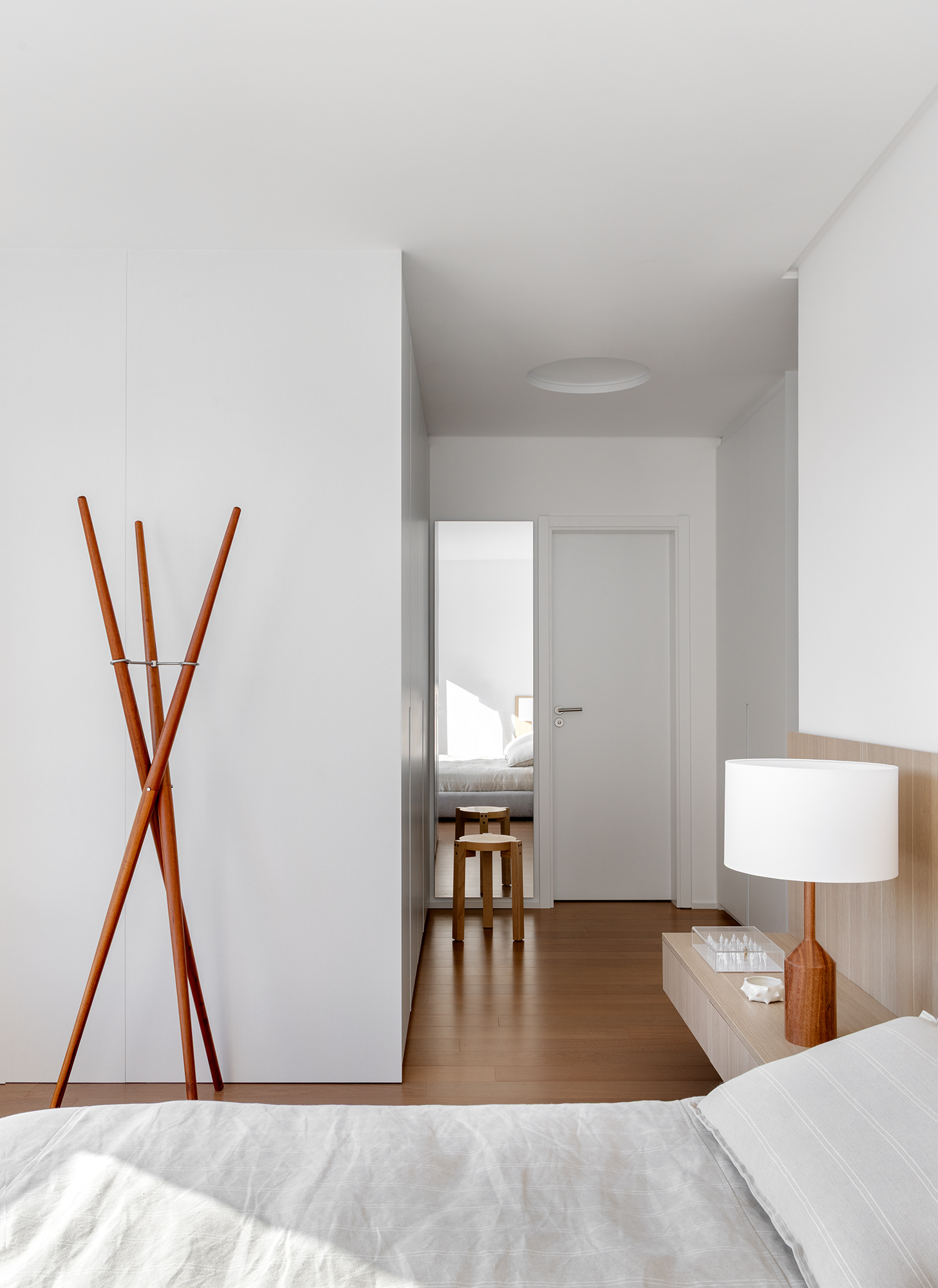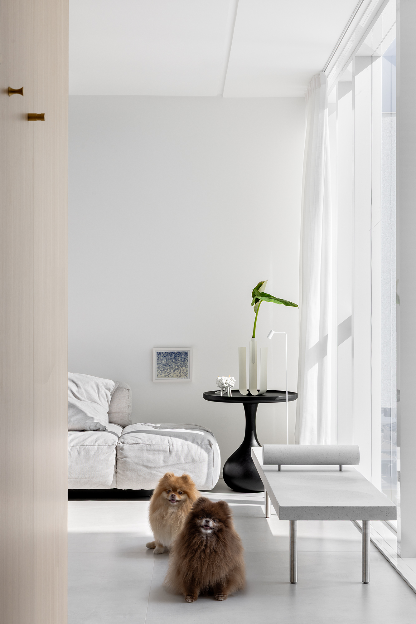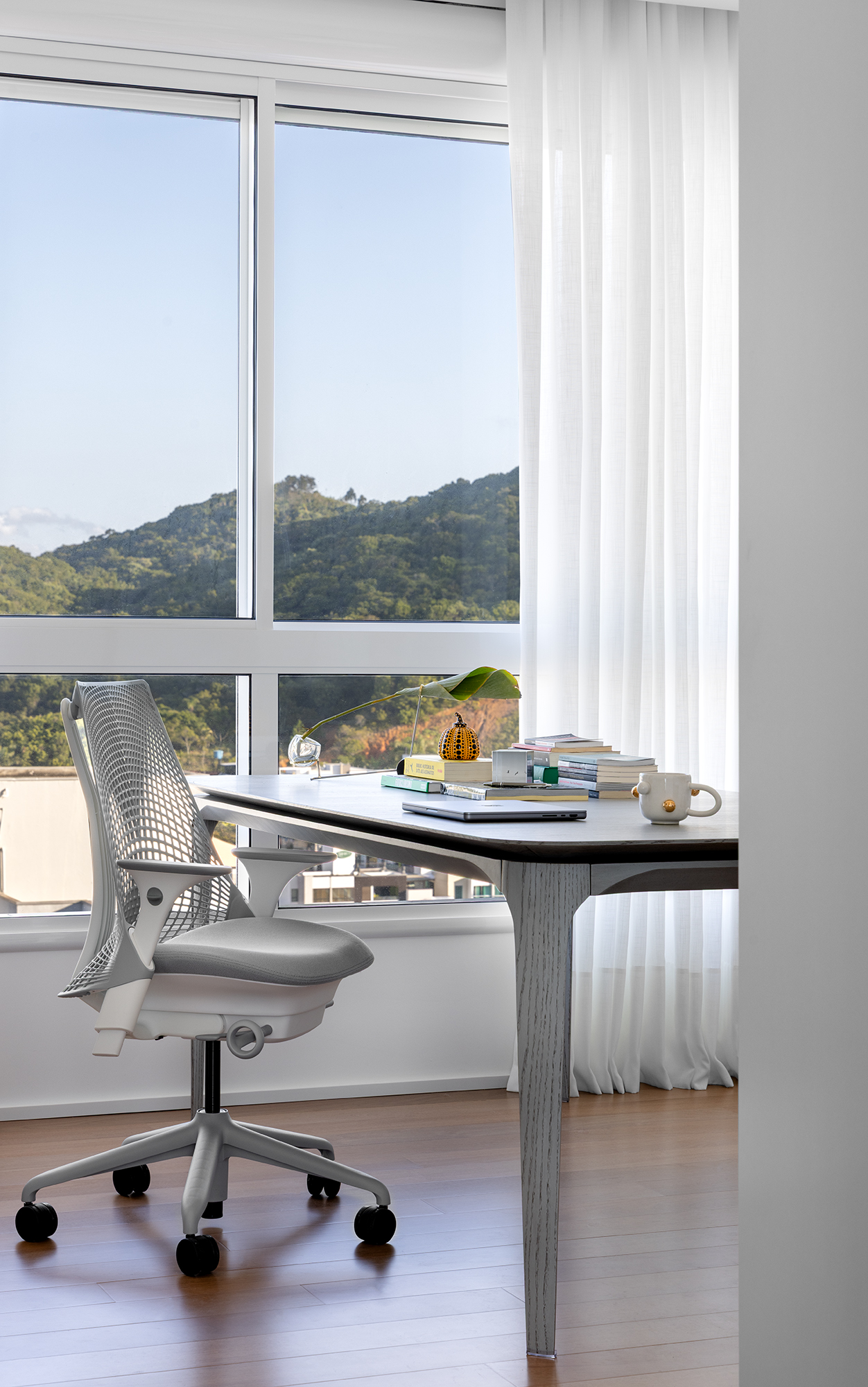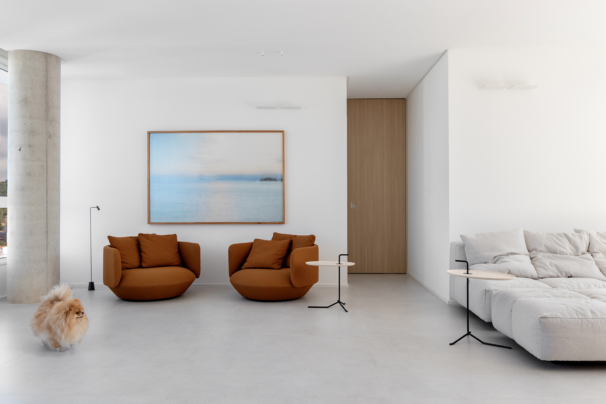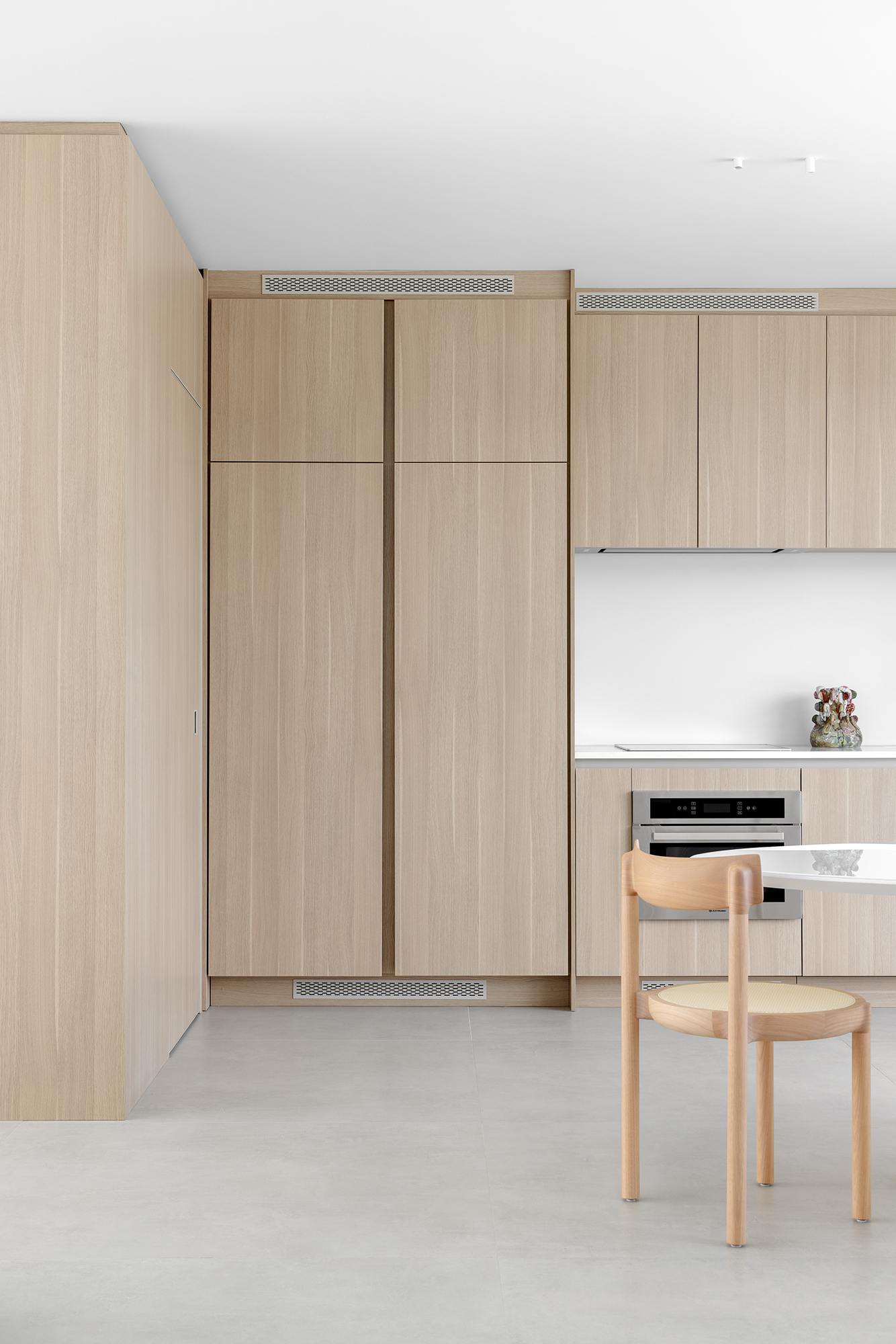 The Sea and the Beach as the greatest inspiration. An elegant simplicity. The chosen materials and textures play a supporting role, serving as a backdrop for the views that the large windows provide of the landscape. Wood and cement are important contrasts that bring depth to the composition. In this concept of an apartment where only the necessary enters, the curation of the furniture was designed to make sense. A highlight is the Banco Dominó by Claudia Moreira Salles, which welcomes those who enter, along with the composition on the Ballon table from Estudiobola. Complementing this composition is a replica of the art Sazanami by Heihachiro FUKUDA, brought by the owners from one of their trips to Japan. The armchairs in the living room are positioned so that, in addition to reading a book, the clients can admire the sea view and the hills of Praia Brava in Itajaí. The painting behind the armchairs is by the resident himself, who is a photographer. It's called Naoshima Dream. A project designed for rest, contemplation, and especially for a lighter life.