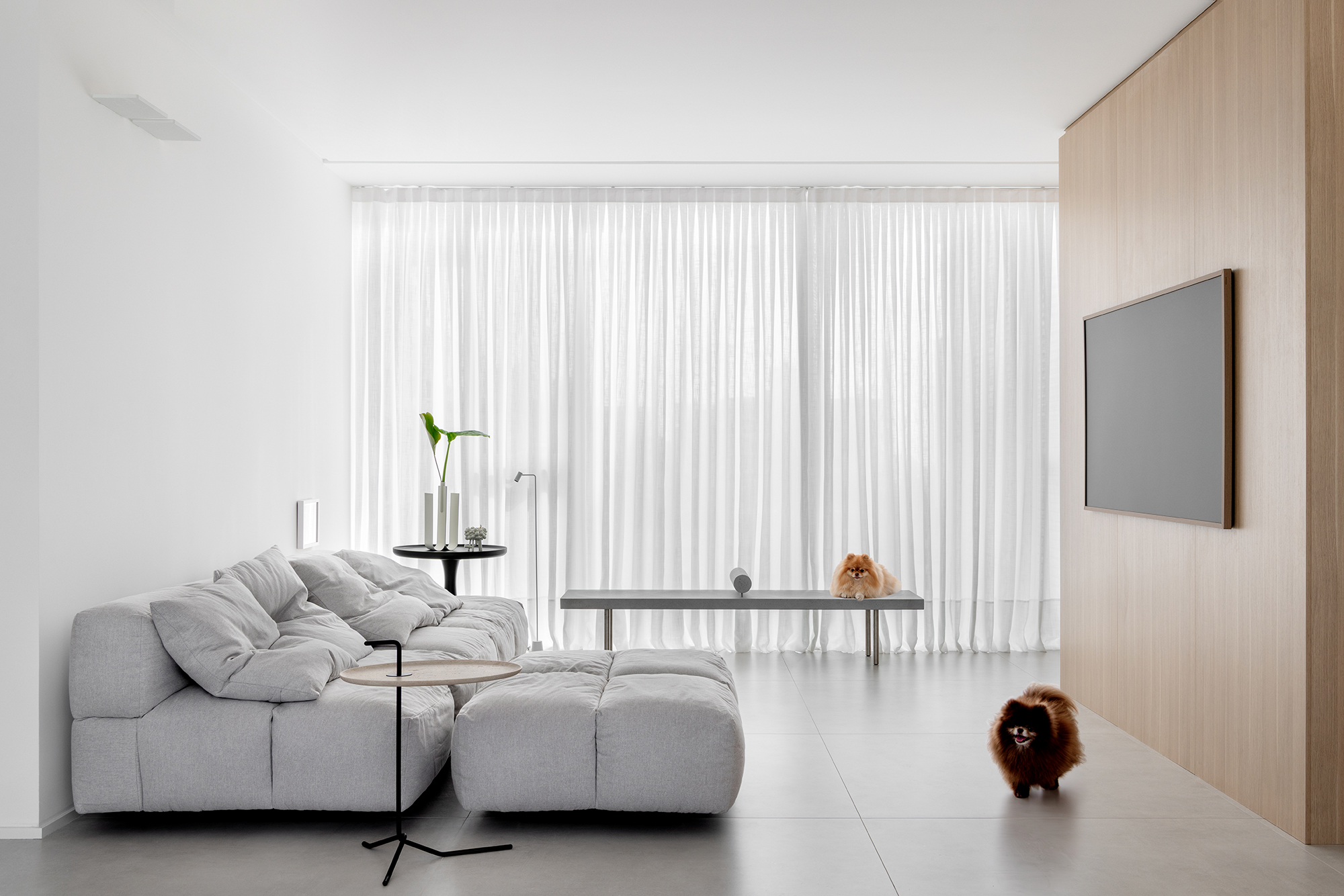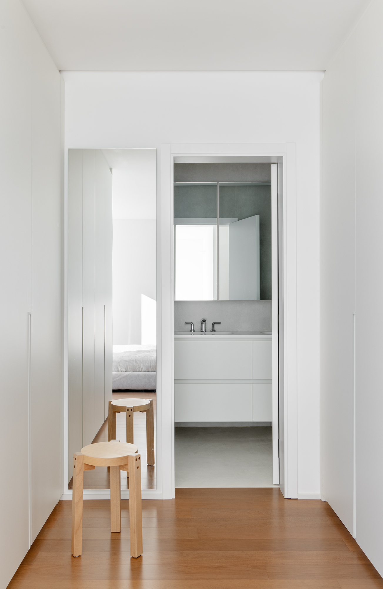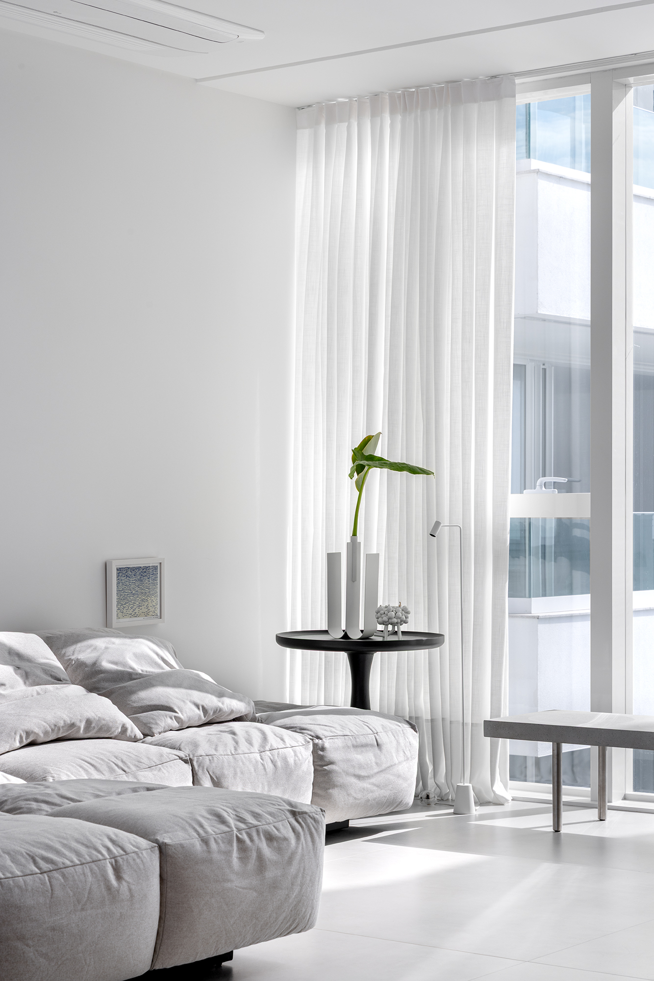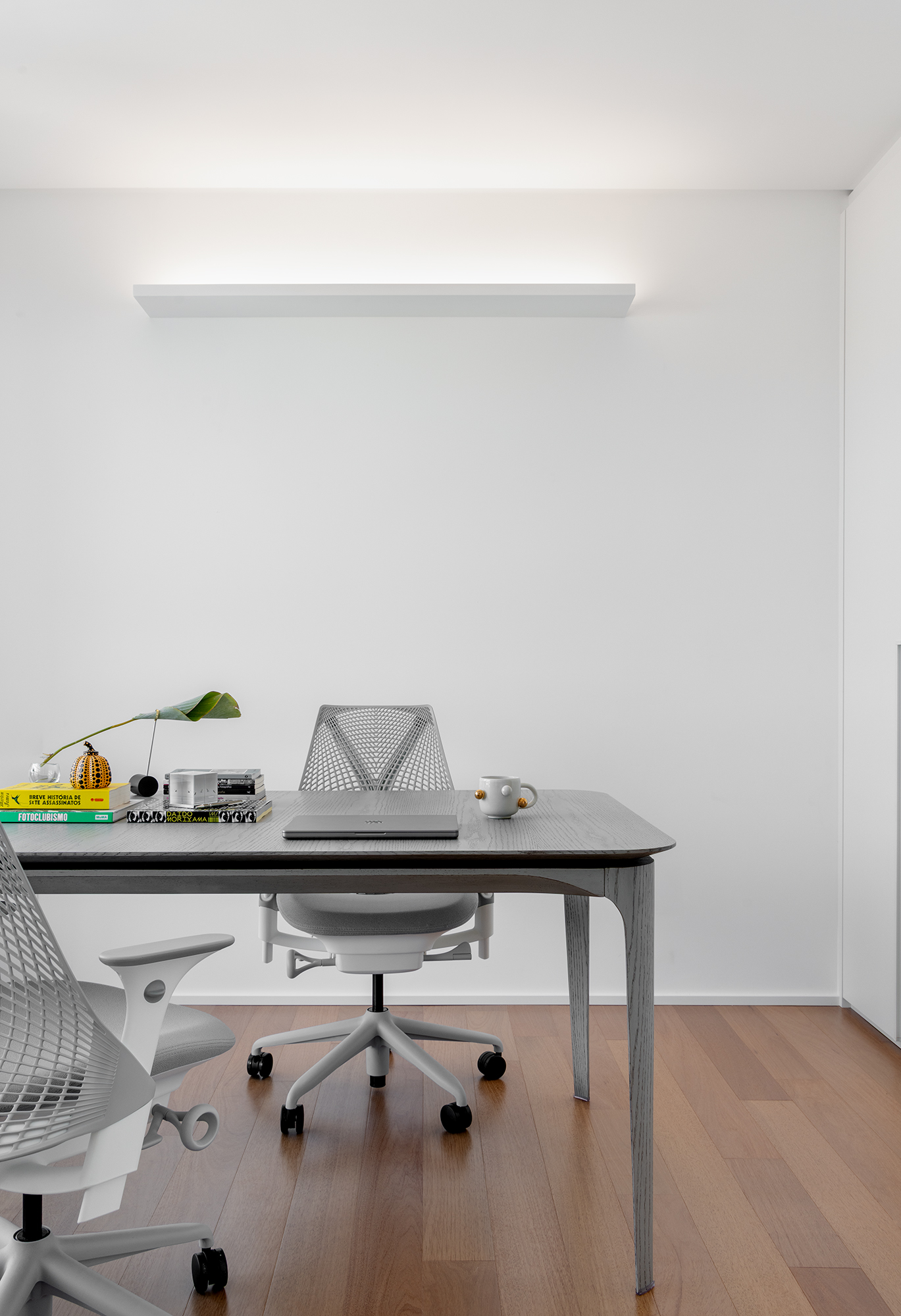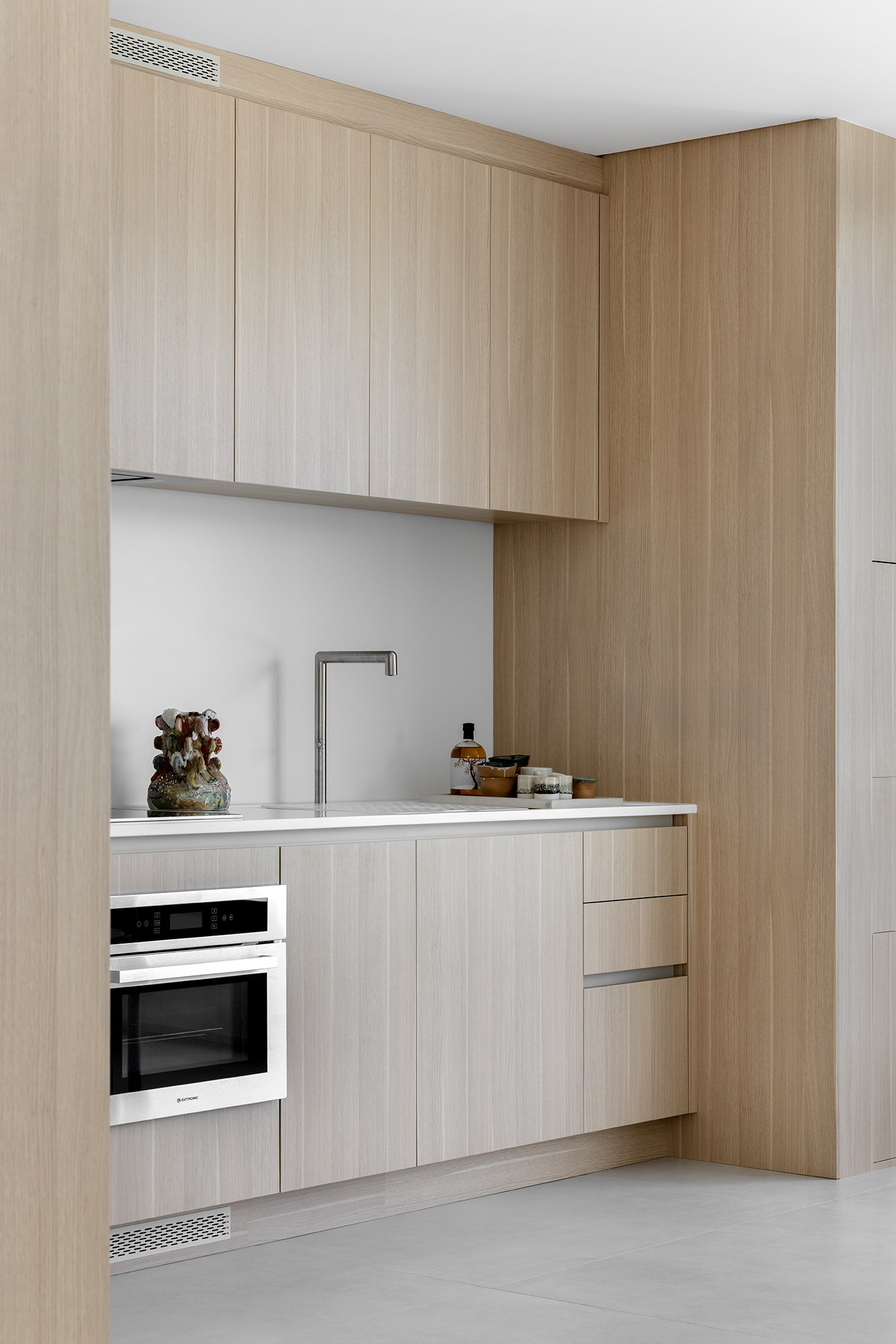 The Sea and the Beach as the greatest inspiration. An elegant simplicity. The chosen materials and textures play a supporting role, serving as a backdrop for the views that the large windows provide of the landscape. Wood and cement are important contrasts that bring depth to the composition. In this concept of an apartment where only the necessary enters, the curation of the furniture was designed to make sense. A highlight is the Banco Dominó by Claudia Moreira Salles, which welcomes those who enter, along with the composition on the Ballon table from Estudiobola. Complementing this composition is a replica of the art Sazanami by Heihachiro FUKUDA, brought by the owners from one of their trips to Japan. The armchairs in the living room are positioned so that, in addition to reading a book, the clients can admire the sea view and the hills of Praia Brava in Itajaí. The painting behind the armchairs is by the resident himself, who is a photographer. It's called Naoshima Dream. A project designed for rest, contemplation, and especially for a lighter life.