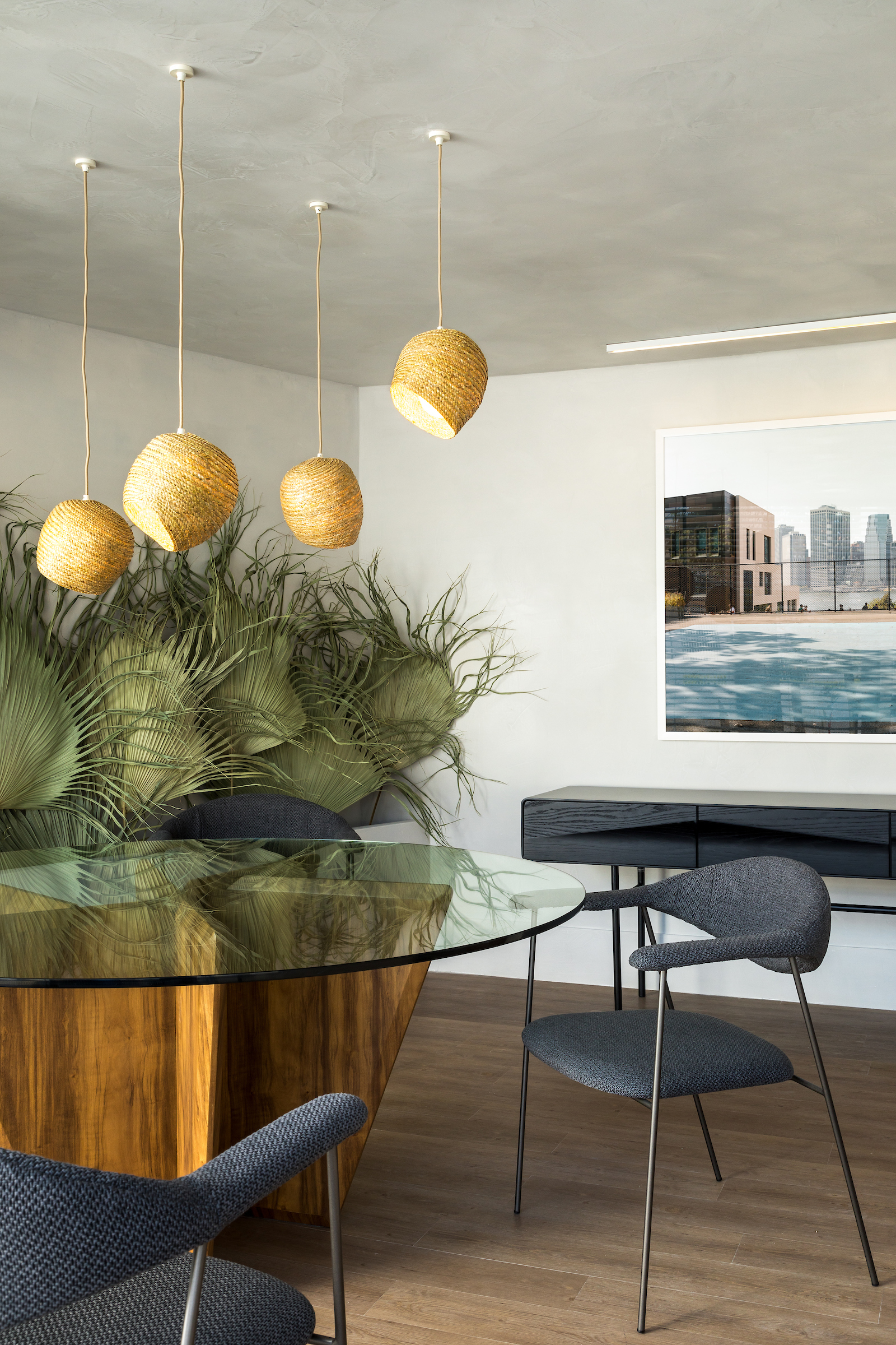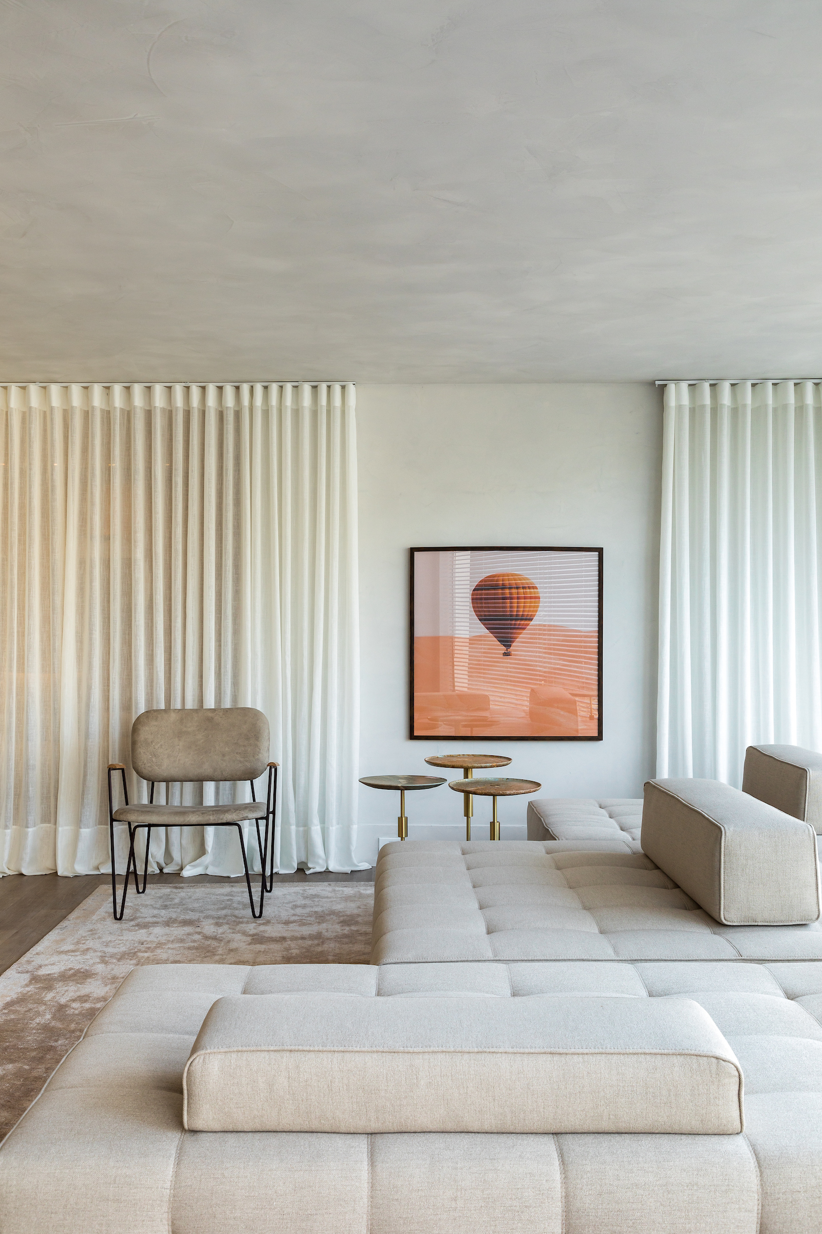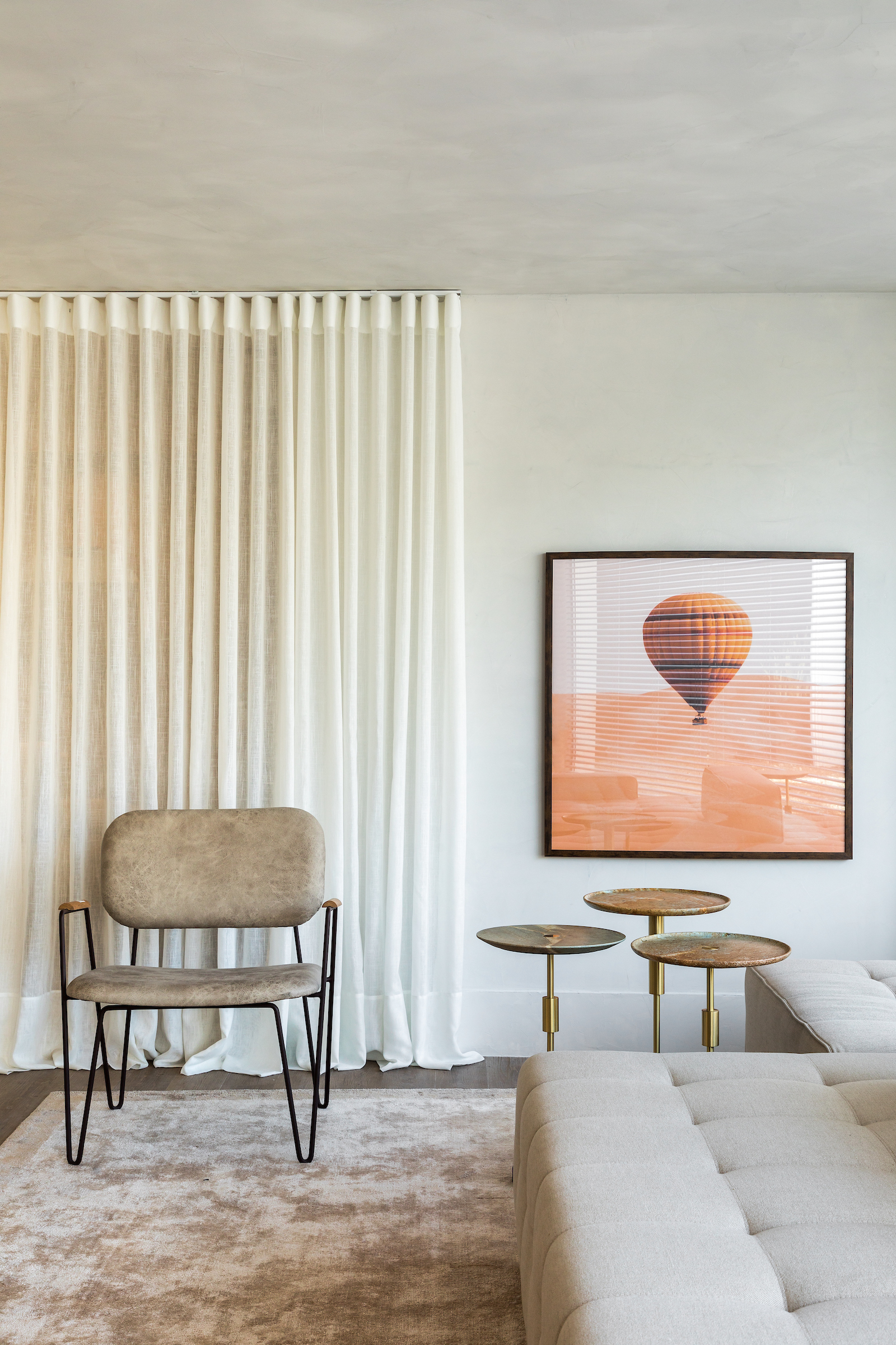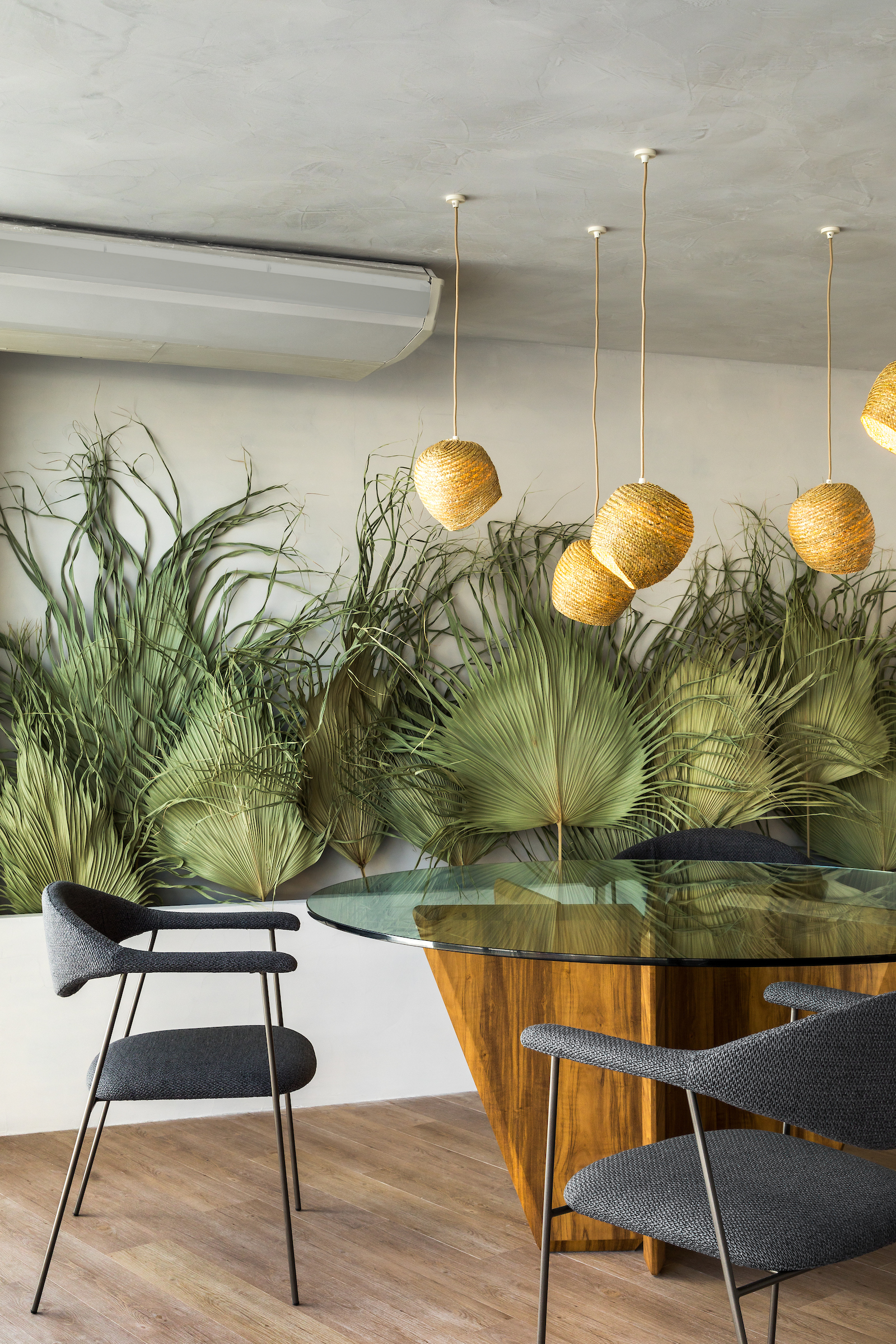 Inspired by a Moroccan breeze, the room has a light, delicate and balanced mood. The concept bridges the gap between traditional and contemporary, harmoniously mixing some subtle elements. Amid the monochromatic ceiling and walls, provided by the reference of the Tadelakt-style texture – a construction technique used in Morocco – the earthy tones break the monotony of the palette. The enhancement of the vegetation with dried palm leaf, added to the wood floor, the brazilian stone top tables and the straw pendants gives a natural touch to the scene.