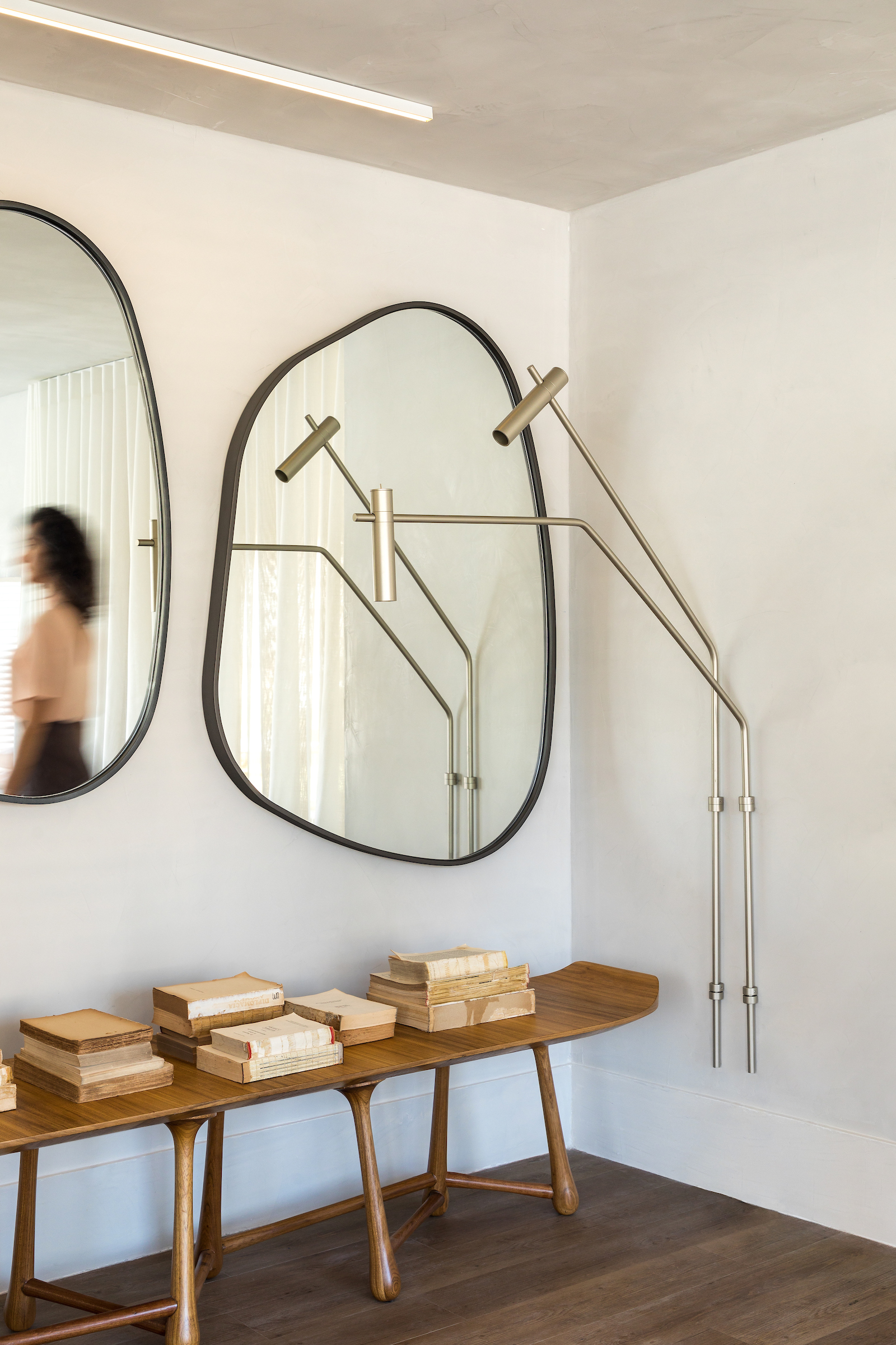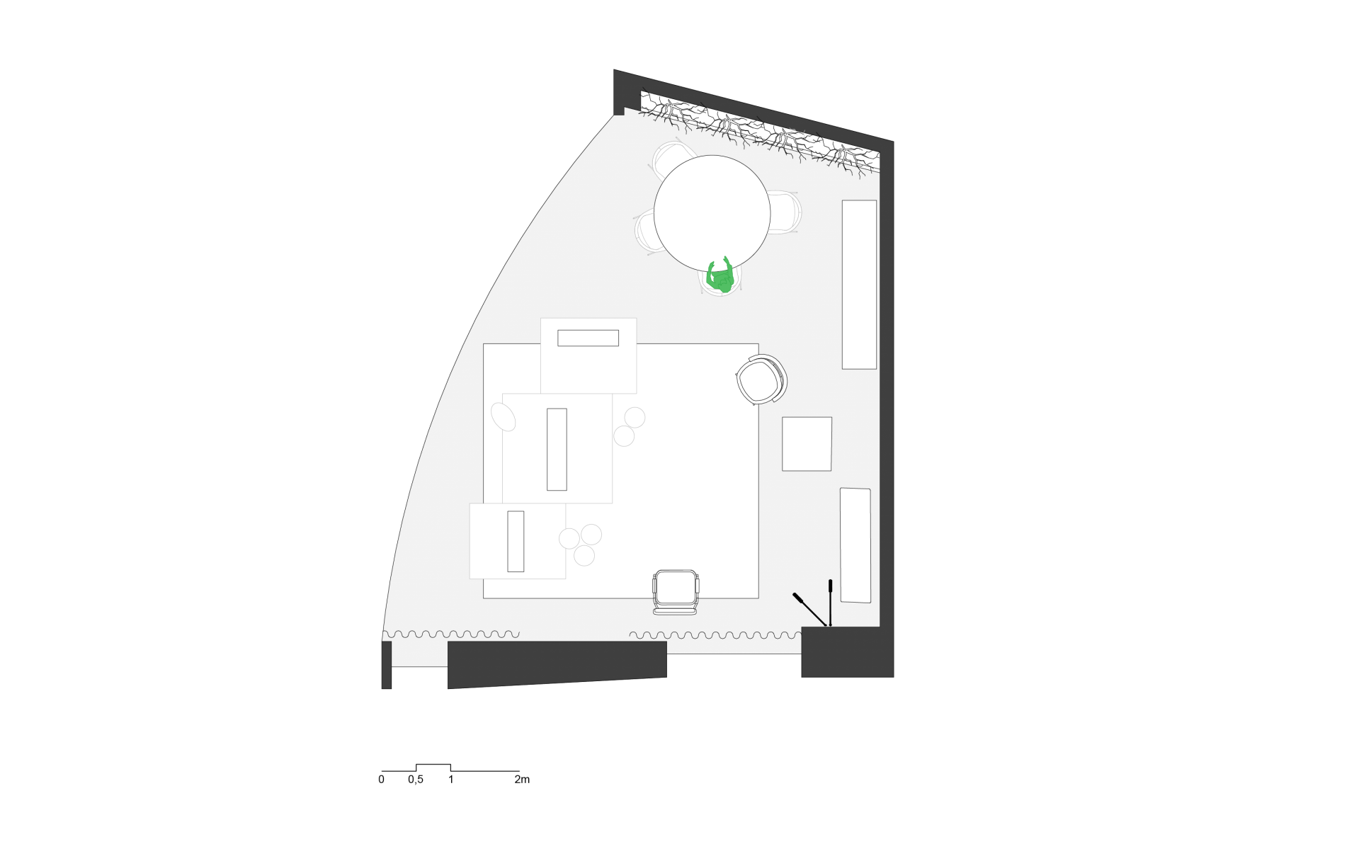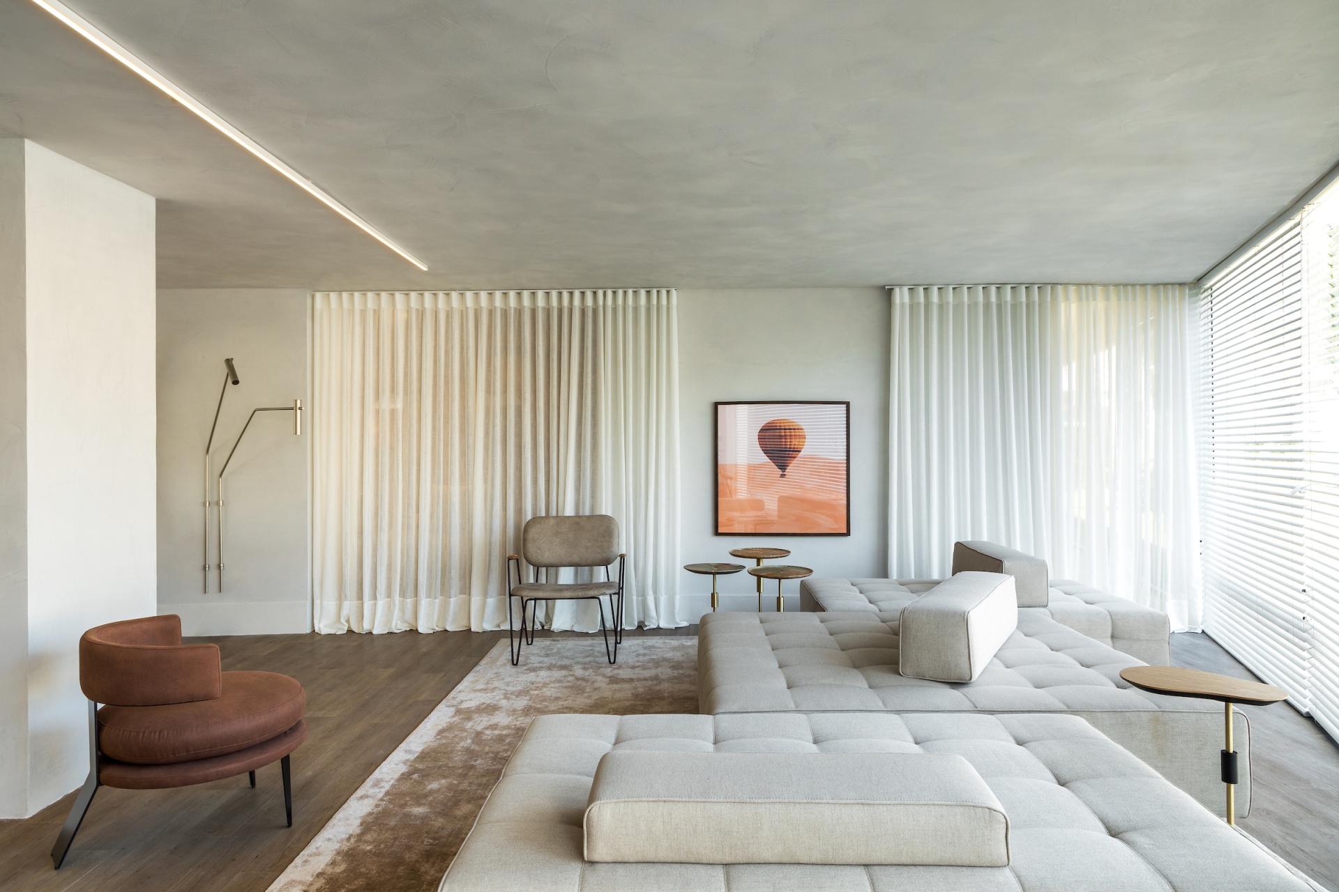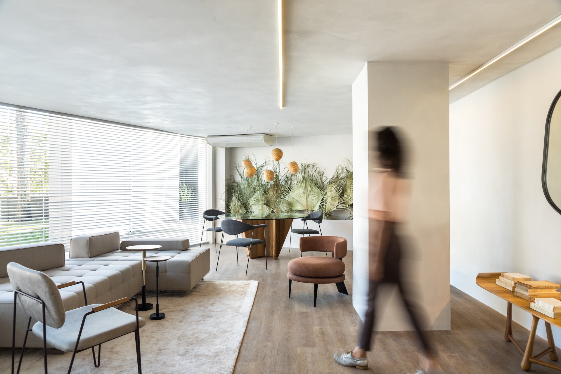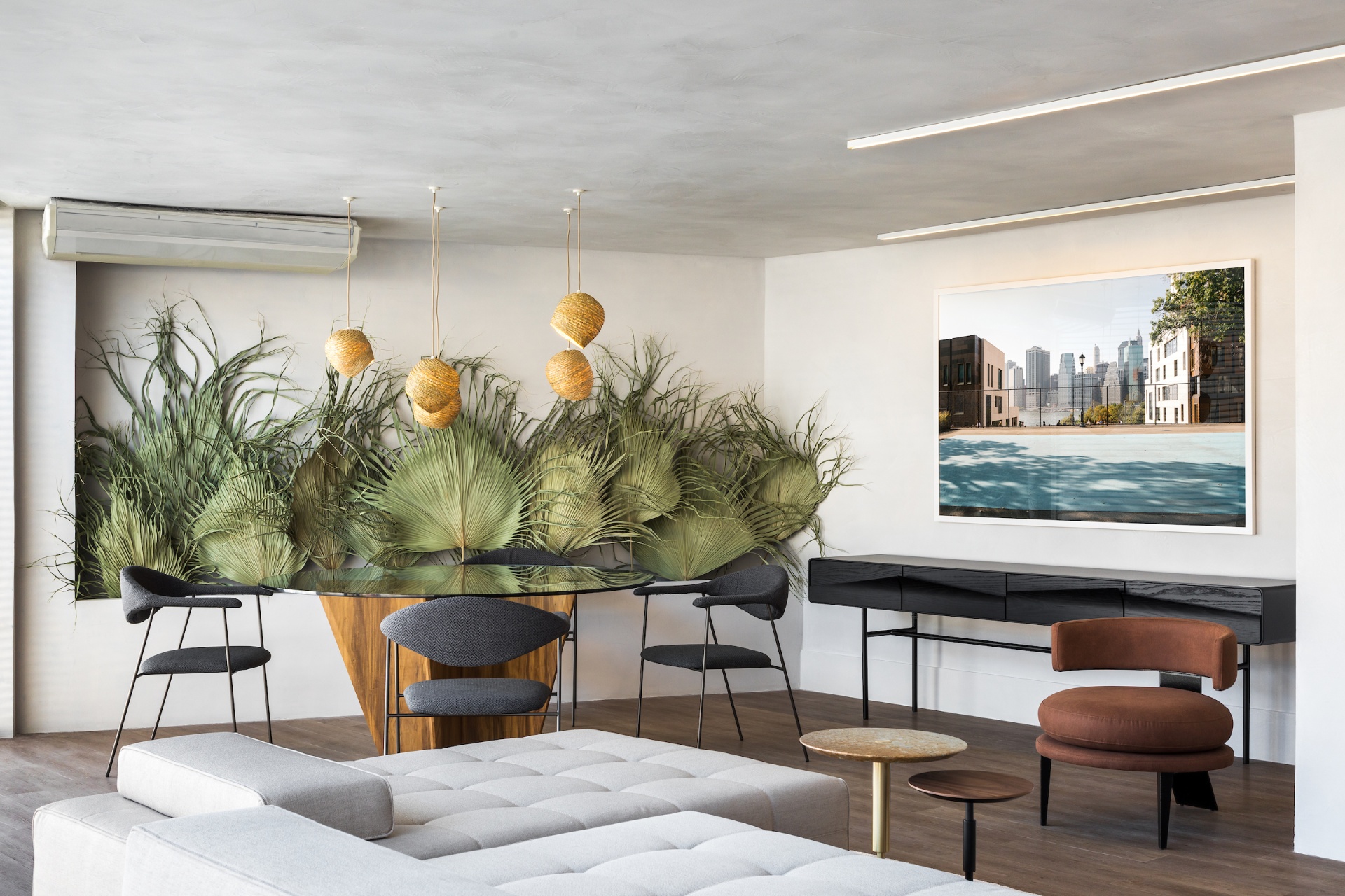 Inspired by a Moroccan breeze, the room has a light, delicate and balanced mood. The concept bridges the gap between traditional and contemporary, harmoniously mixing some subtle elements. Amid the monochromatic ceiling and walls, provided by the reference of the Tadelakt-style texture – a construction technique used in Morocco – the earthy tones break the monotony of the palette. The enhancement of the vegetation with dried palm leaf, added to the wood floor, the brazilian stone top tables and the straw pendants gives a natural touch to the scene.