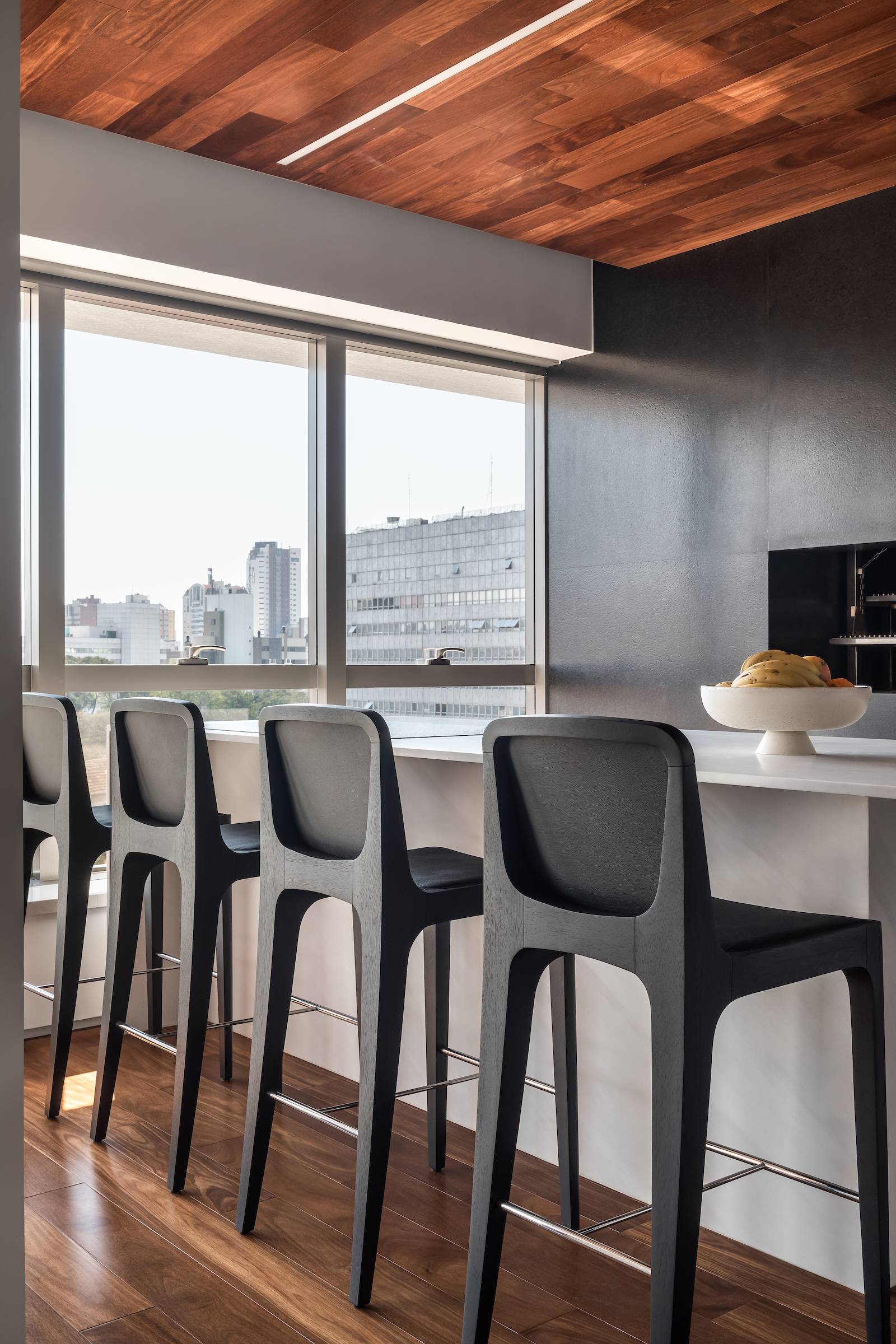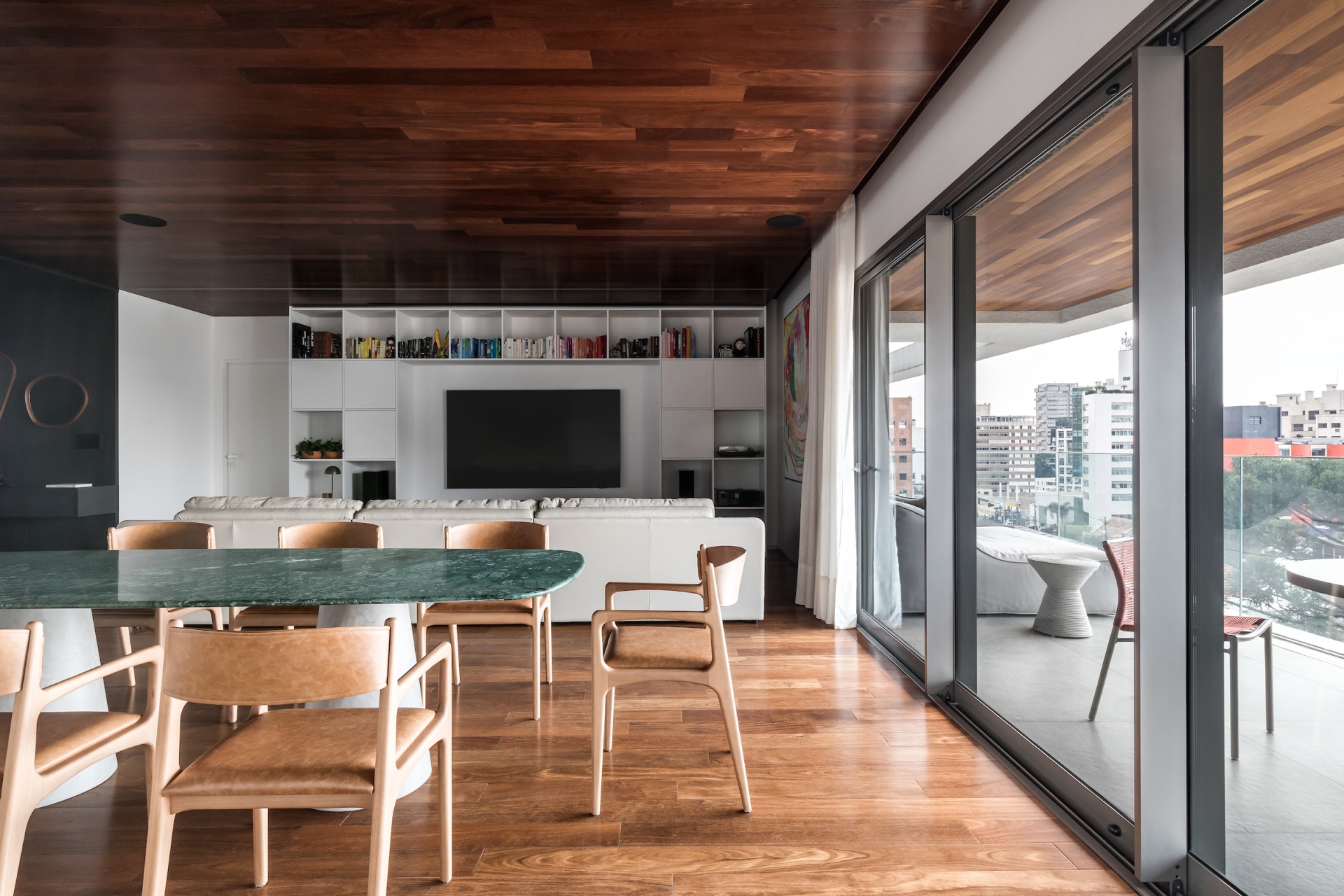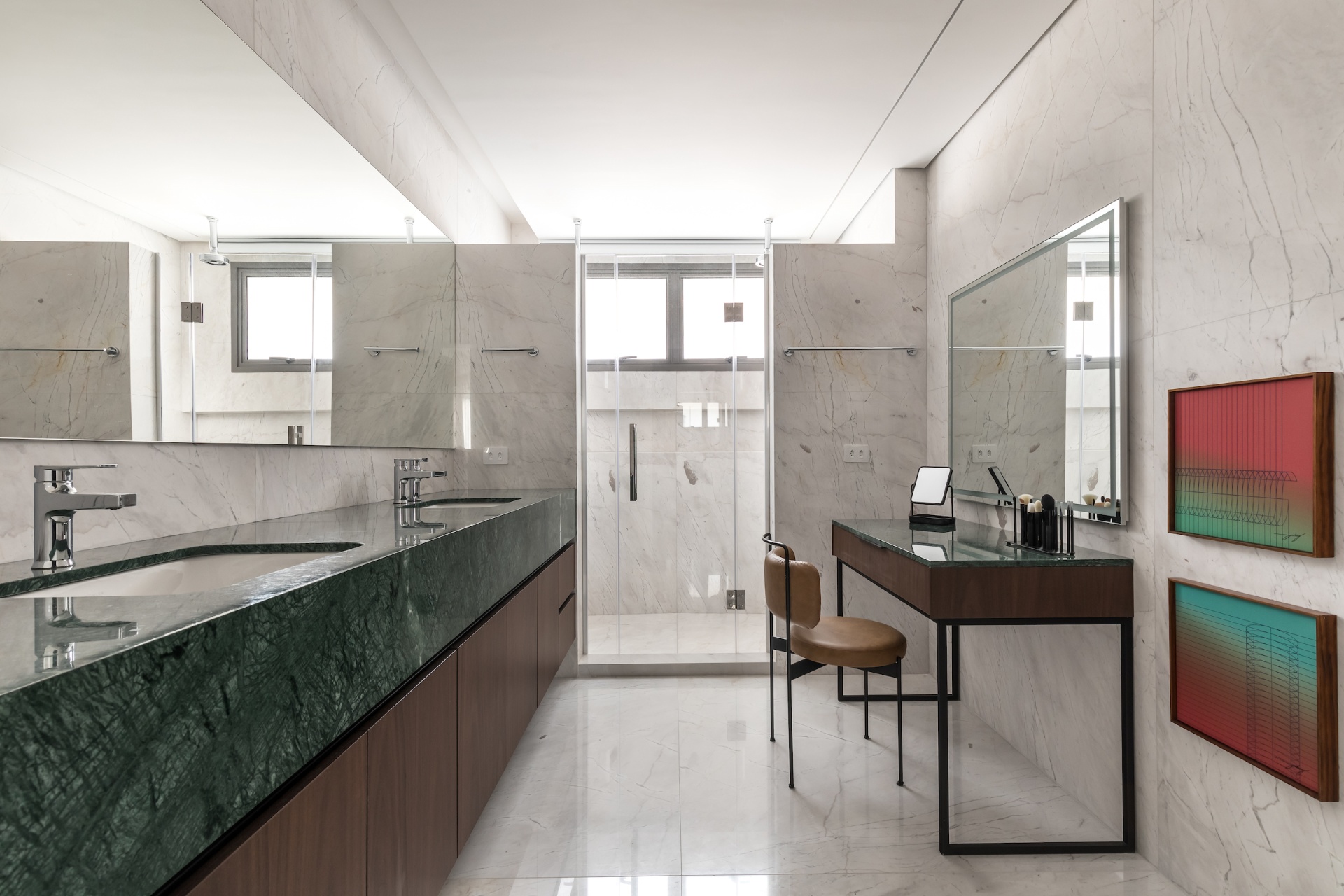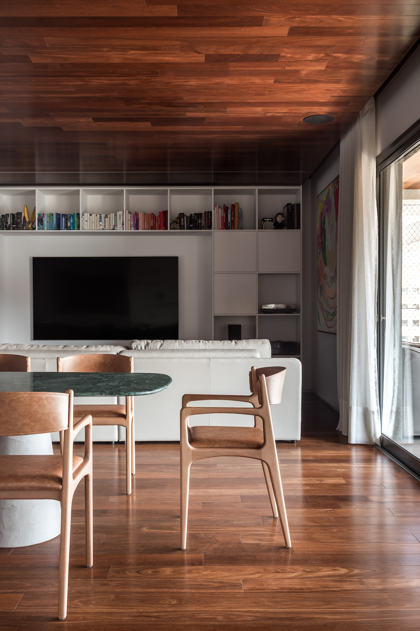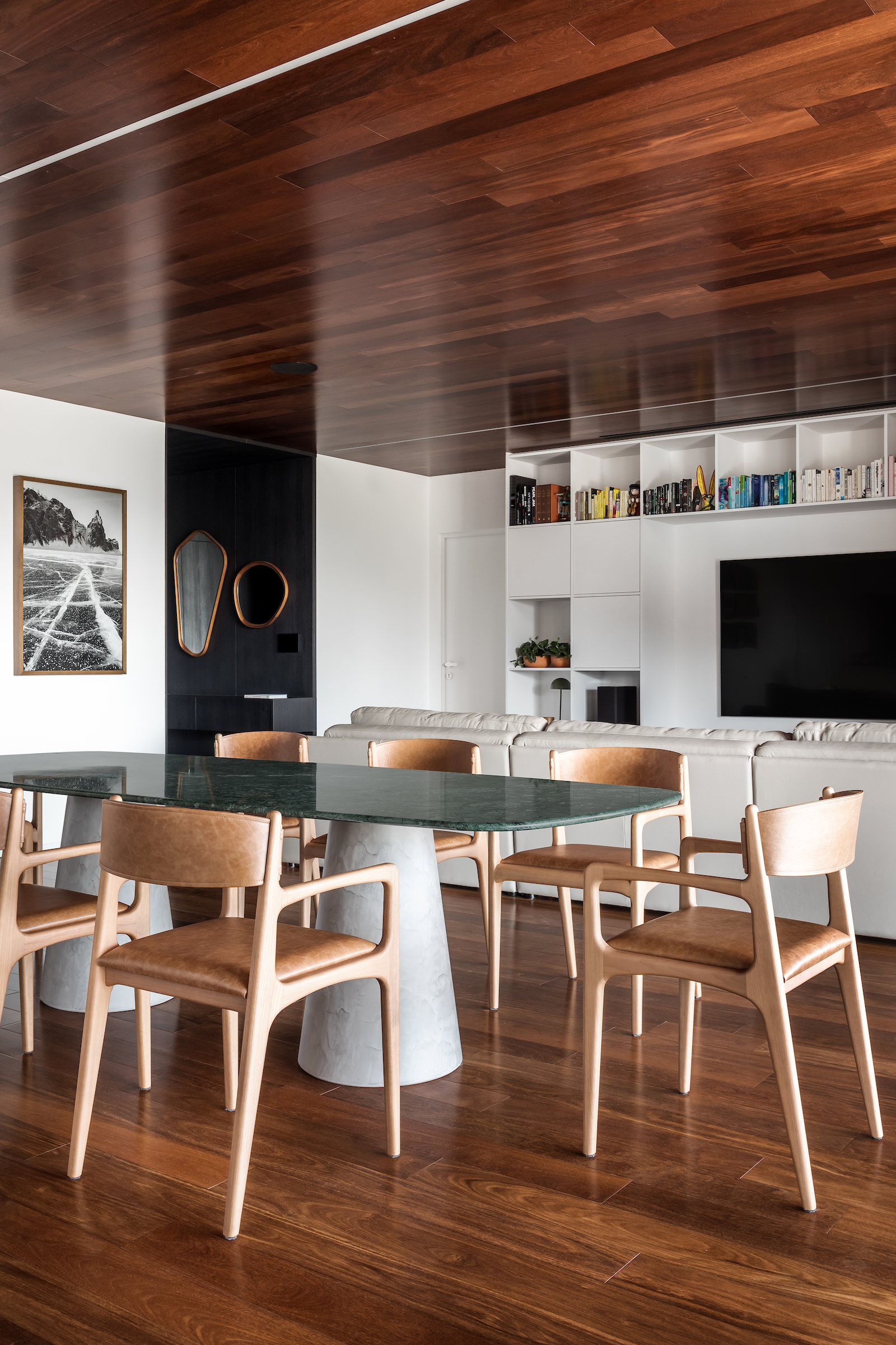 A linguagem contemporânea é ressaltada pelo impacto dos planos de piso e teto em madeira natural Sucupira em contraste com a neutralidade do mobiliário sob medida. As salas de estar e jantar ganham suavidade com tons leves enquanto o hall de entrada - com porta blindada coplanar ao painel - e o lavabo fazem parte da caixa ebanizada em lâmina de madeira natural. Os materiais de acabamento das superfícies de tampo foram escolhidos para trazer surpresa, tanto em cores quanto em toque: mármore verde Guatemala, granilite cinza, granito levigado preto São Gabriel e mármore branco Sivek. Um dos destaques do projeto são as portas de todo o apartamento que, por dentro do vão acabado da alvenaria, são em vidro fosco da Cinex e caixilho metálico. Com unidade entre os ambientes, o projeto de interiores é consolidado com a curadoria do mobiliário solto que prioriza os designers brasileiros da atualidade, como Jader Almeida, Estudiobola e Roberta Banquieri.