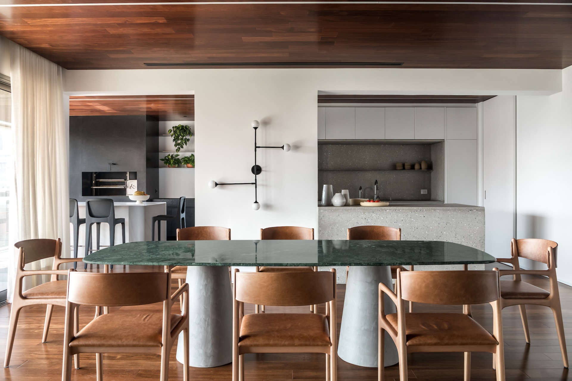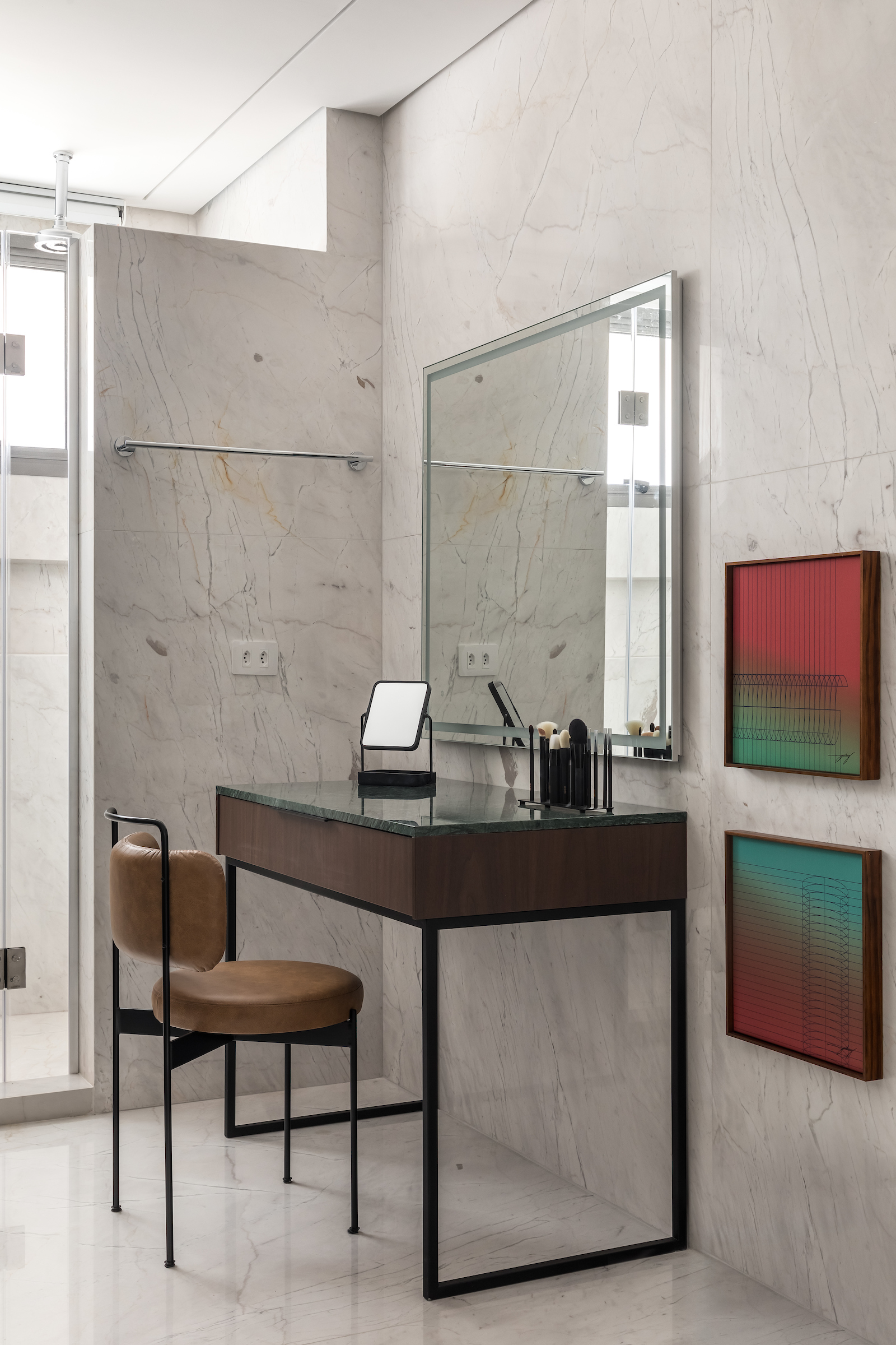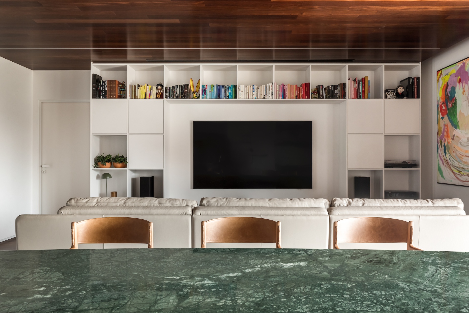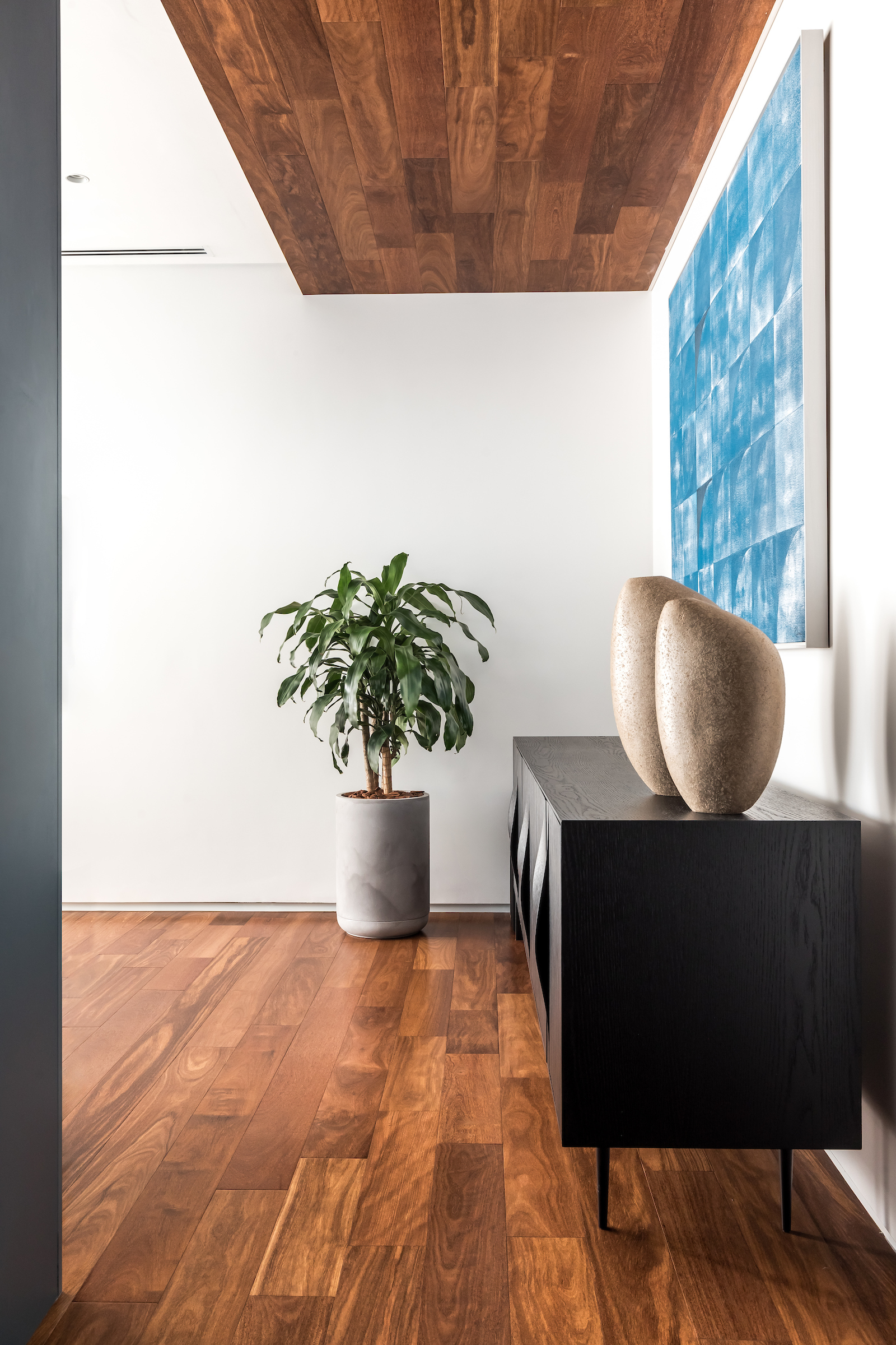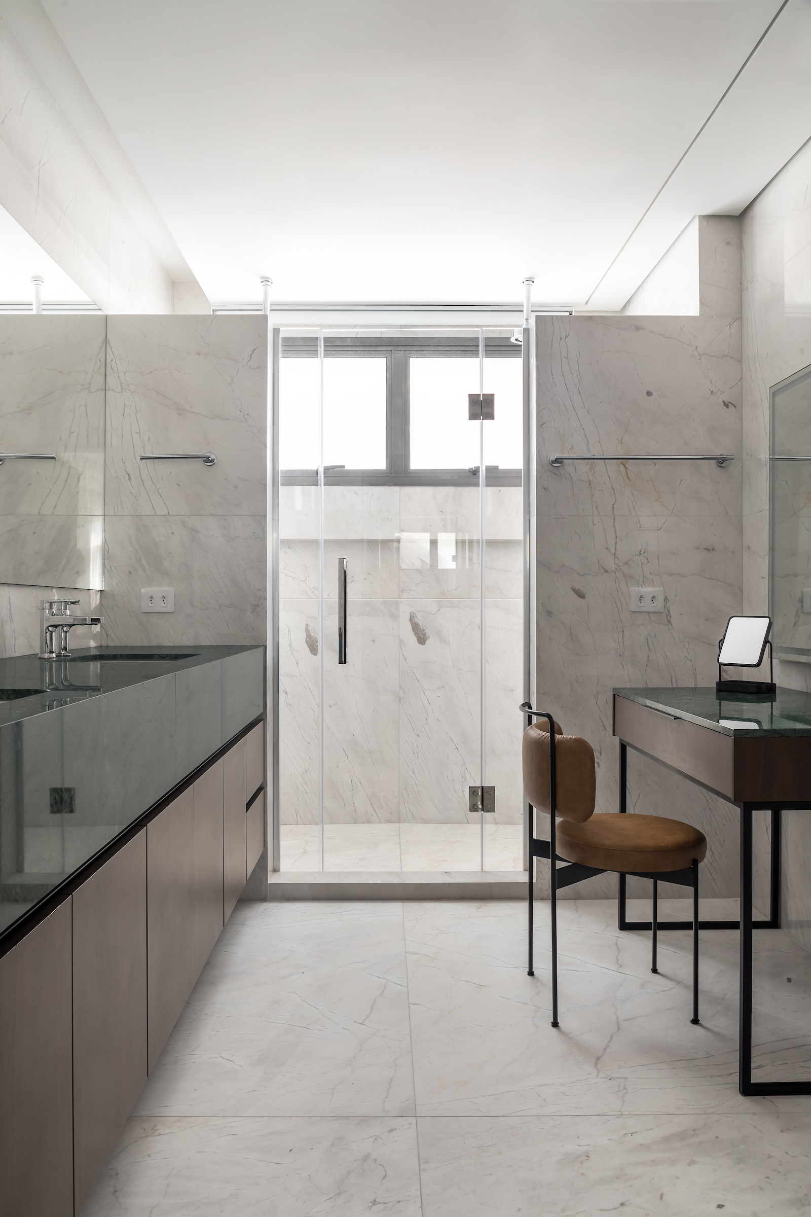 A linguagem contemporânea é ressaltada pelo impacto dos planos de piso e teto em madeira natural Sucupira em contraste com a neutralidade do mobiliário sob medida. As salas de estar e jantar ganham suavidade com tons leves enquanto o hall de entrada - com porta blindada coplanar ao painel - e o lavabo fazem parte da caixa ebanizada em lâmina de madeira natural. Os materiais de acabamento das superfícies de tampo foram escolhidos para trazer surpresa, tanto em cores quanto em toque: mármore verde Guatemala, granilite cinza, granito levigado preto São Gabriel e mármore branco Sivek. Um dos destaques do projeto são as portas de todo o apartamento que, por dentro do vão acabado da alvenaria, são em vidro fosco da Cinex e caixilho metálico. Com unidade entre os ambientes, o projeto de interiores é consolidado com a curadoria do mobiliário solto que prioriza os designers brasileiros da atualidade, como Jader Almeida, Estudiobola e Roberta Banquieri.