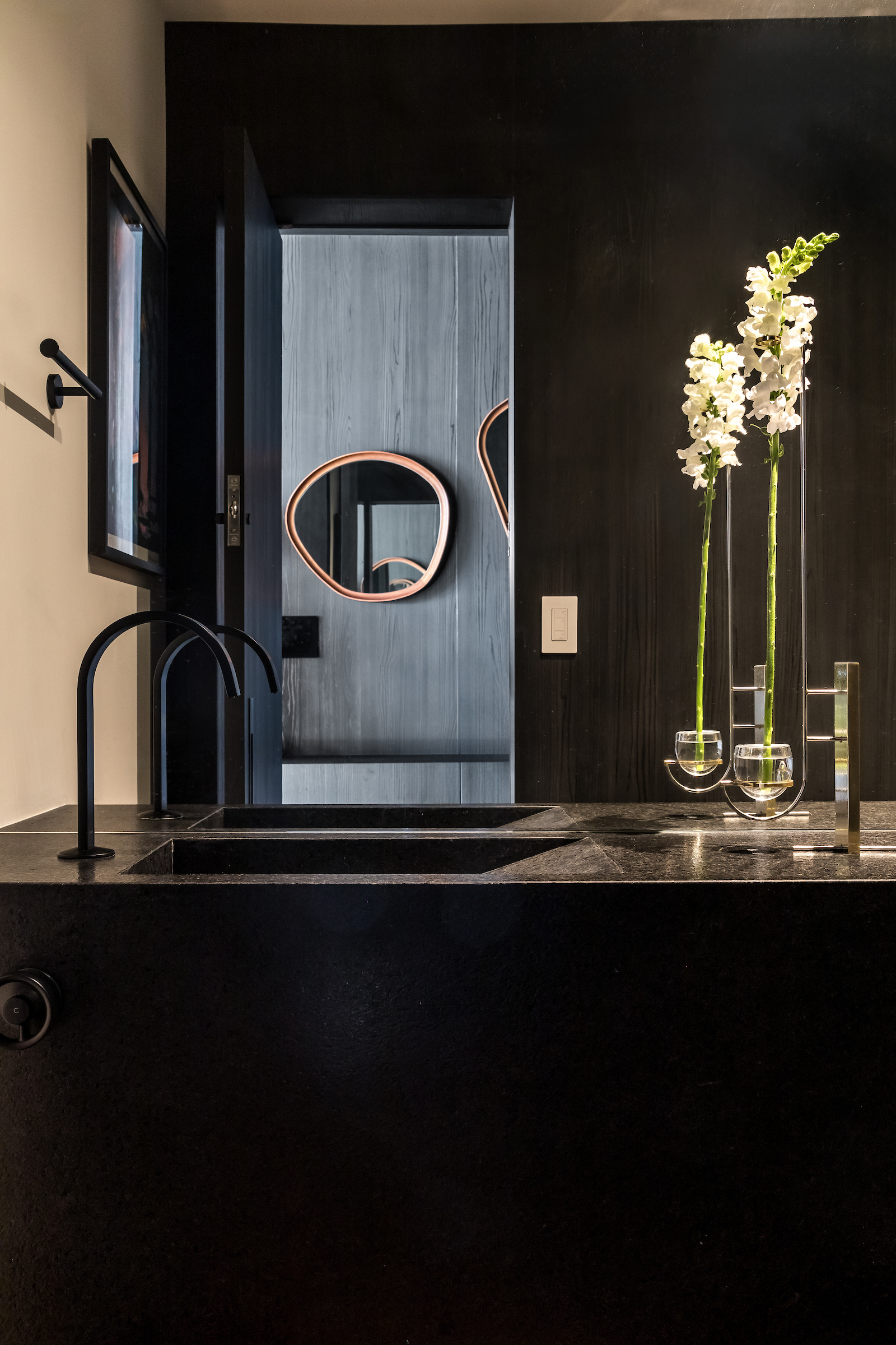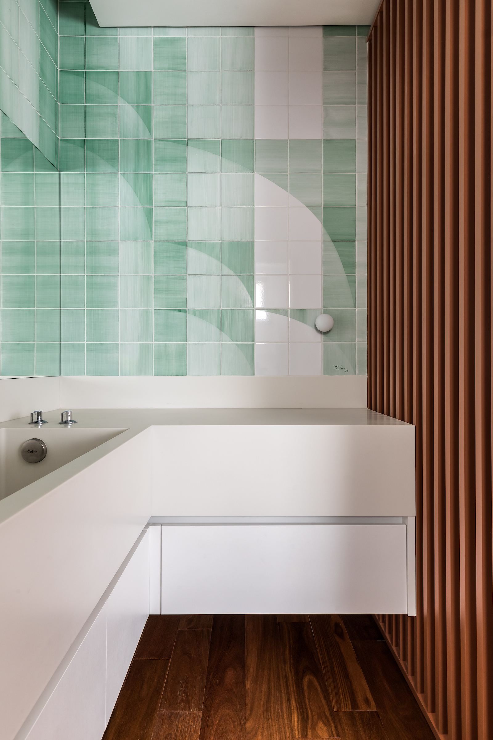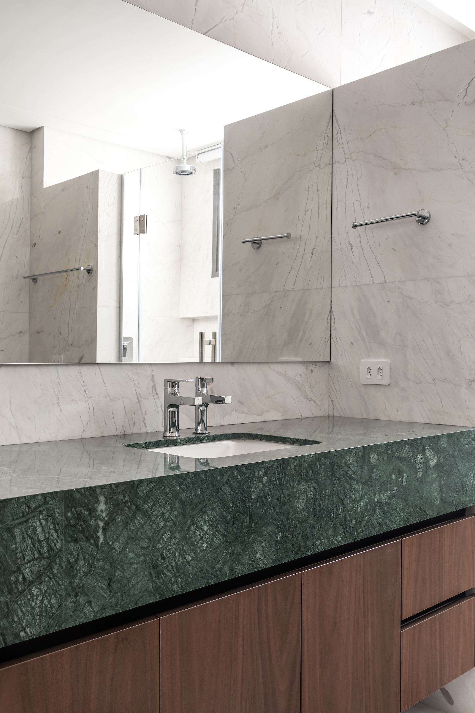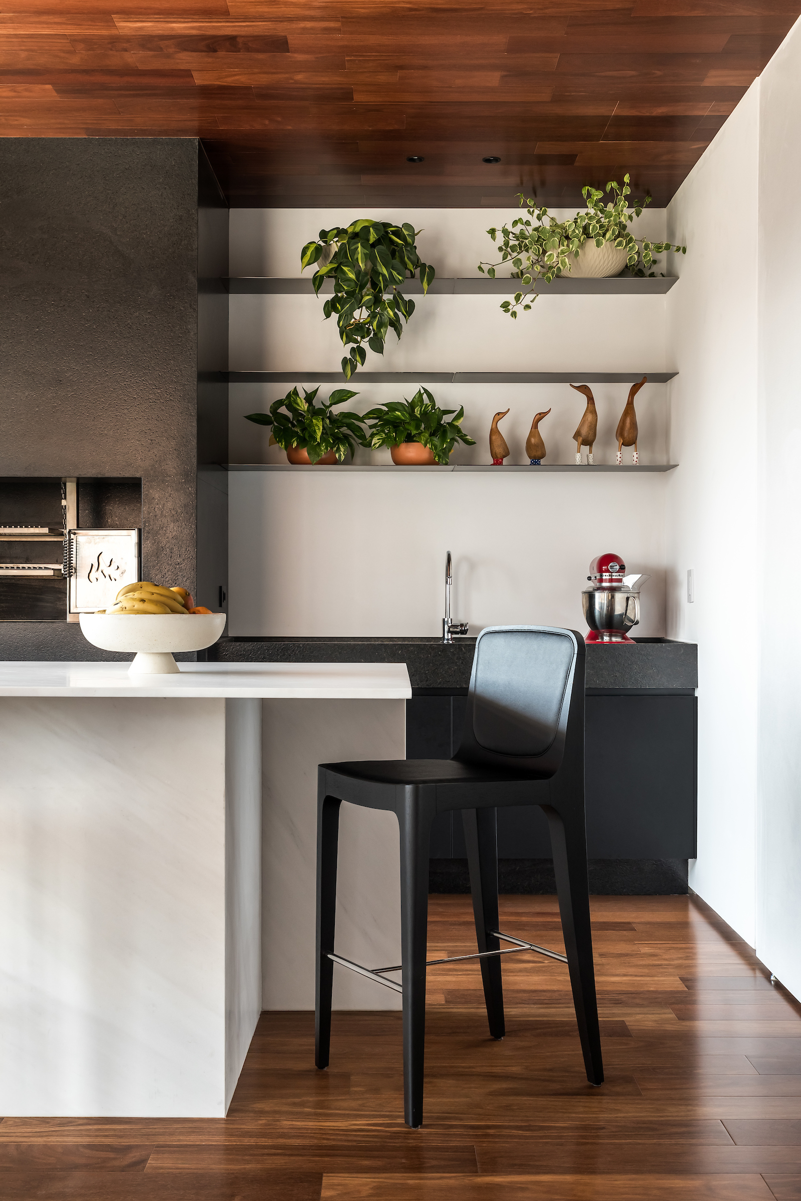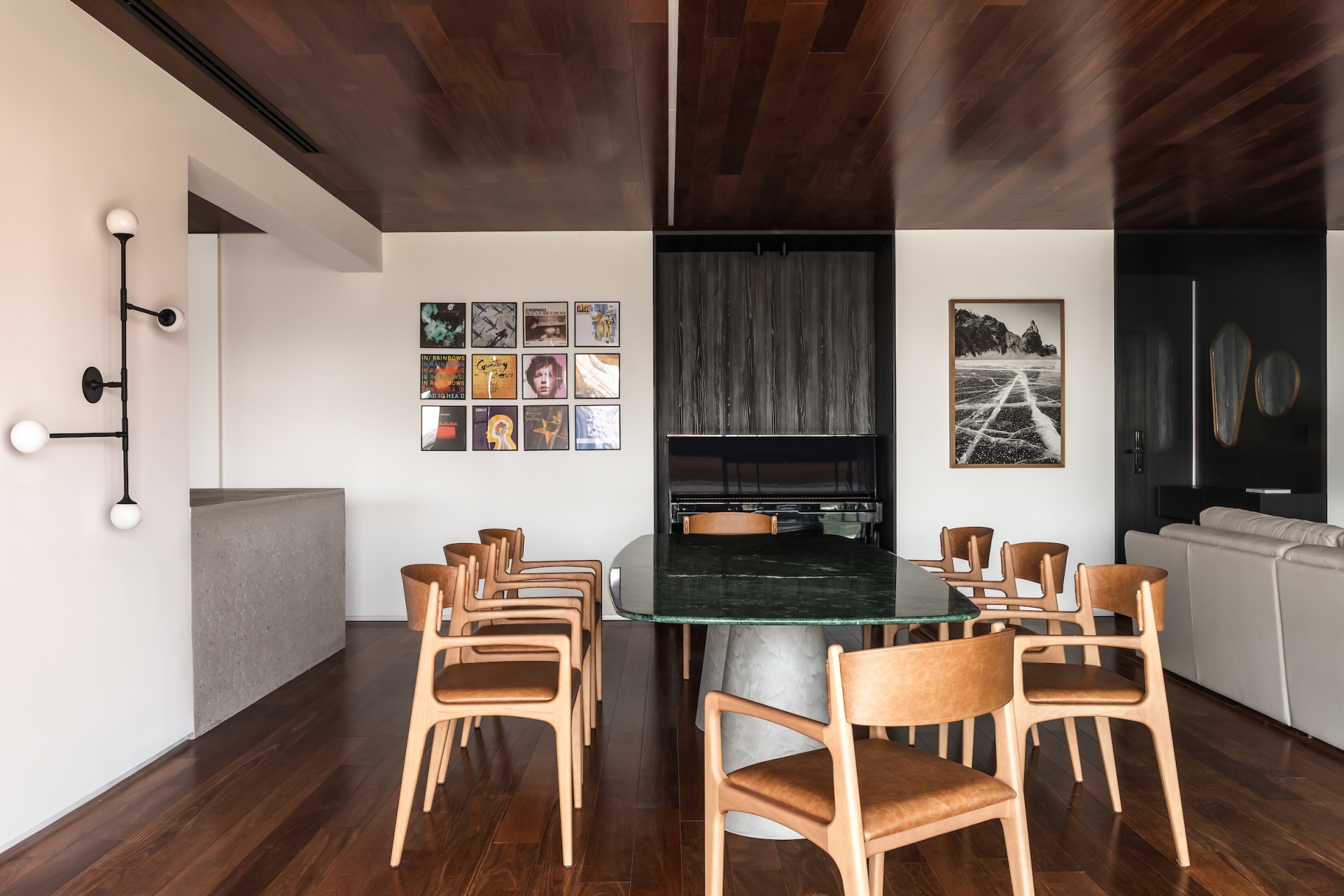 A linguagem contemporânea é ressaltada pelo impacto dos planos de piso e teto em madeira natural Sucupira em contraste com a neutralidade do mobiliário sob medida. As salas de estar e jantar ganham suavidade com tons leves enquanto o hall de entrada - com porta blindada coplanar ao painel - e o lavabo fazem parte da caixa ebanizada em lâmina de madeira natural. Os materiais de acabamento das superfícies de tampo foram escolhidos para trazer surpresa, tanto em cores quanto em toque: mármore verde Guatemala, granilite cinza, granito levigado preto São Gabriel e mármore branco Sivek. Um dos destaques do projeto são as portas de todo o apartamento que, por dentro do vão acabado da alvenaria, são em vidro fosco da Cinex e caixilho metálico. Com unidade entre os ambientes, o projeto de interiores é consolidado com a curadoria do mobiliário solto que prioriza os designers brasileiros da atualidade, como Jader Almeida, Estudiobola e Roberta Banquieri.