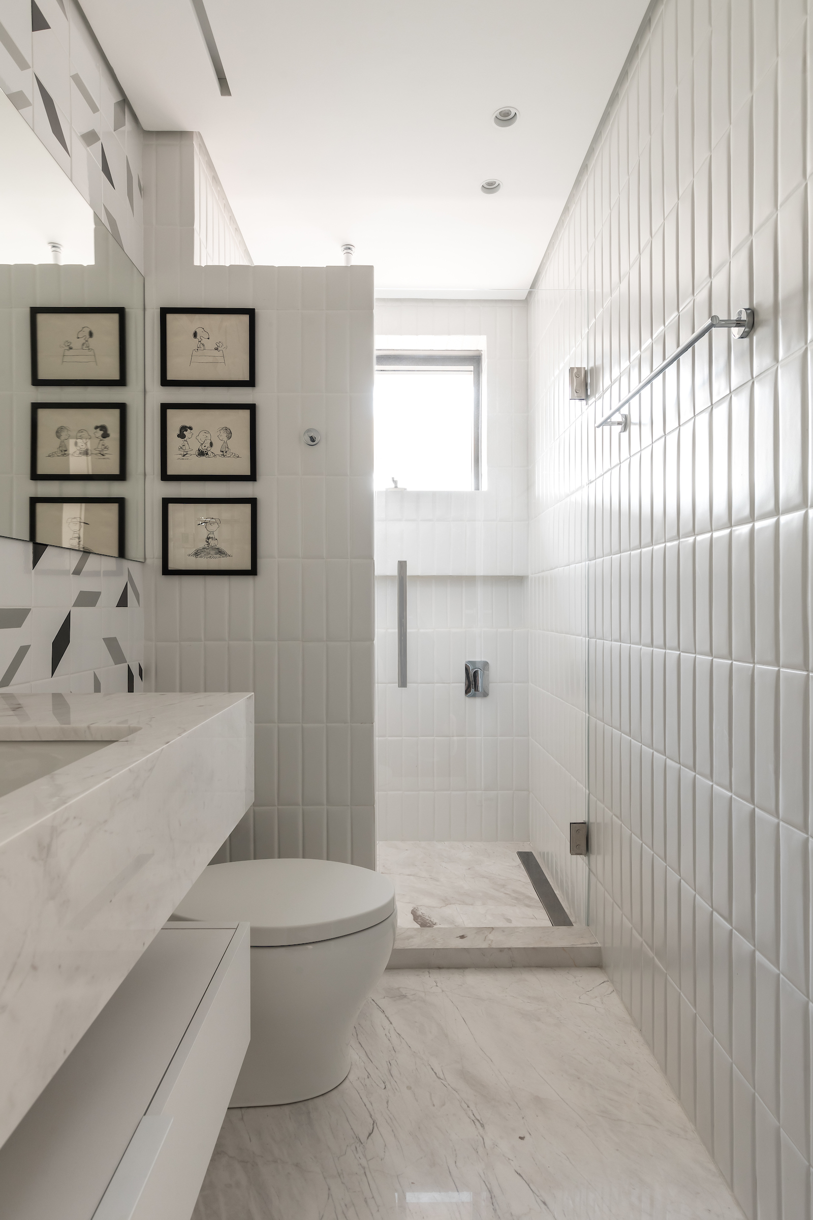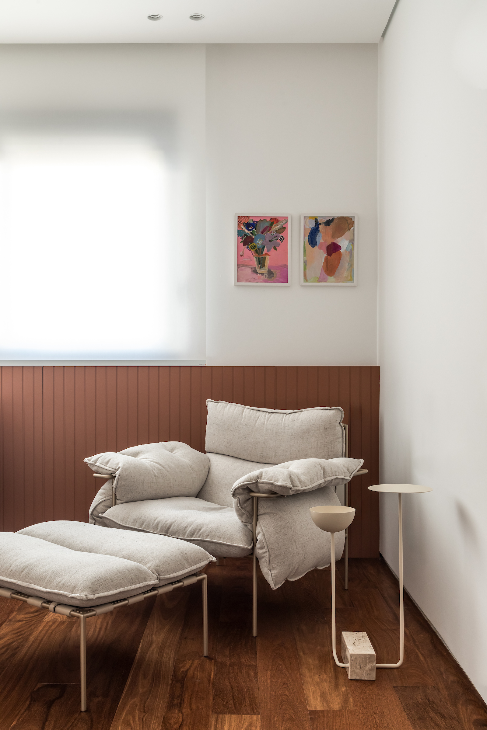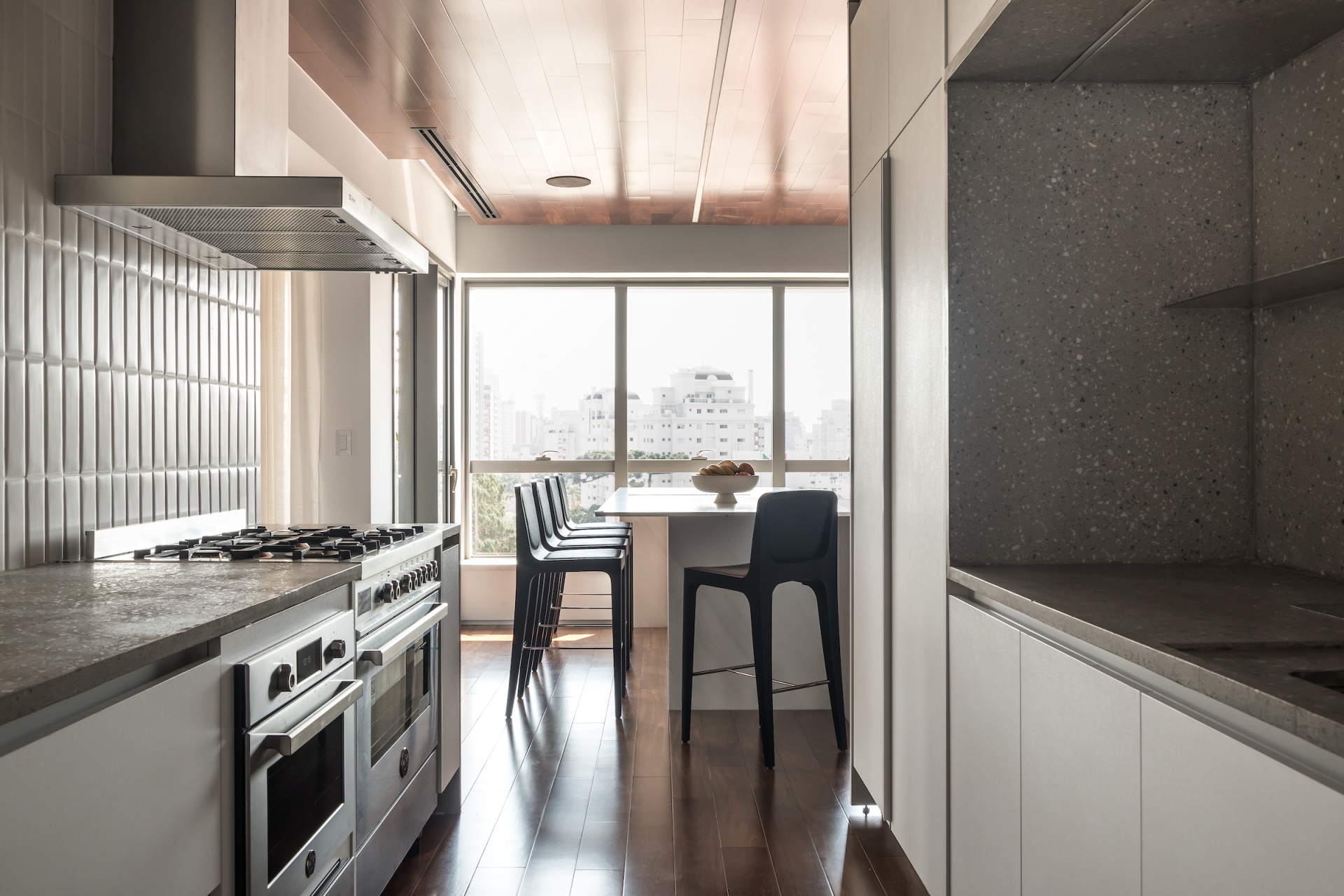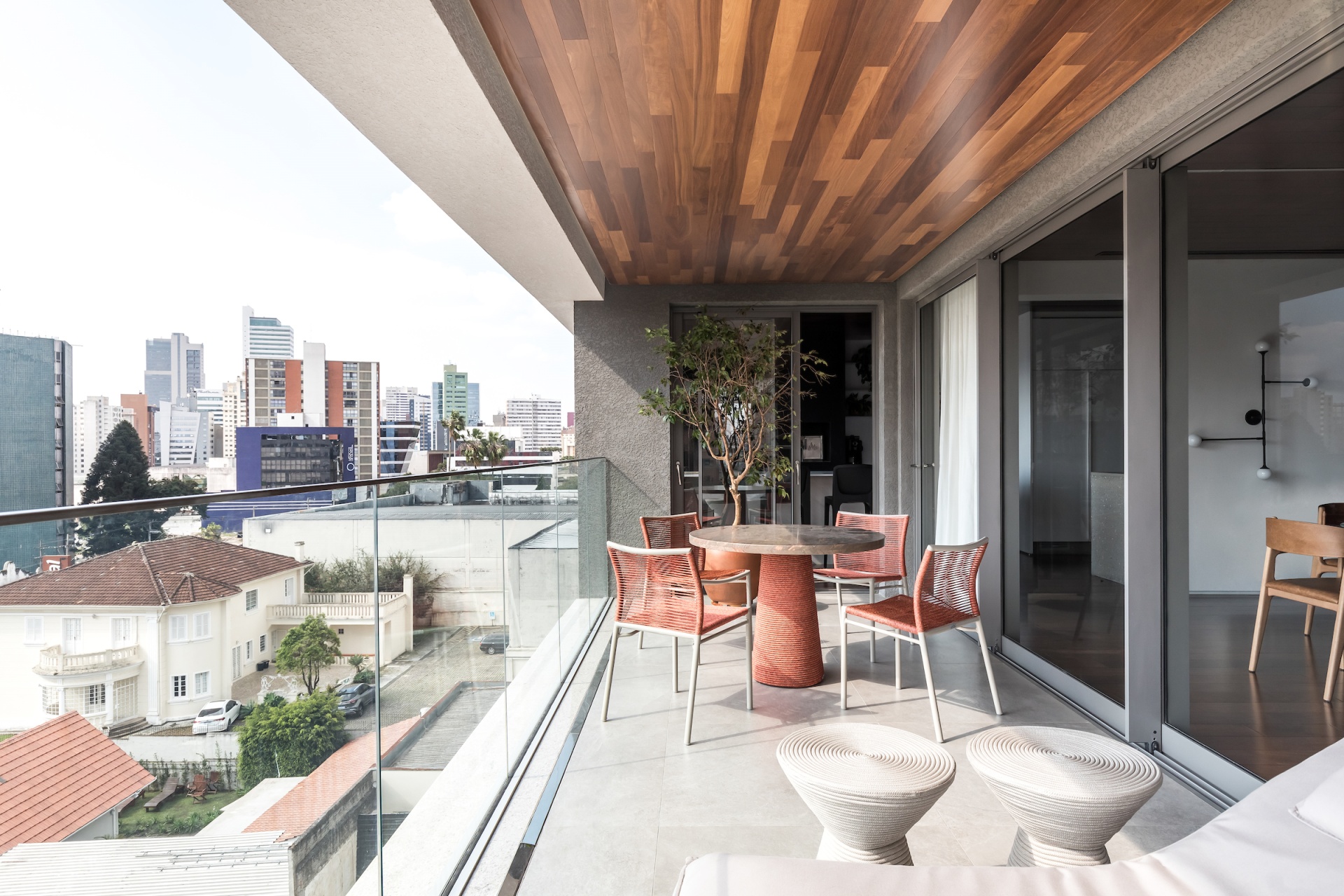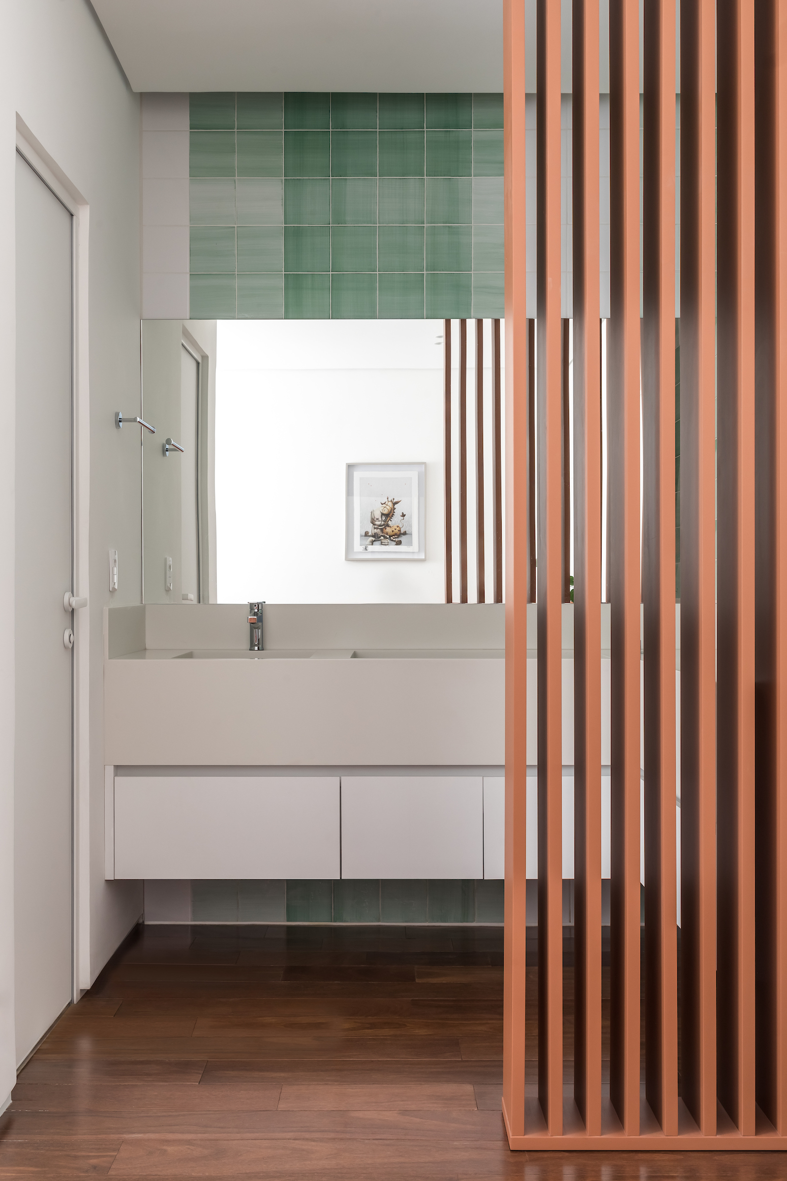 A linguagem contemporânea é ressaltada pelo impacto dos planos de piso e teto em madeira natural Sucupira em contraste com a neutralidade do mobiliário sob medida. As salas de estar e jantar ganham suavidade com tons leves enquanto o hall de entrada - com porta blindada coplanar ao painel - e o lavabo fazem parte da caixa ebanizada em lâmina de madeira natural. Os materiais de acabamento das superfícies de tampo foram escolhidos para trazer surpresa, tanto em cores quanto em toque: mármore verde Guatemala, granilite cinza, granito levigado preto São Gabriel e mármore branco Sivek. Um dos destaques do projeto são as portas de todo o apartamento que, por dentro do vão acabado da alvenaria, são em vidro fosco da Cinex e caixilho metálico. Com unidade entre os ambientes, o projeto de interiores é consolidado com a curadoria do mobiliário solto que prioriza os designers brasileiros da atualidade, como Jader Almeida, Estudiobola e Roberta Banquieri.