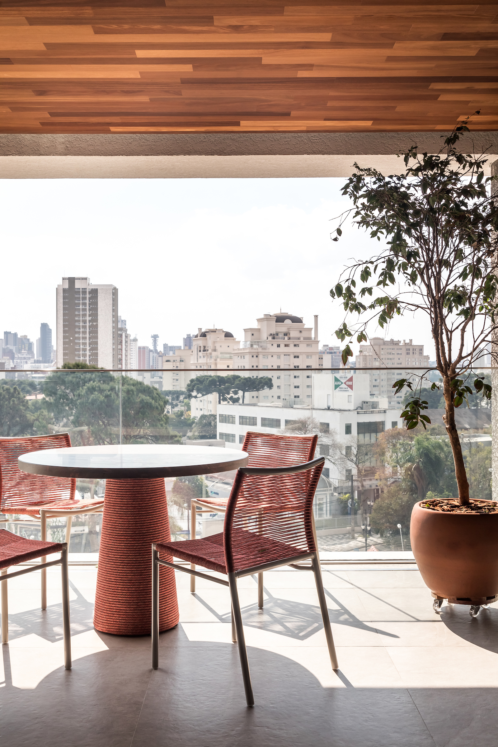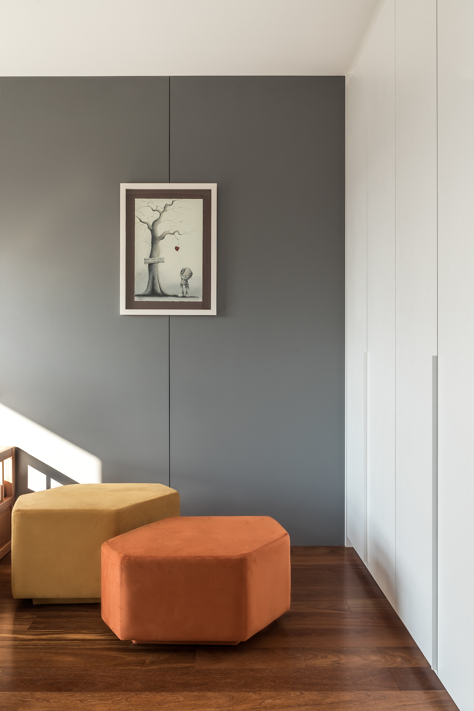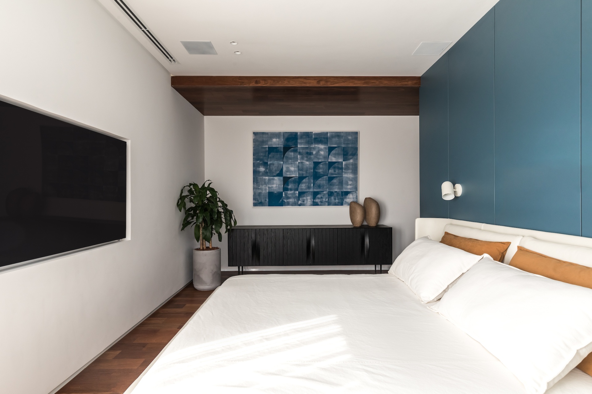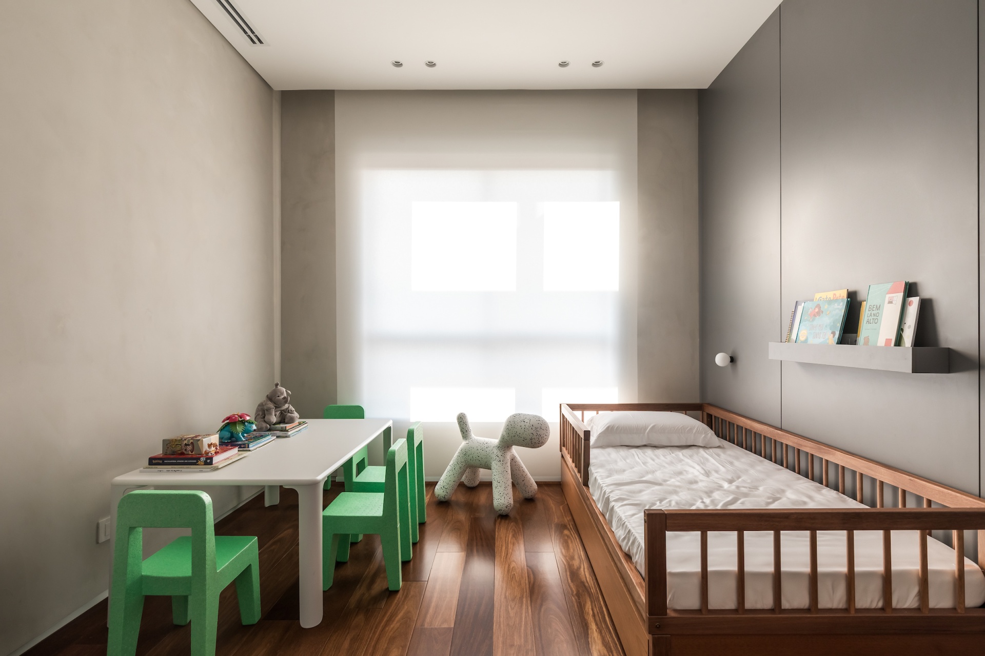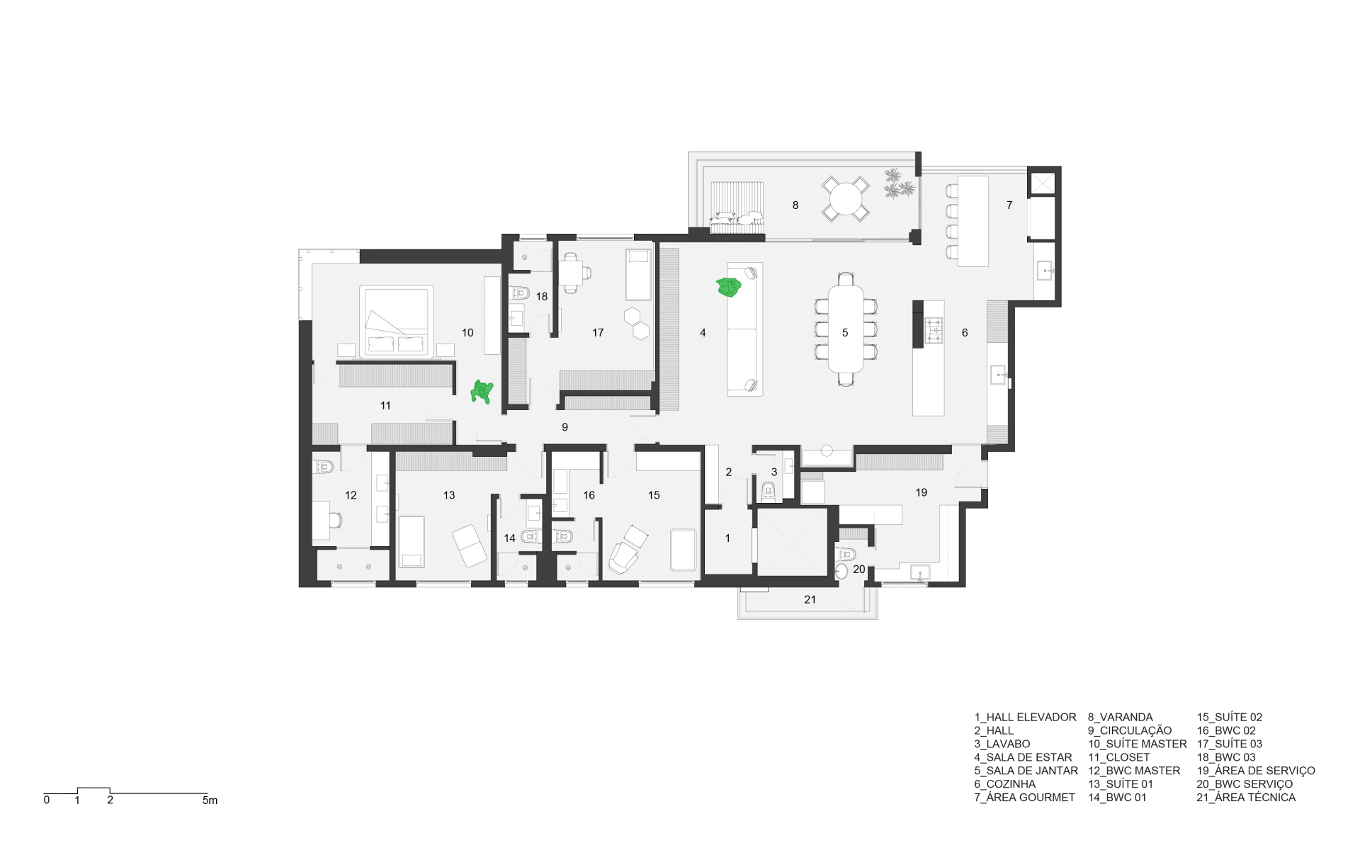A linguagem contemporânea é ressaltada pelo impacto dos planos de piso e teto em madeira natural Sucupira em contraste com a neutralidade do mobiliário sob medida. As salas de estar e jantar ganham suavidade com tons leves enquanto o hall de entrada - com porta blindada coplanar ao painel - e o lavabo fazem parte da caixa ebanizada em lâmina de madeira natural. Os materiais de acabamento das superfícies de tampo foram escolhidos para trazer surpresa, tanto em cores quanto em toque: mármore verde Guatemala, granilite cinza, granito levigado preto São Gabriel e mármore branco Sivek. Um dos destaques do projeto são as portas de todo o apartamento que, por dentro do vão acabado da alvenaria, são em vidro fosco da Cinex e caixilho metálico. Com unidade entre os ambientes, o projeto de interiores é consolidado com a curadoria do mobiliário solto que prioriza os designers brasileiros da atualidade, como Jader Almeida, Estudiobola e Roberta Banquieri.