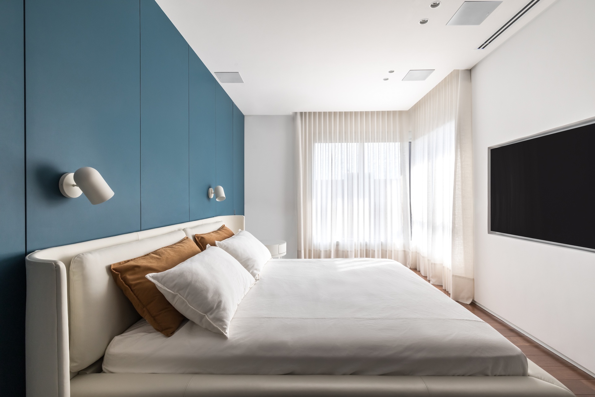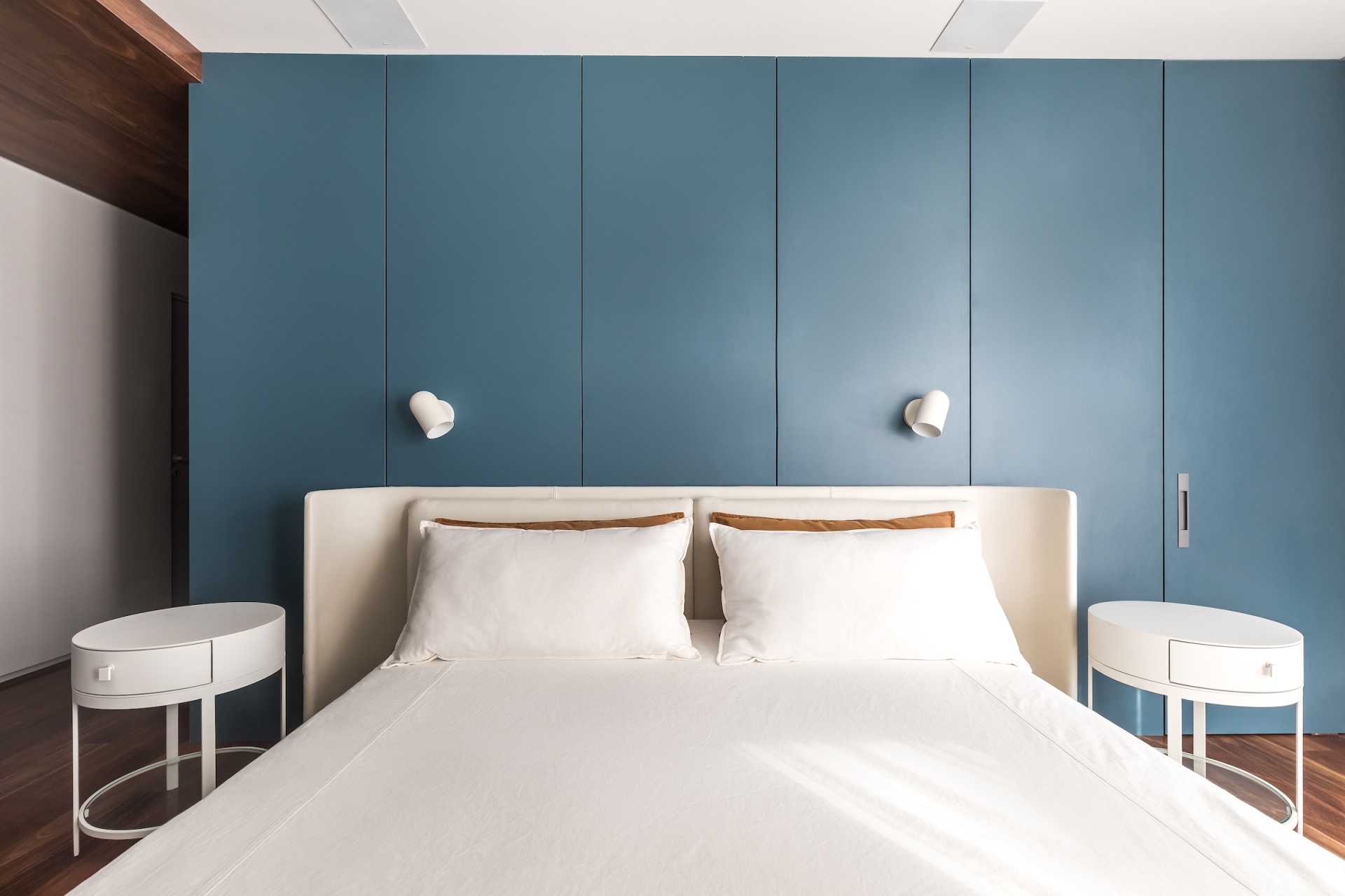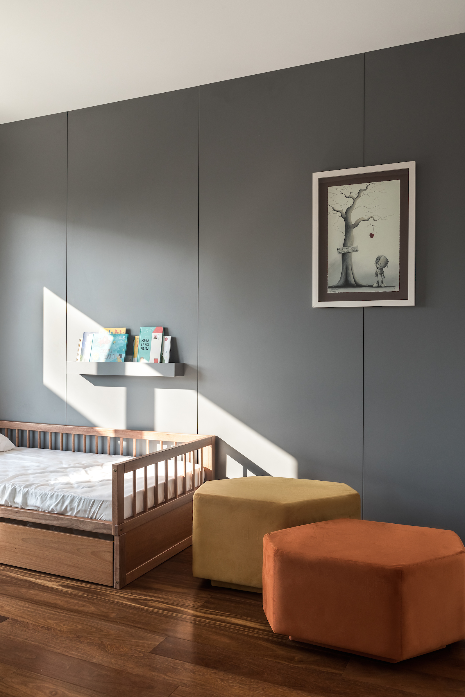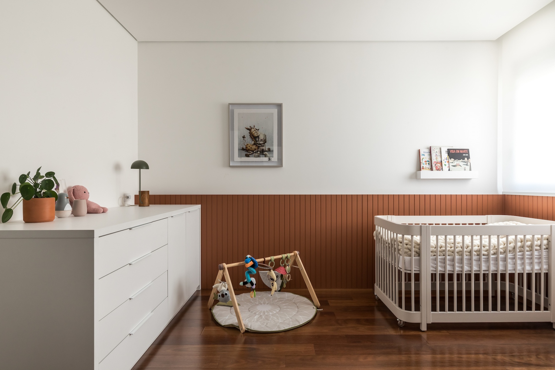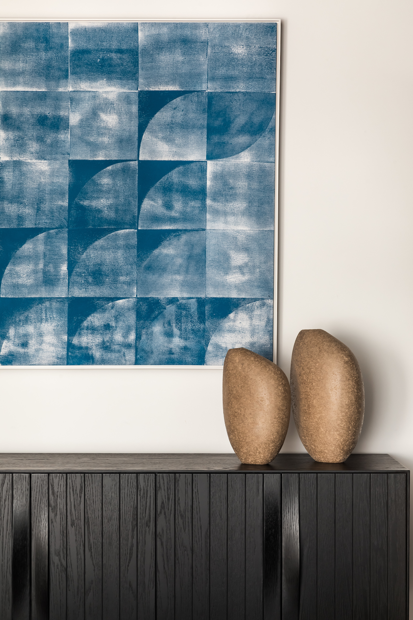 A linguagem contemporânea é ressaltada pelo impacto dos planos de piso e teto em madeira natural Sucupira em contraste com a neutralidade do mobiliário sob medida. As salas de estar e jantar ganham suavidade com tons leves enquanto o hall de entrada - com porta blindada coplanar ao painel - e o lavabo fazem parte da caixa ebanizada em lâmina de madeira natural. Os materiais de acabamento das superfícies de tampo foram escolhidos para trazer surpresa, tanto em cores quanto em toque: mármore verde Guatemala, granilite cinza, granito levigado preto São Gabriel e mármore branco Sivek. Um dos destaques do projeto são as portas de todo o apartamento que, por dentro do vão acabado da alvenaria, são em vidro fosco da Cinex e caixilho metálico. Com unidade entre os ambientes, o projeto de interiores é consolidado com a curadoria do mobiliário solto que prioriza os designers brasileiros da atualidade, como Jader Almeida, Estudiobola e Roberta Banquieri.