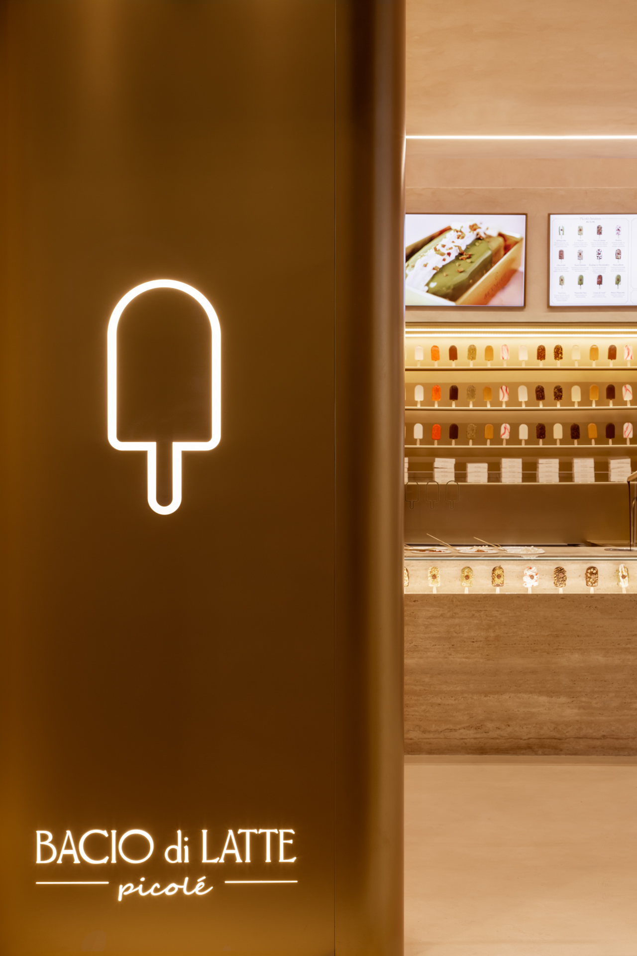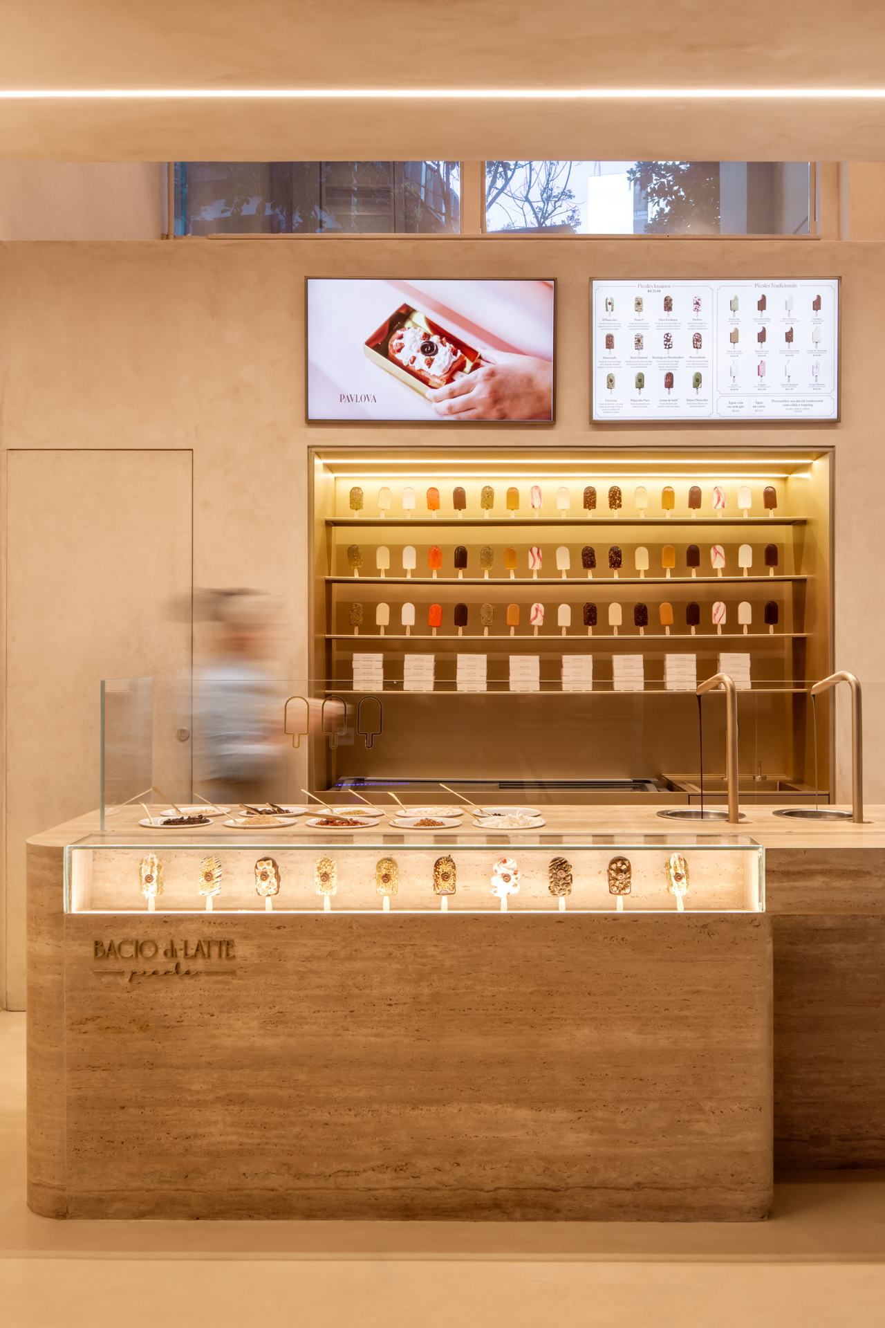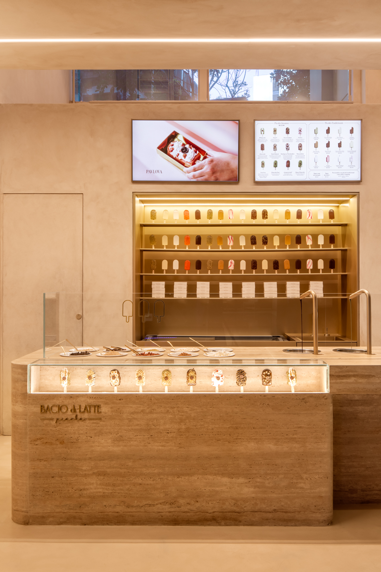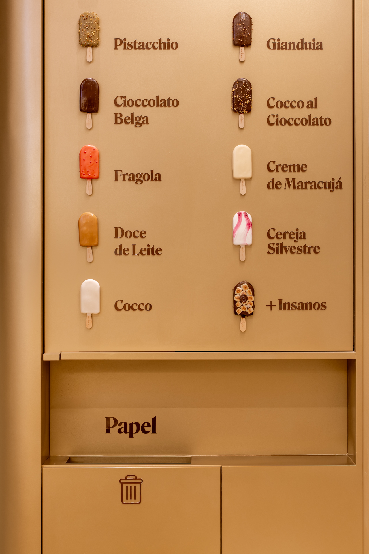 Com inspiração na cremosidade dos sorvetes, o novo conceito para a primeira loja de picolés insanos da Bacio di Latte traz a ambientação monocromática e a sofisticação atemporal como bases de projeto. A repetição dos mockups de picolé dá o toque, sendo o ponto inusitado e divertido, enquanto o piso monolítico, paredes e forro texturizados formam um conjunto neutro em contraste com o mármore Travertino e o metal dourado. A fachada é pura, branca como o leite, com o elemento vertical em metal dourado e picolé iluminado brincando de esconder e revelar a loja aos poucos. Tão italiano como os gelatos, o Travertino é protagonista. A bancada acessível, arredondada e solta no ambiente, tem a vitrine de picolés como jóias irresistíveis, em formato e coberturas em imitação dos sabores reais. Ao fundo do balcão, a parede que divide o atendimento da retaguarda vai até meia altura para que a janela ao fundo apareça, trazendo luminosidade natural. O nicho dourado simétrico, abaixo dos cardápios digitais, quebra o plano texturizado. A proposta destaca a pureza dos materiais e a composição mínima dos elementos, que, com a suavidade necessária, dão suporte à explosão de cores e sabores dos picolés.