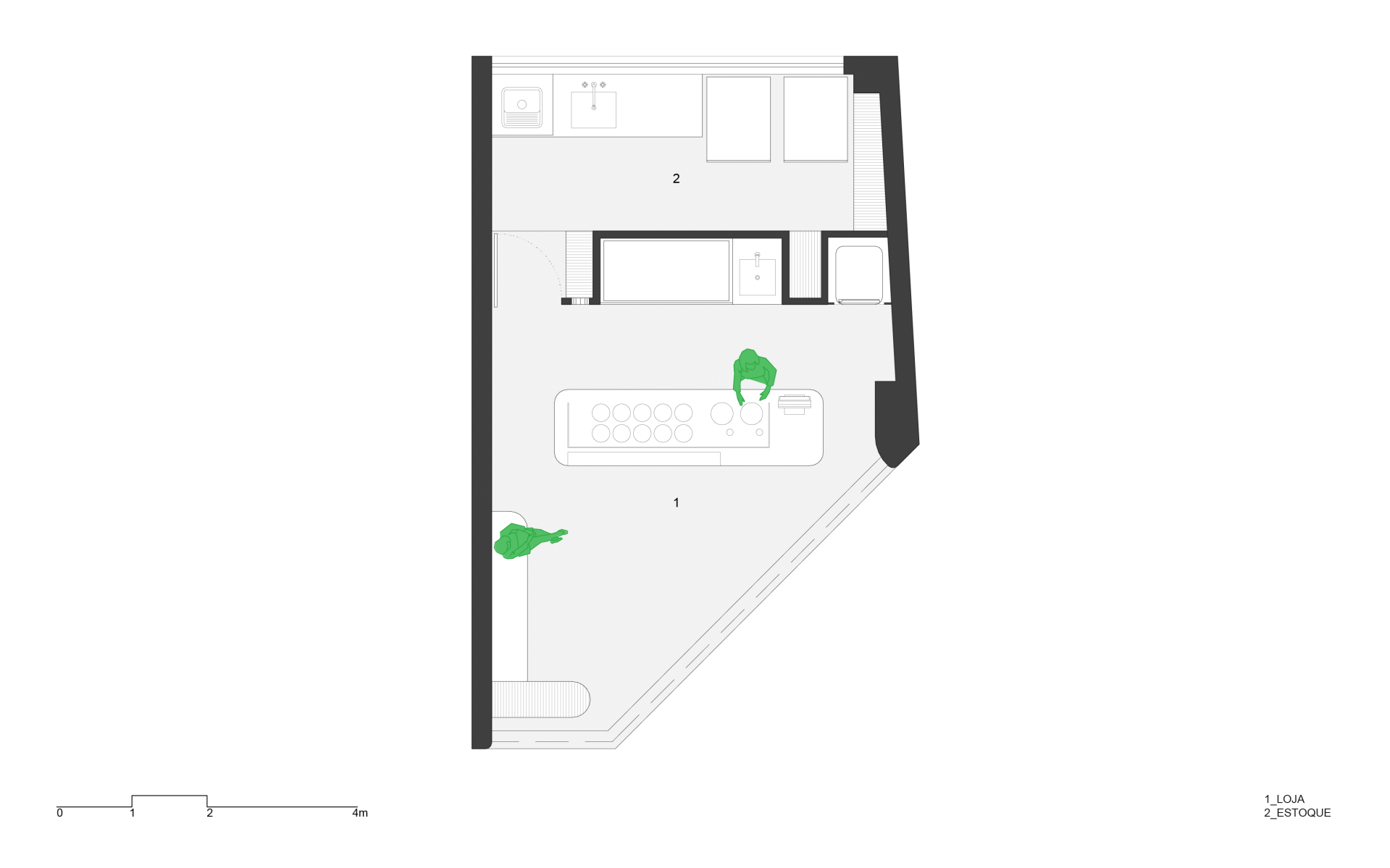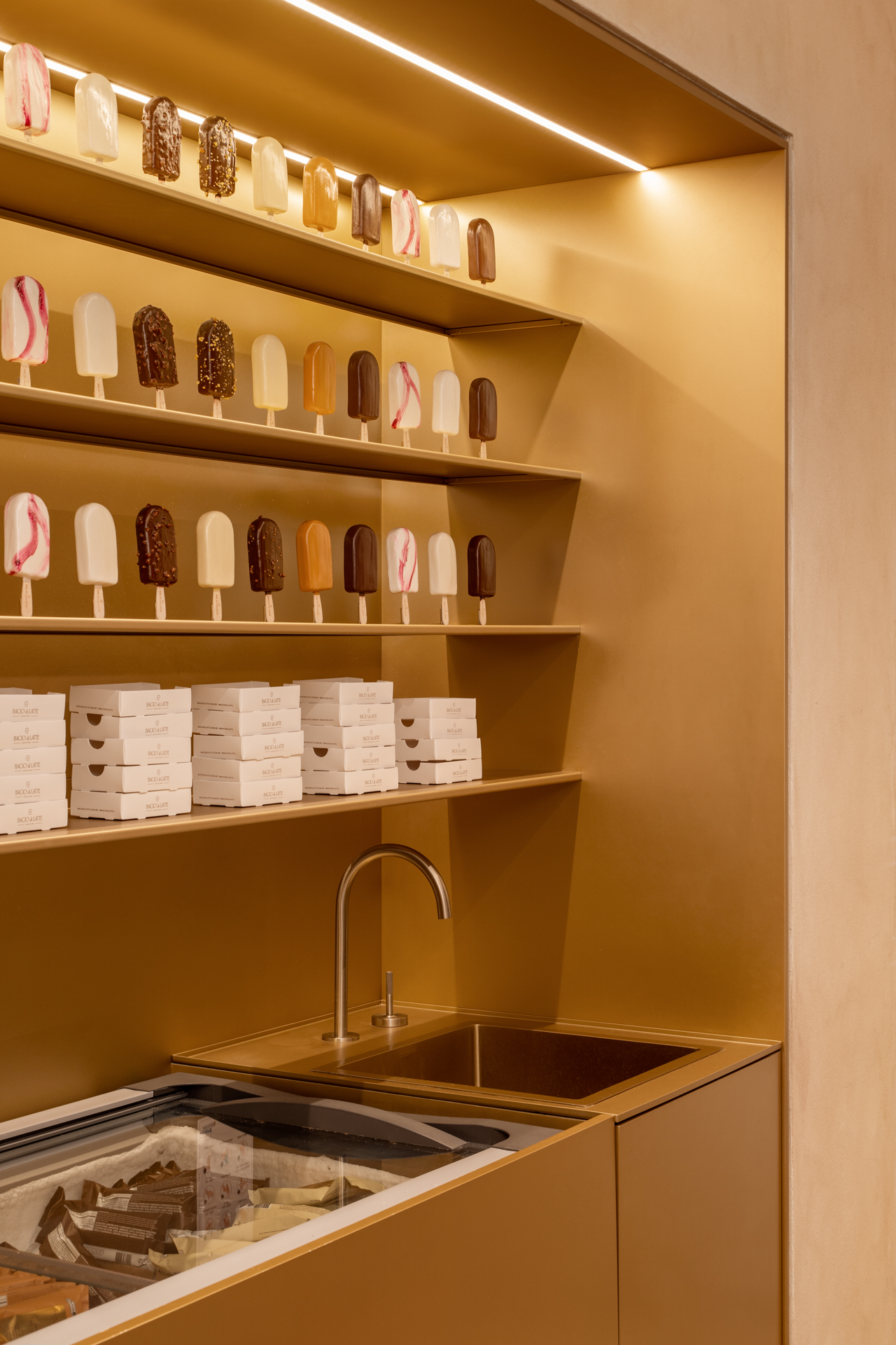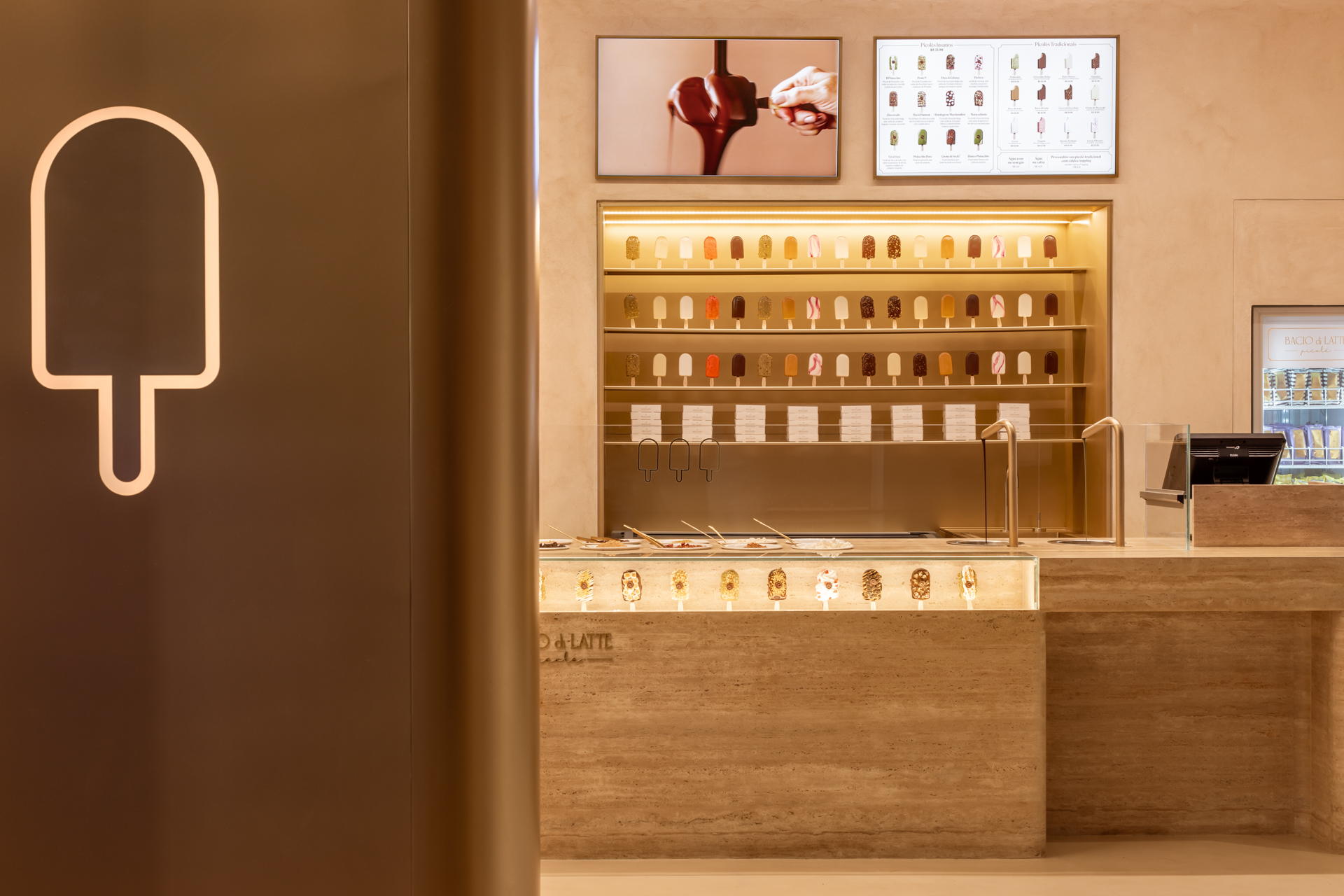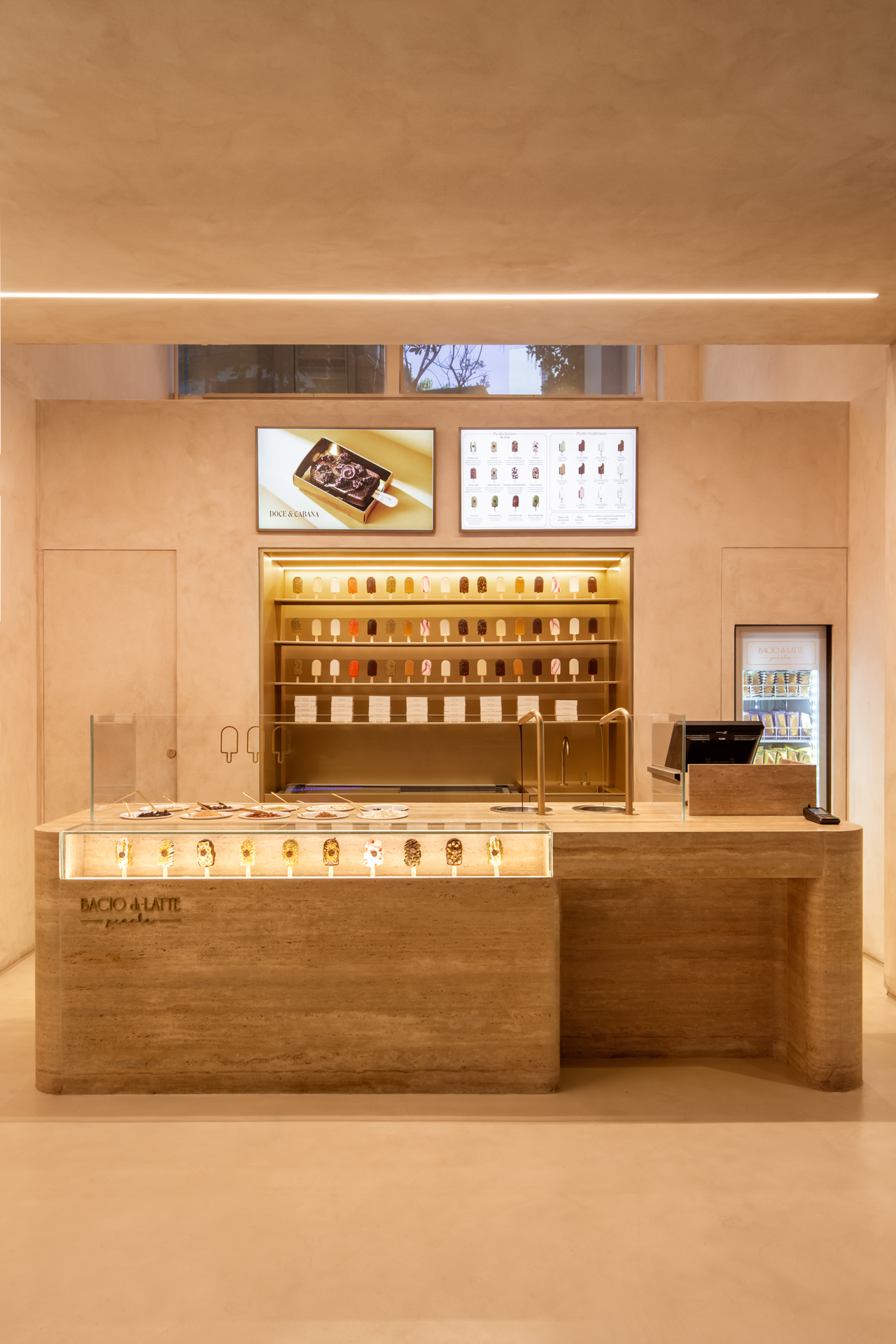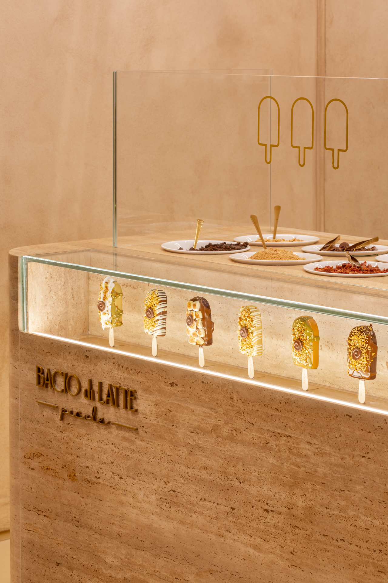 Com inspiração na cremosidade dos sorvetes, o novo conceito para a primeira loja de picolés insanos da Bacio di Latte traz a ambientação monocromática e a sofisticação atemporal como bases de projeto. A repetição dos mockups de picolé dá o toque, sendo o ponto inusitado e divertido, enquanto o piso monolítico, paredes e forro texturizados formam um conjunto neutro em contraste com o mármore Travertino e o metal dourado. A fachada é pura, branca como o leite, com o elemento vertical em metal dourado e picolé iluminado brincando de esconder e revelar a loja aos poucos. Tão italiano como os gelatos, o Travertino é protagonista. A bancada acessível, arredondada e solta no ambiente, tem a vitrine de picolés como jóias irresistíveis, em formato e coberturas em imitação dos sabores reais. Ao fundo do balcão, a parede que divide o atendimento da retaguarda vai até meia altura para que a janela ao fundo apareça, trazendo luminosidade natural. O nicho dourado simétrico, abaixo dos cardápios digitais, quebra o plano texturizado. A proposta destaca a pureza dos materiais e a composição mínima dos elementos, que, com a suavidade necessária, dão suporte à explosão de cores e sabores dos picolés.