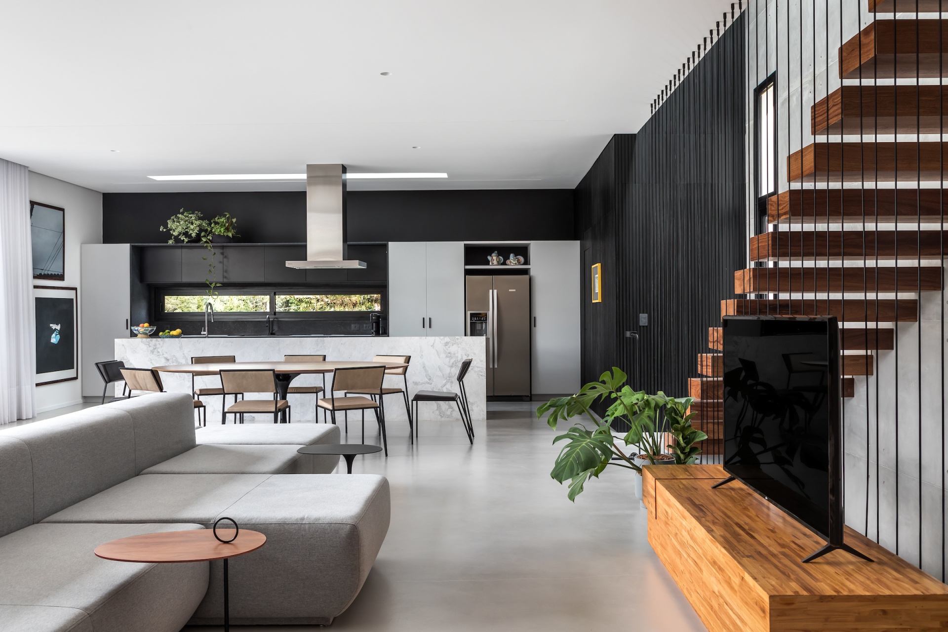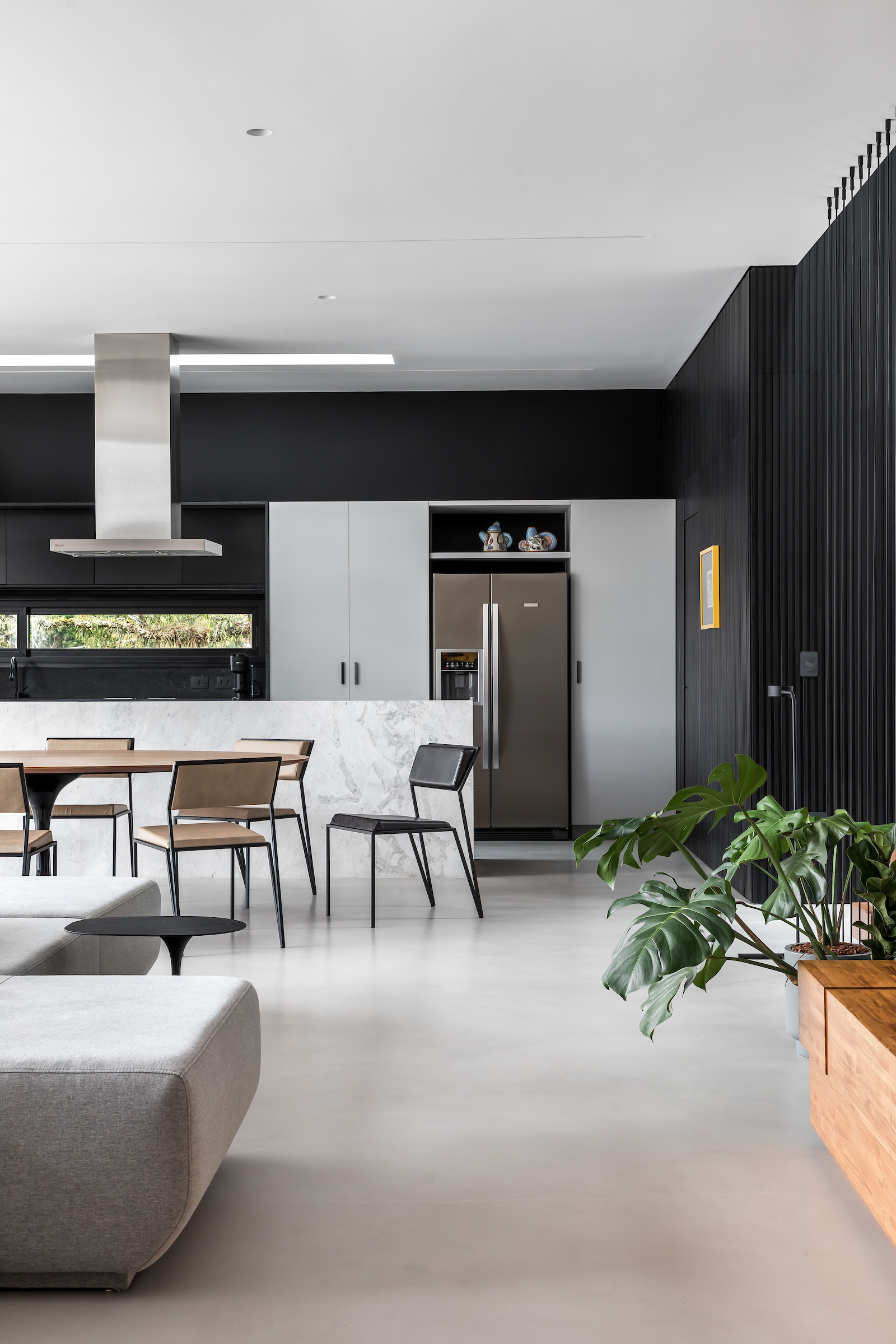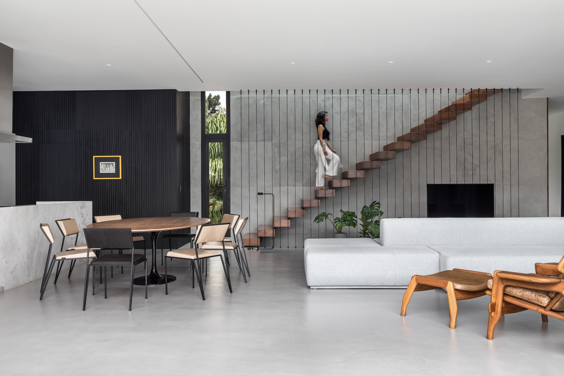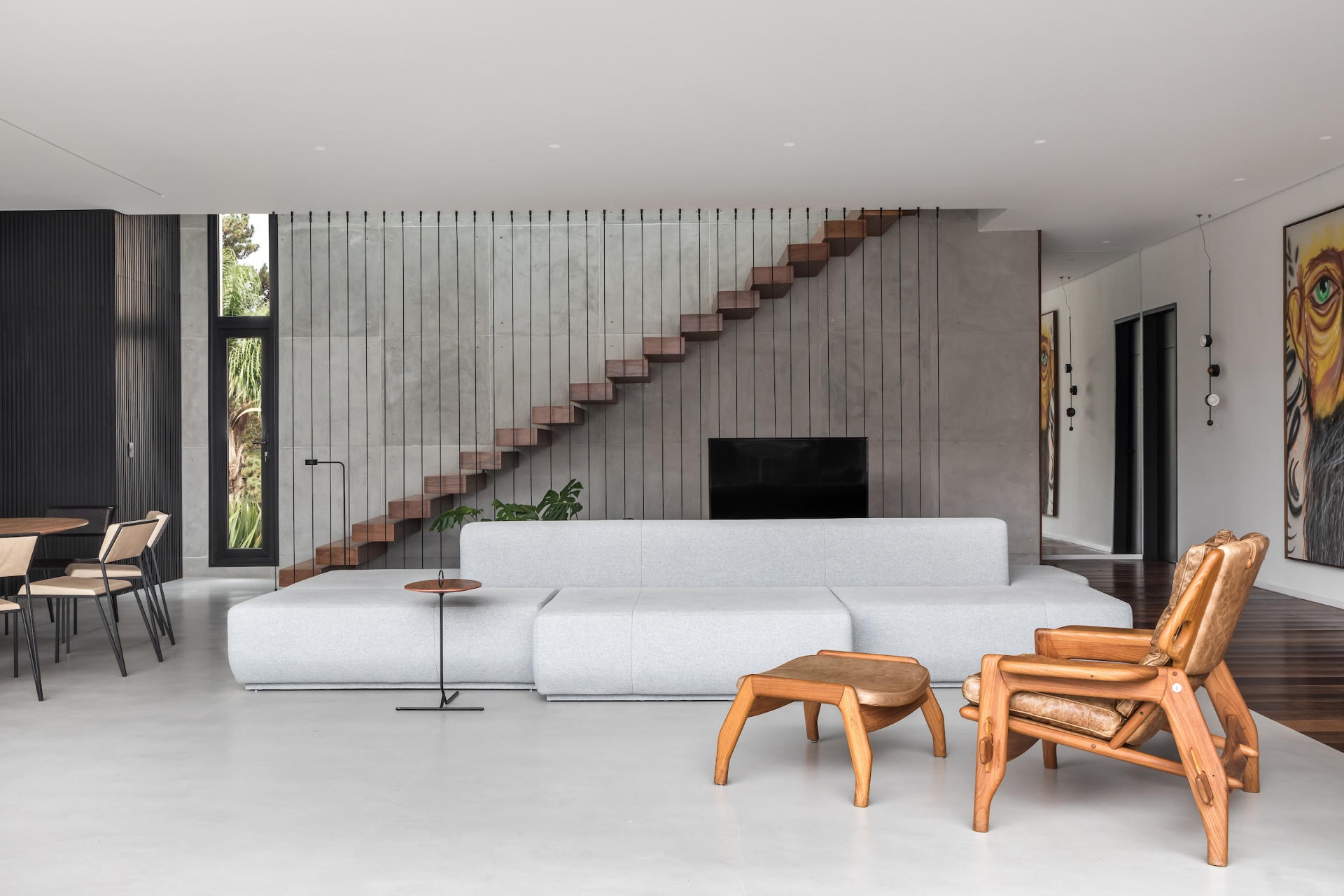 “Uma casa para receber visitas e dar muitas festas” foi o pedido da cliente desde a concepção do projeto arquitetônico. Com essa diretriz, o projeto de interiores buscou ambientes sociais amplos e integrados, com fácil modificação no layout de mobiliário e um uso completo do espaço – o sofá em ilha possibilita conversas ao seu redor, olhando tanto para o estar com TV quanto para a área externa. O canto em painel amadeirado com perfis lineares em LED, em dias de festa, se transforma no espaço destinado à mesa de DJ. Destaque para a escada metálica engastada e revestida em madeira natural e cabos de aço como proteção lateral e para a poltrona Benjamin de Sérgio Rodrigues. Fica evidente a linha contemporânea e atemporal - e a composição monocromática em equilíbrio com acabamentos amadeirados fazendo o contraste entre os tons acinzentados.