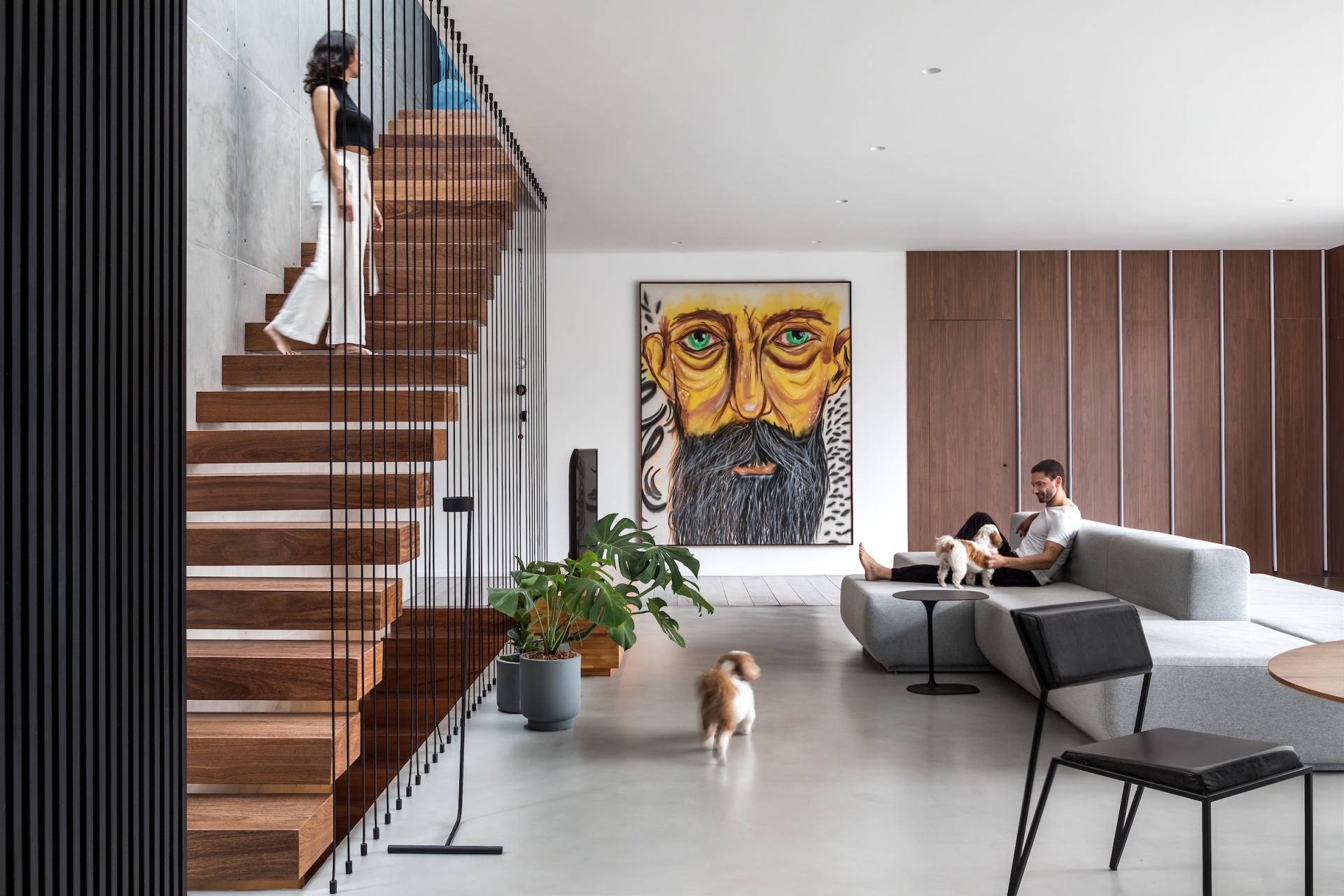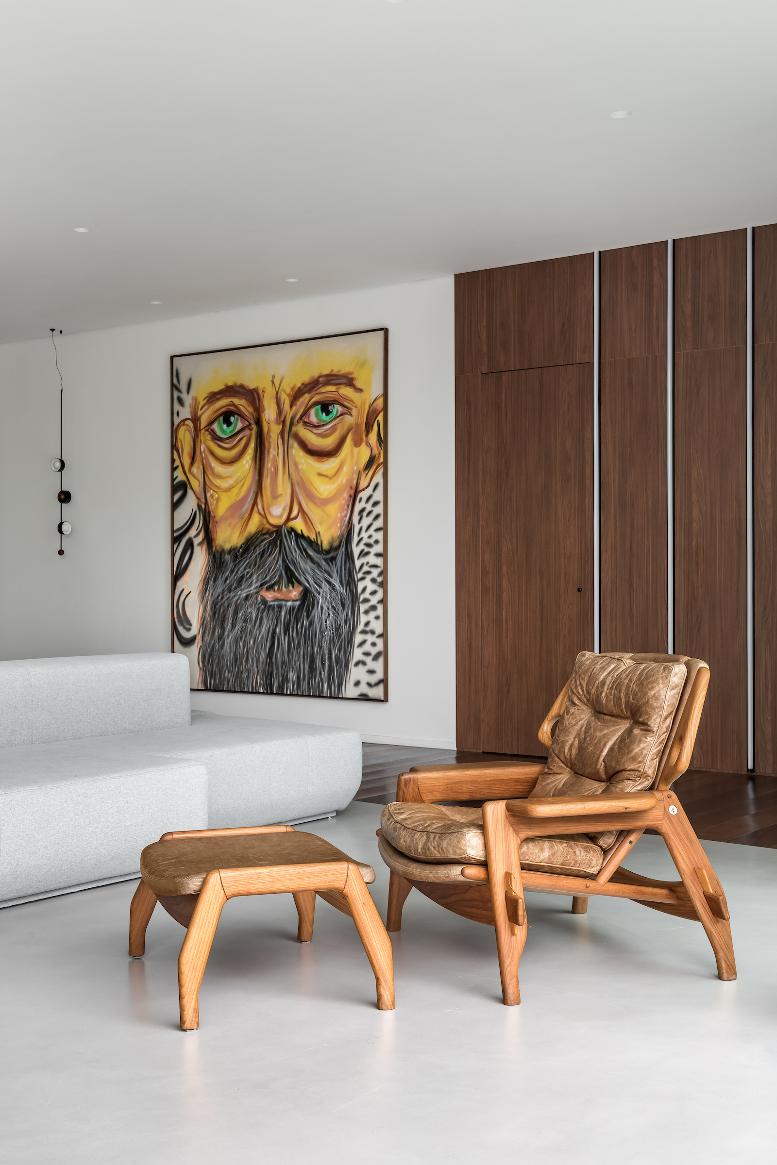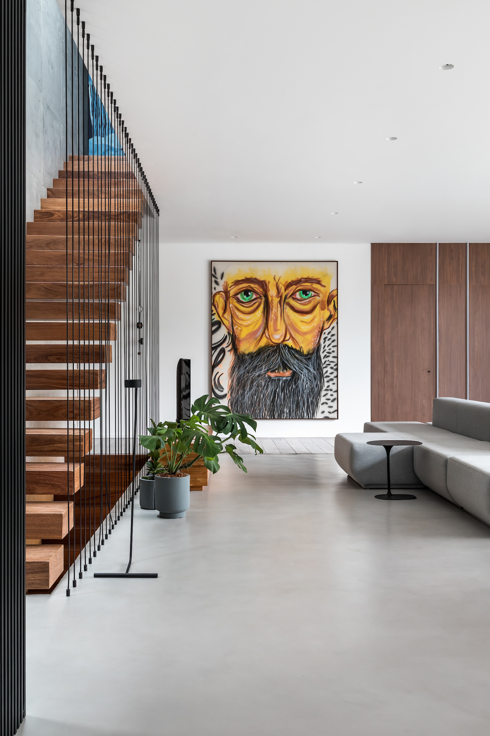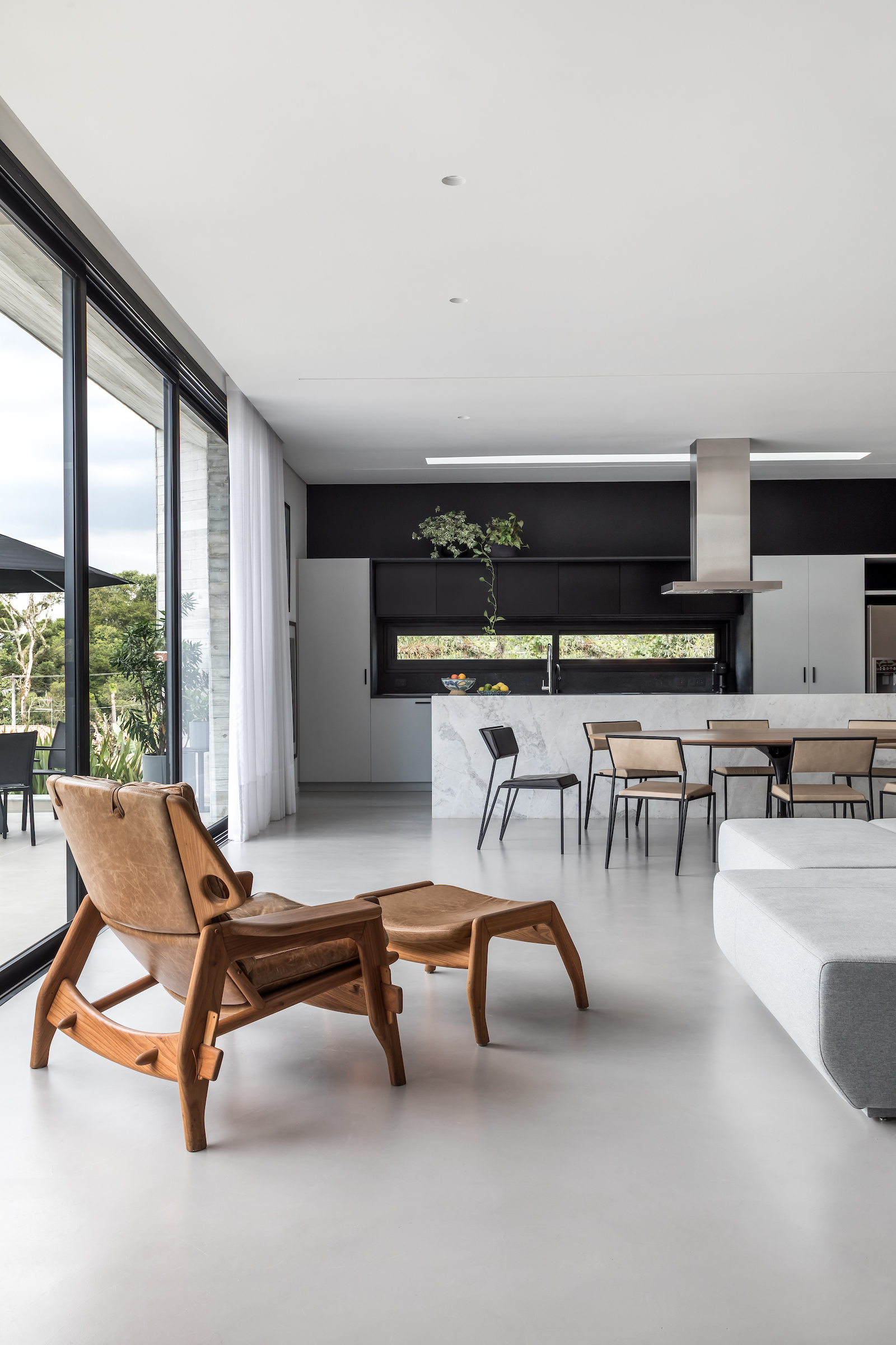 “Uma casa para receber visitas e dar muitas festas” foi o pedido da cliente desde a concepção do projeto arquitetônico. Com essa diretriz, o projeto de interiores buscou ambientes sociais amplos e integrados, com fácil modificação no layout de mobiliário e um uso completo do espaço – o sofá em ilha possibilita conversas ao seu redor, olhando tanto para o estar com TV quanto para a área externa. O canto em painel amadeirado com perfis lineares em LED, em dias de festa, se transforma no espaço destinado à mesa de DJ. Destaque para a escada metálica engastada e revestida em madeira natural e cabos de aço como proteção lateral e para a poltrona Benjamin de Sérgio Rodrigues. Fica evidente a linha contemporânea e atemporal - e a composição monocromática em equilíbrio com acabamentos amadeirados fazendo o contraste entre os tons acinzentados.