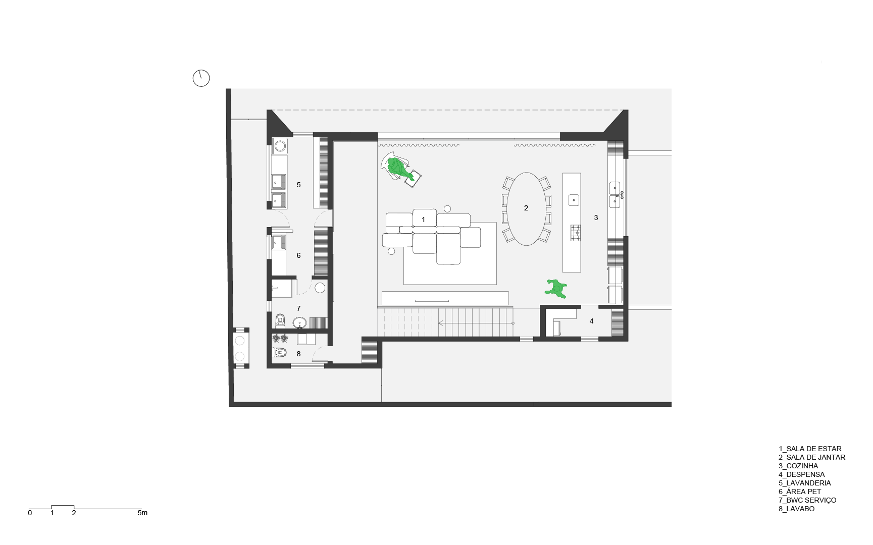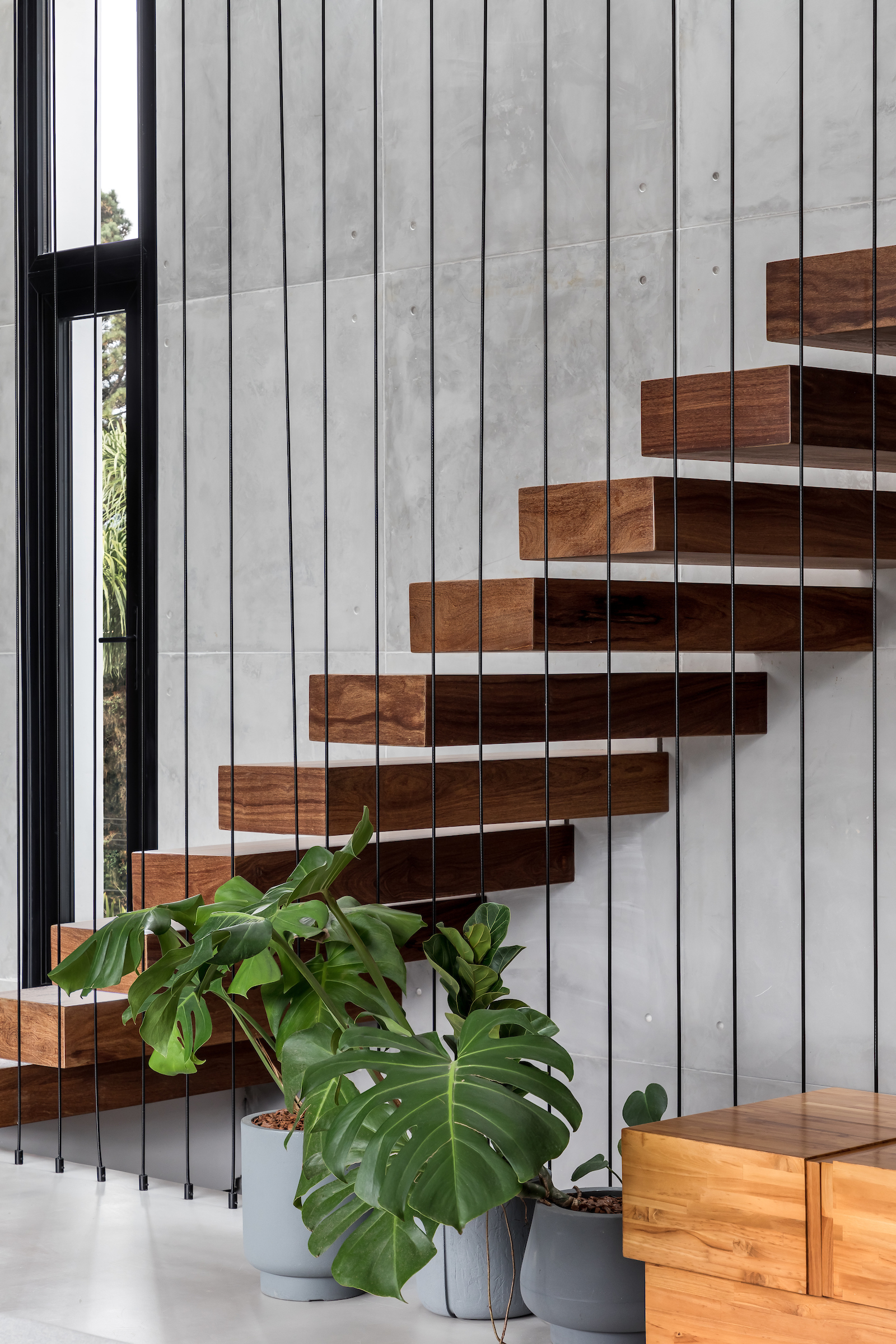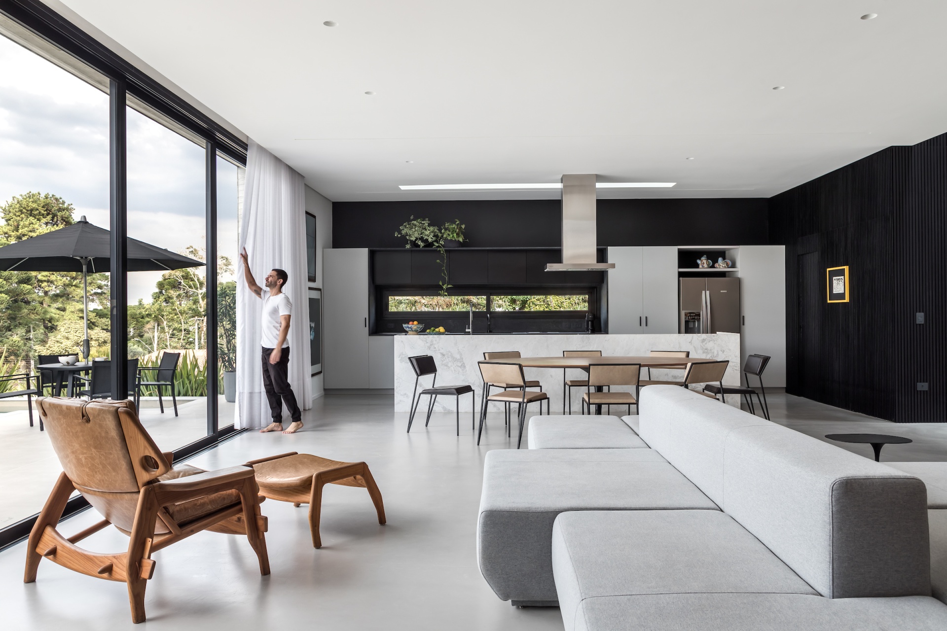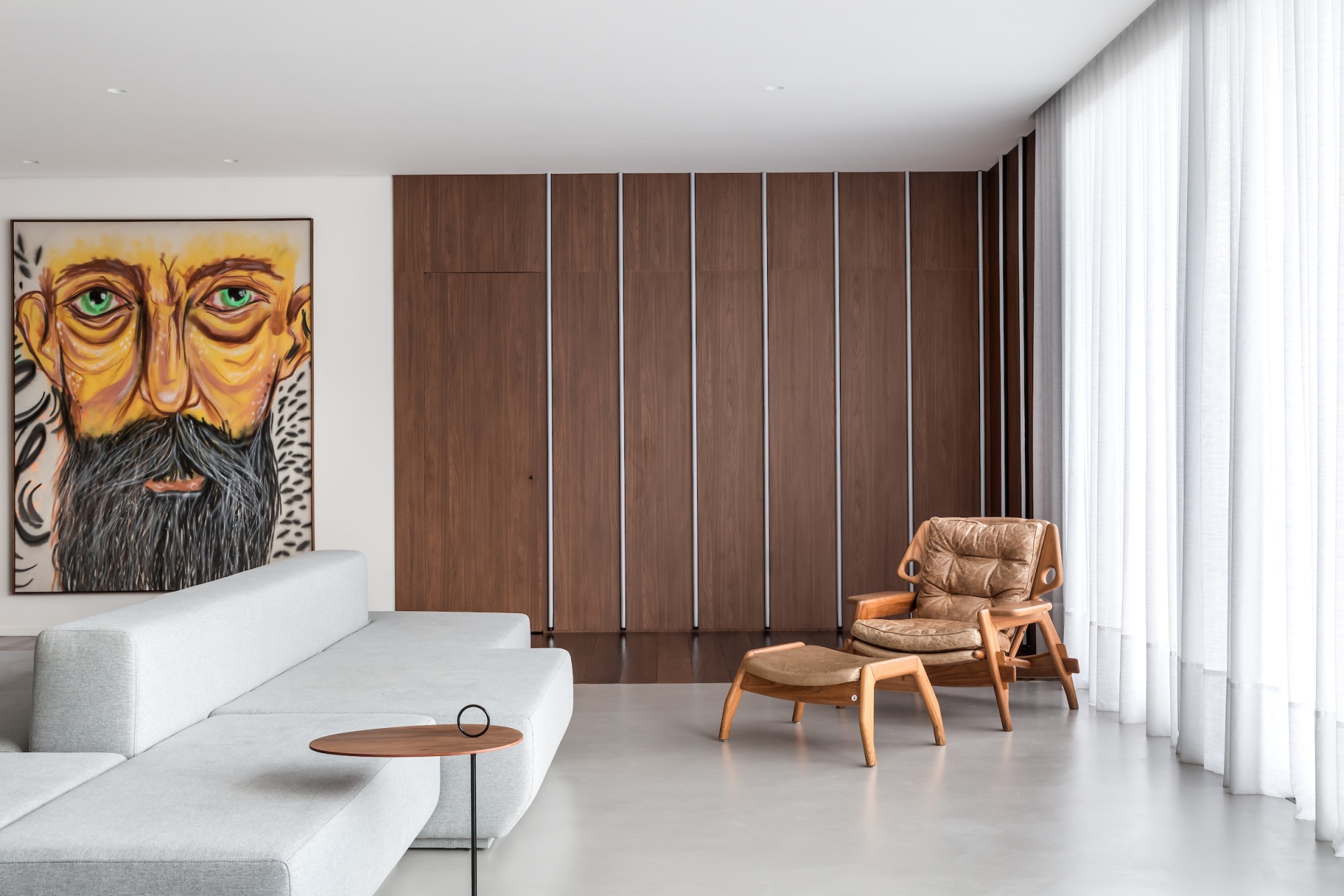 “Uma casa para receber visitas e dar muitas festas” foi o pedido da cliente desde a concepção do projeto arquitetônico. Com essa diretriz, o projeto de interiores buscou ambientes sociais amplos e integrados, com fácil modificação no layout de mobiliário e um uso completo do espaço – o sofá em ilha possibilita conversas ao seu redor, olhando tanto para o estar com TV quanto para a área externa. O canto em painel amadeirado com perfis lineares em LED, em dias de festa, se transforma no espaço destinado à mesa de DJ. Destaque para a escada metálica engastada e revestida em madeira natural e cabos de aço como proteção lateral e para a poltrona Benjamin de Sérgio Rodrigues. Fica evidente a linha contemporânea e atemporal - e a composição monocromática em equilíbrio com acabamentos amadeirados fazendo o contraste entre os tons acinzentados.