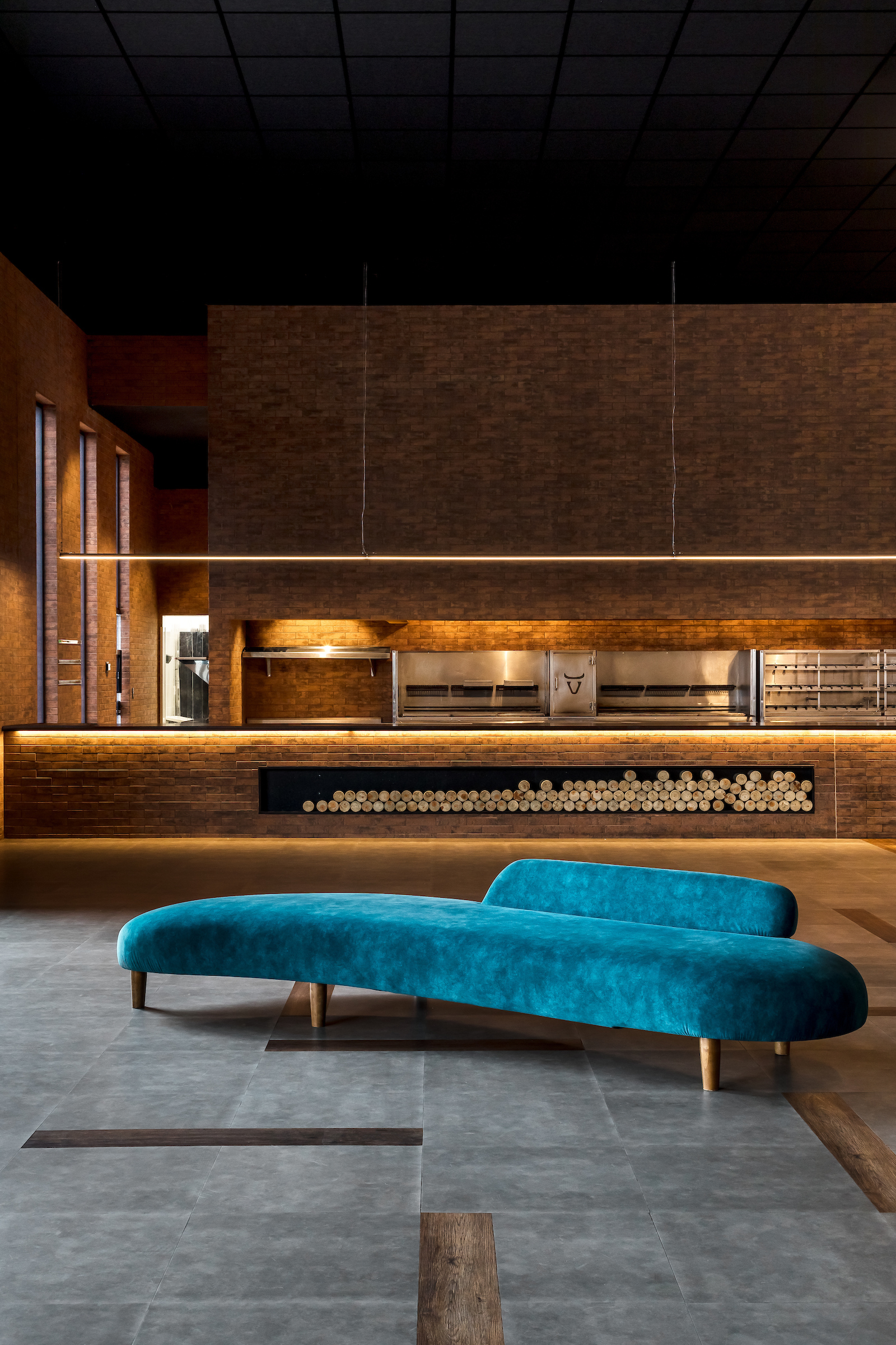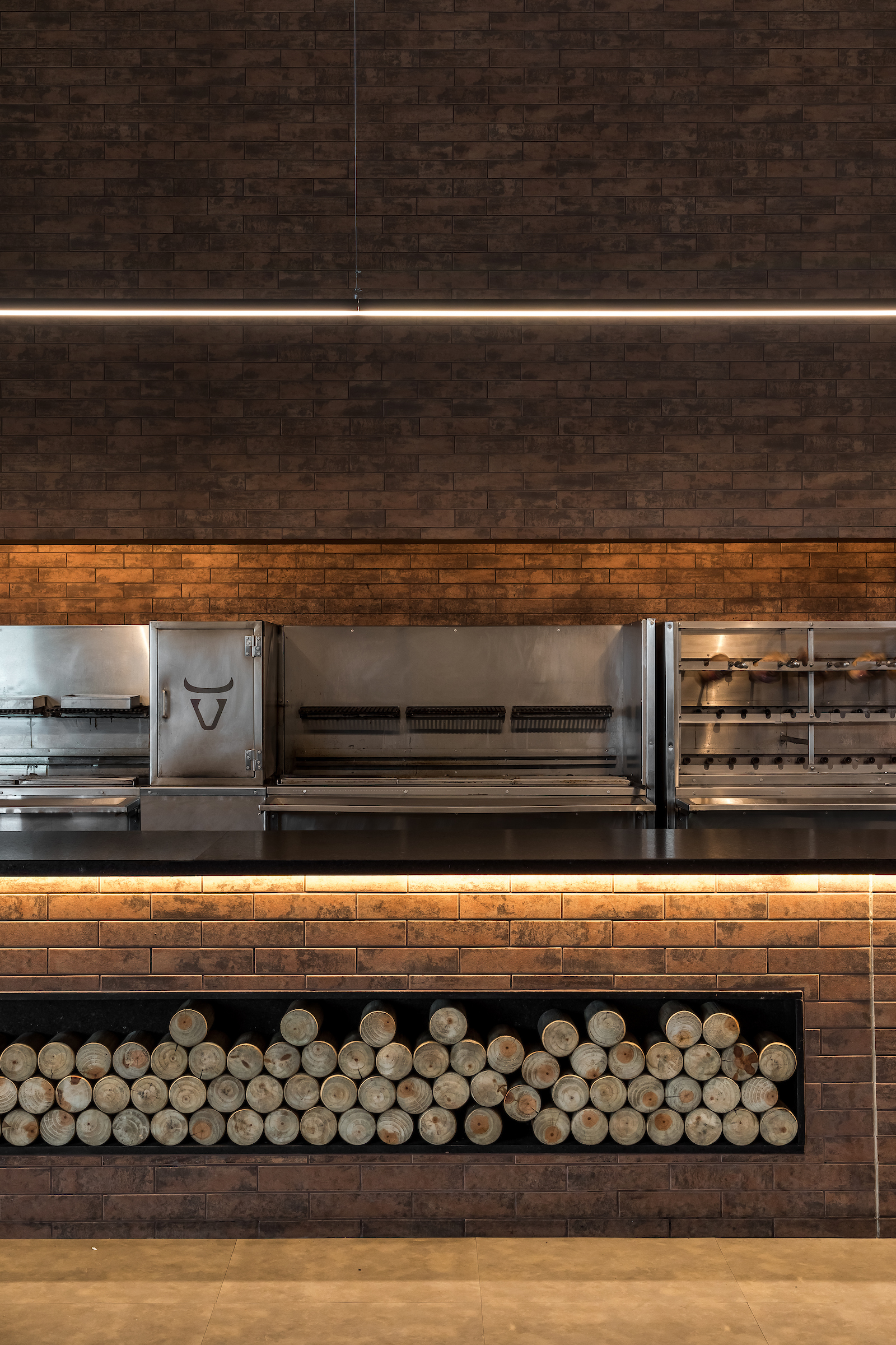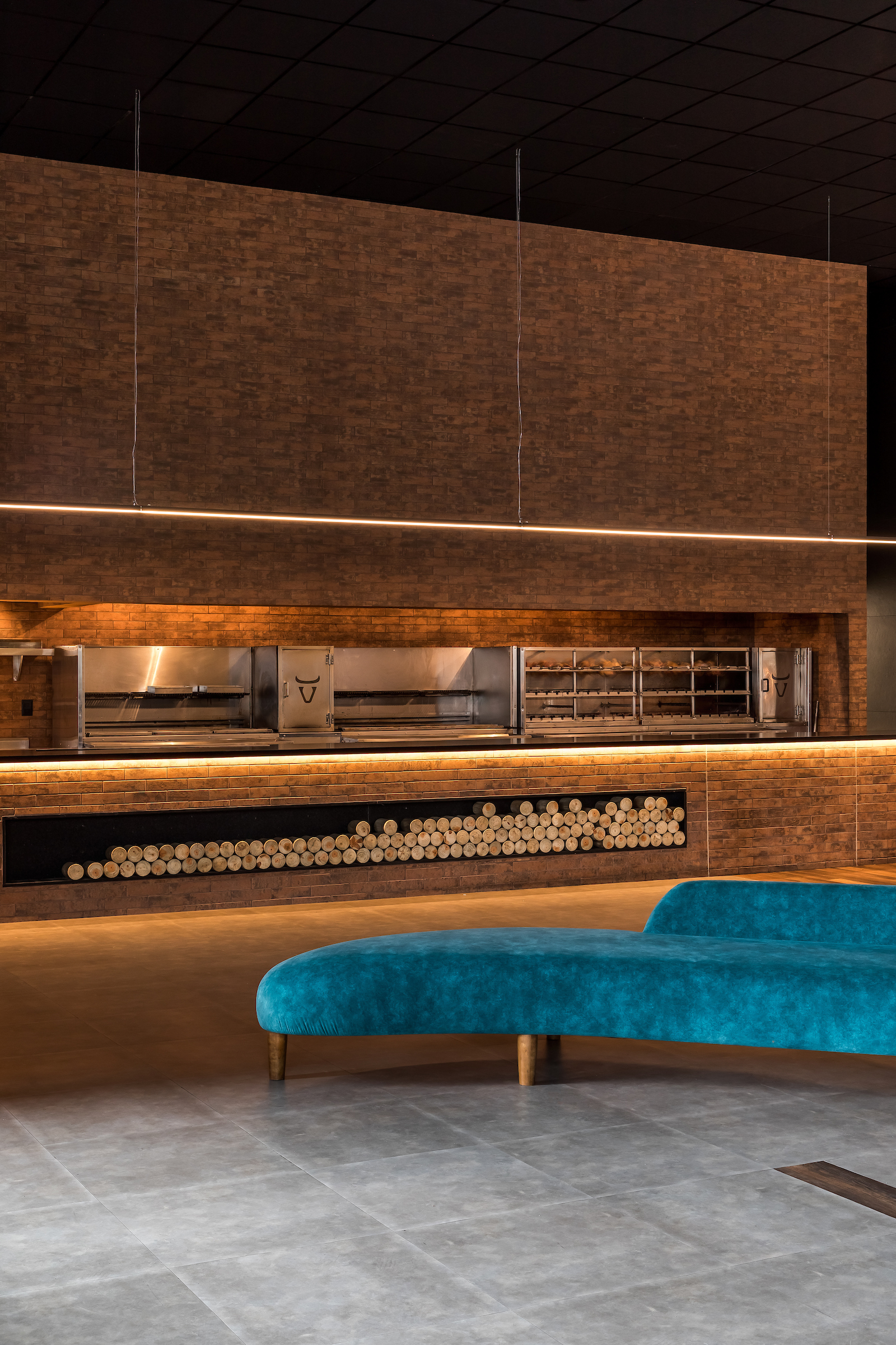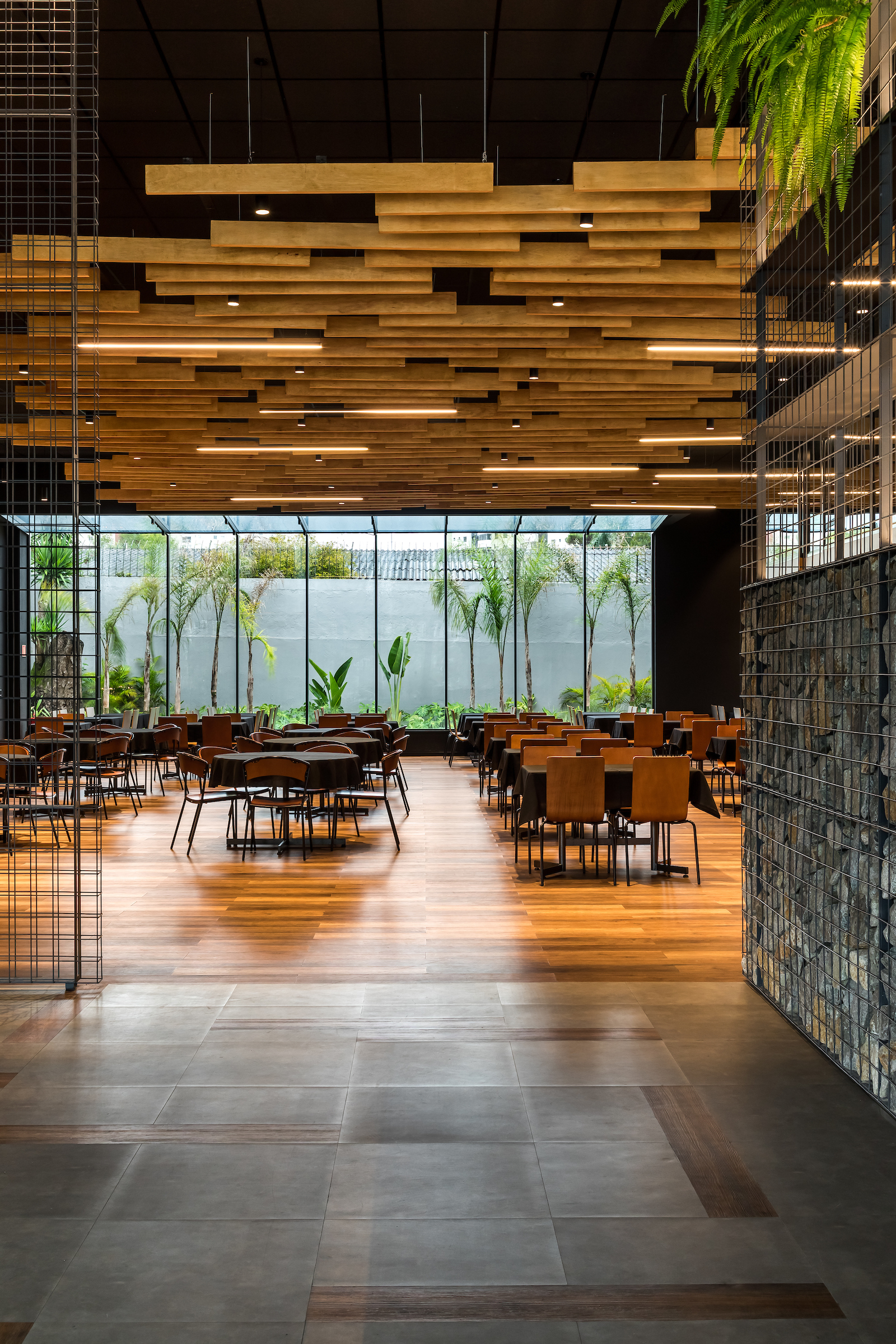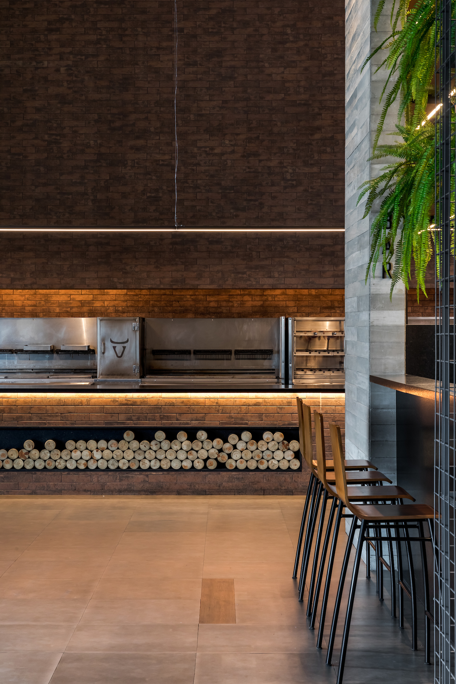 No projeto da churrascaria, com 740m² de área de interiores, as soluções de acabamento fazem uma organização visual enquanto dividem os diferentes usos dentro do espaço. O lounge de recepção e o bar fazem a transição entre a área externa - a partir de portas pivotantes em metal e vidro na entrada - e o salão principal, através dos planos verticais revestidos com ripas de concreto e armação metálica e do muro gabião, no plano horizontal. Elemento de destaque, as ripas em madeira suspensas, além de solução estética, têm a função de diminuir a altura do pé direito para se aproximar da escala da pessoa e compensar a amplitude da arquitetura. Por baixo do forro mineral preto, dão conforto acústico ao ambiente, melhorando a experiência durante a refeição. Painéis de correr criam planos que definem áreas menores dentro do amplo salão e dão flexibilidade de uso para o restaurante, dividindo os ambientes em salas reservadas. As portas misturam o acabamento amadeirado com uma bandeira em vidro, que mantém a luminosidade nos espaços sem dar sensação de fechamento. O equilíbrio entre os elementos frios com caráter bruto - concreto, pedra, ferro - e os quentes e acolhedores - vegetação pendente, painéis amadeirados, tecidos - é o que transforma a atmosfera do ambiente, ganhando um ar de sofisticação apesar da composição de itens industriais.