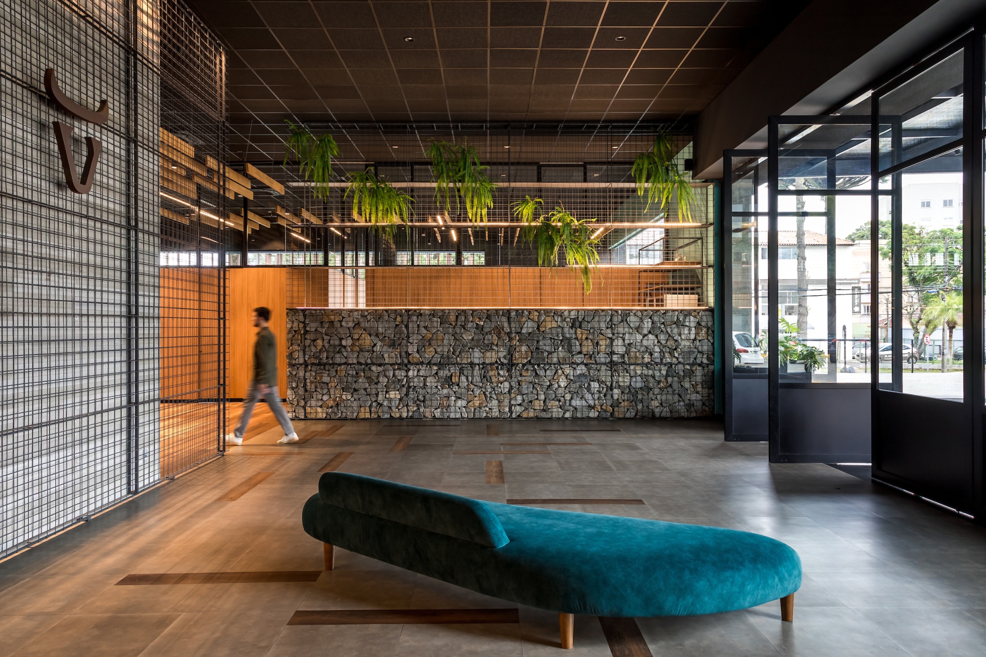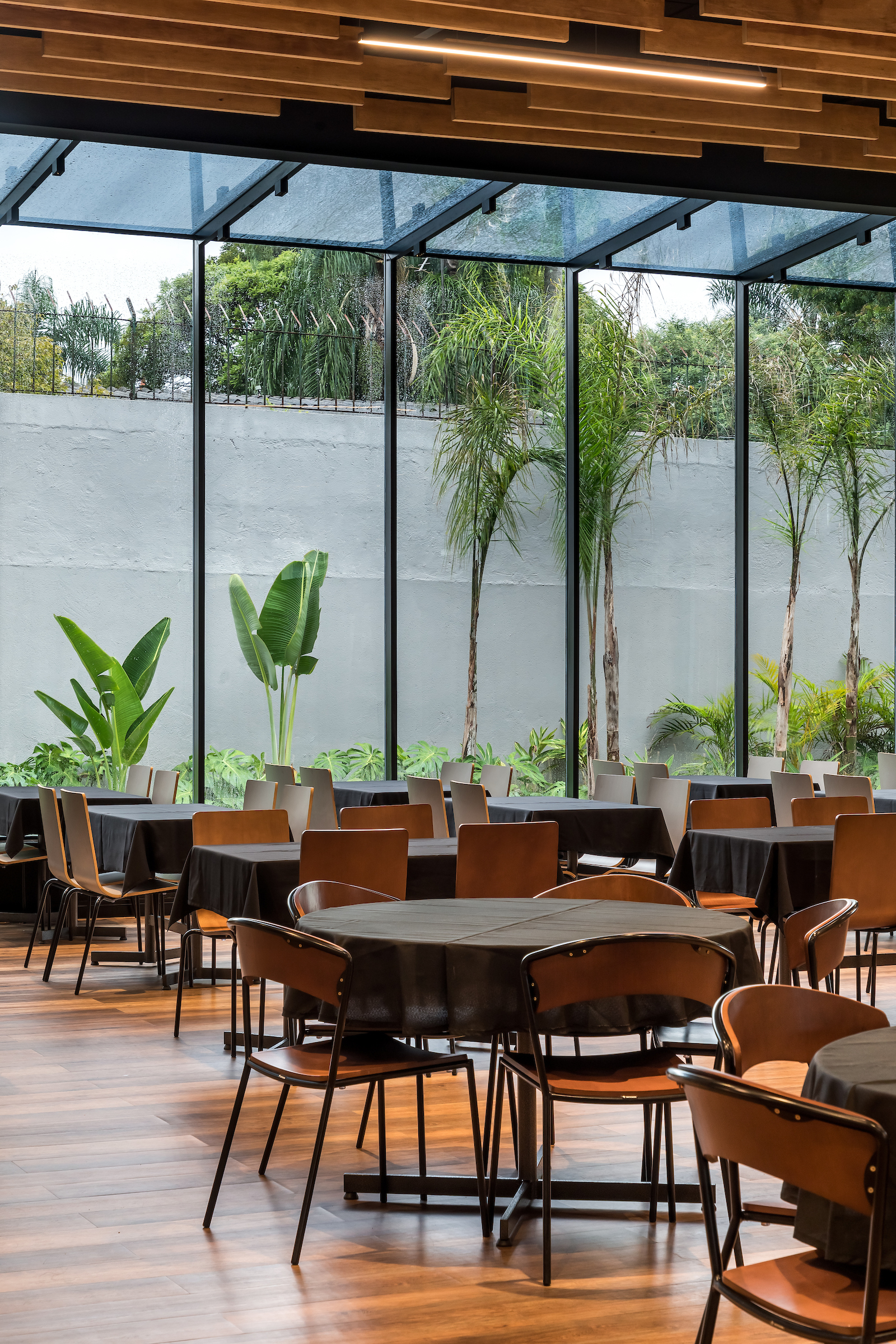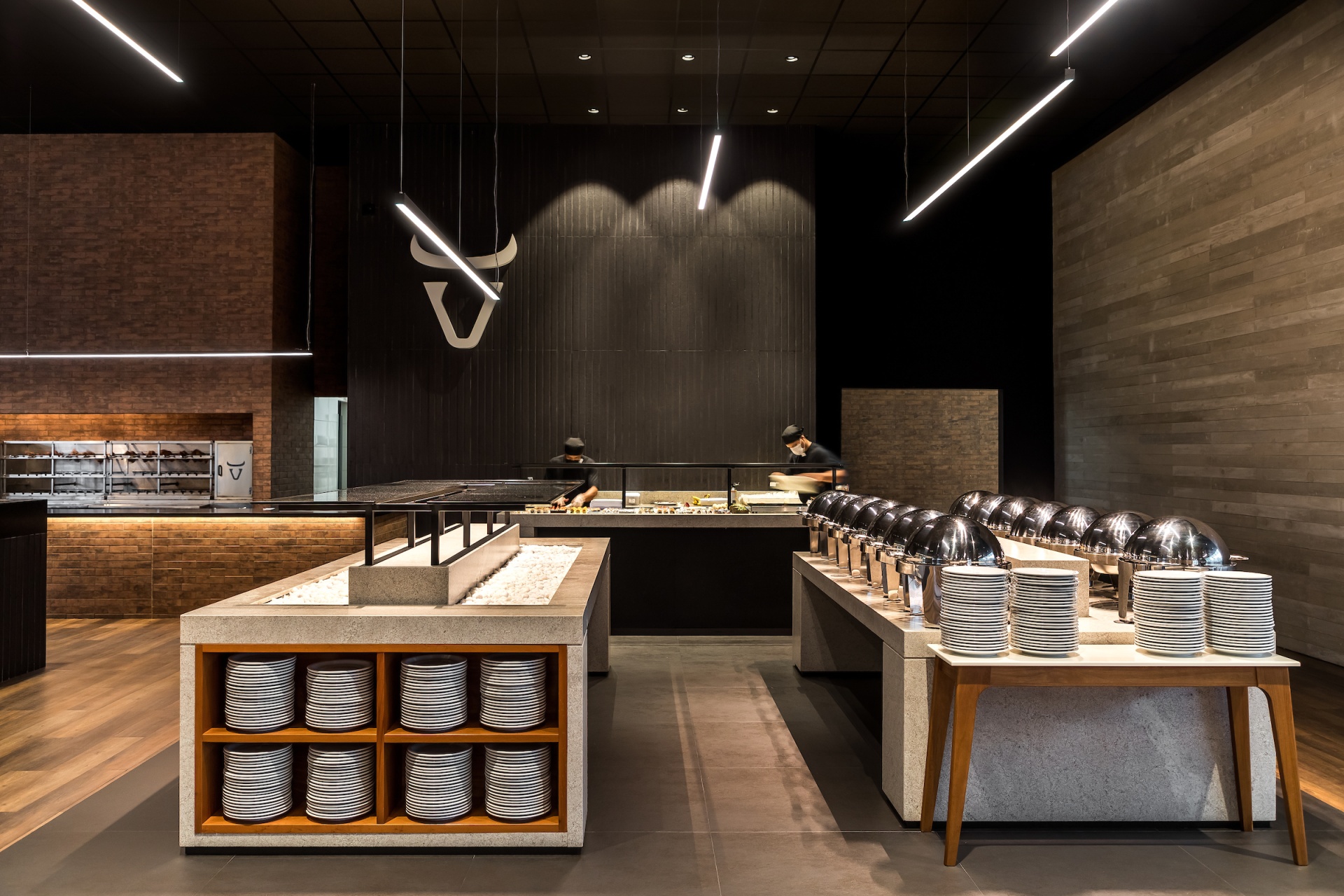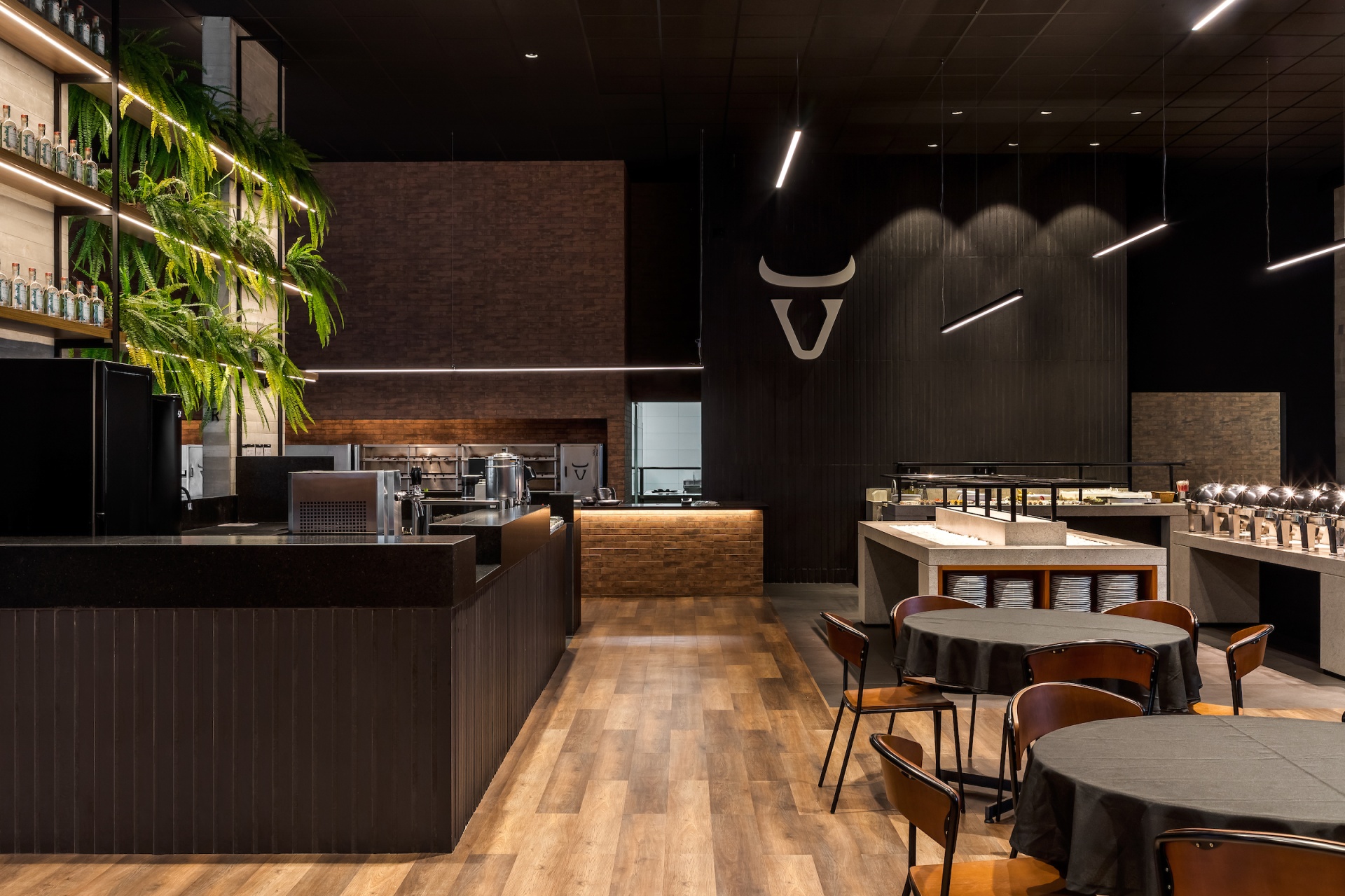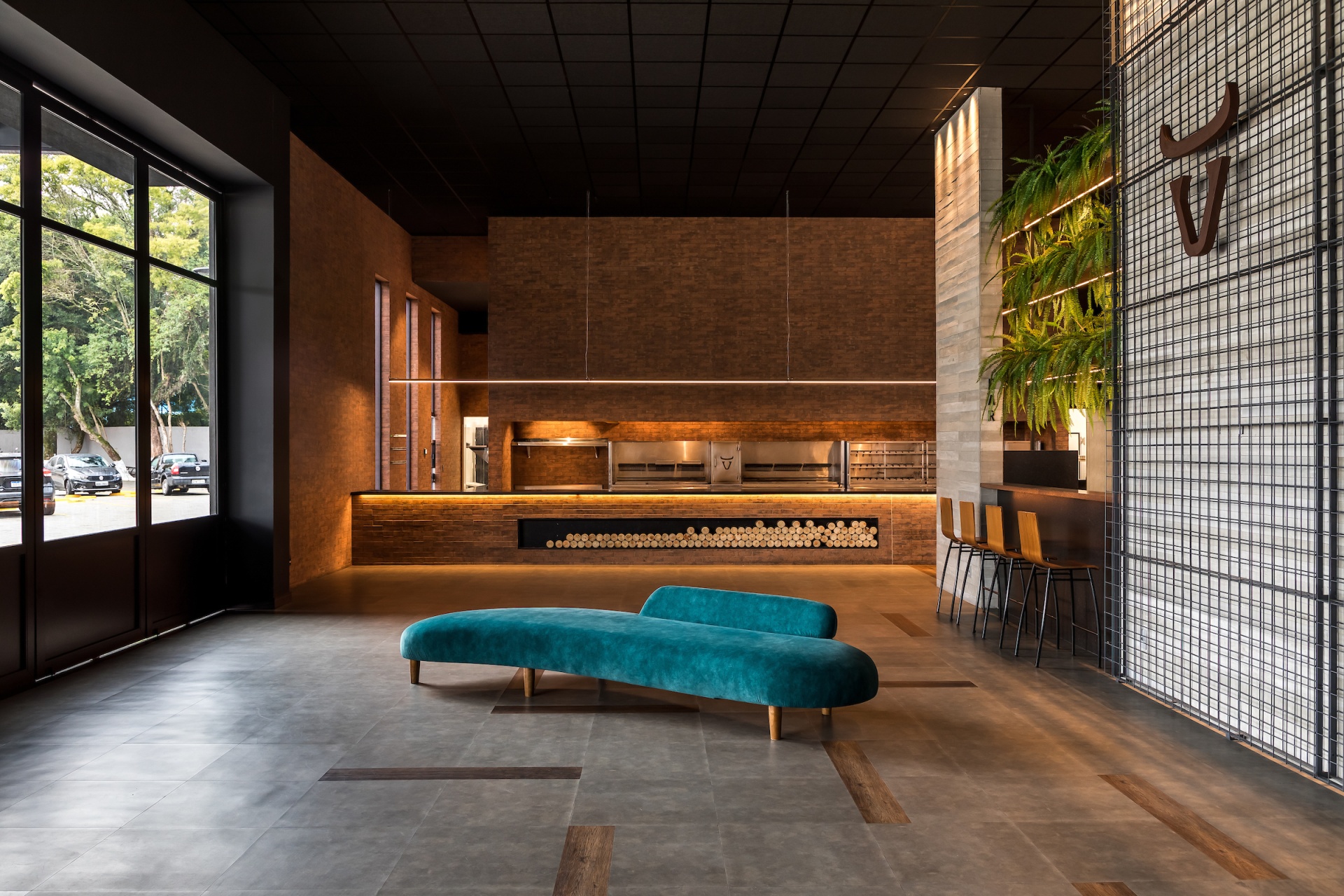 No projeto da churrascaria, com 740m² de área de interiores, as soluções de acabamento fazem uma organização visual enquanto dividem os diferentes usos dentro do espaço. O lounge de recepção e o bar fazem a transição entre a área externa - a partir de portas pivotantes em metal e vidro na entrada - e o salão principal, através dos planos verticais revestidos com ripas de concreto e armação metálica e do muro gabião, no plano horizontal. Elemento de destaque, as ripas em madeira suspensas, além de solução estética, têm a função de diminuir a altura do pé direito para se aproximar da escala da pessoa e compensar a amplitude da arquitetura. Por baixo do forro mineral preto, dão conforto acústico ao ambiente, melhorando a experiência durante a refeição. Painéis de correr criam planos que definem áreas menores dentro do amplo salão e dão flexibilidade de uso para o restaurante, dividindo os ambientes em salas reservadas. As portas misturam o acabamento amadeirado com uma bandeira em vidro, que mantém a luminosidade nos espaços sem dar sensação de fechamento. O equilíbrio entre os elementos frios com caráter bruto - concreto, pedra, ferro - e os quentes e acolhedores - vegetação pendente, painéis amadeirados, tecidos - é o que transforma a atmosfera do ambiente, ganhando um ar de sofisticação apesar da composição de itens industriais.