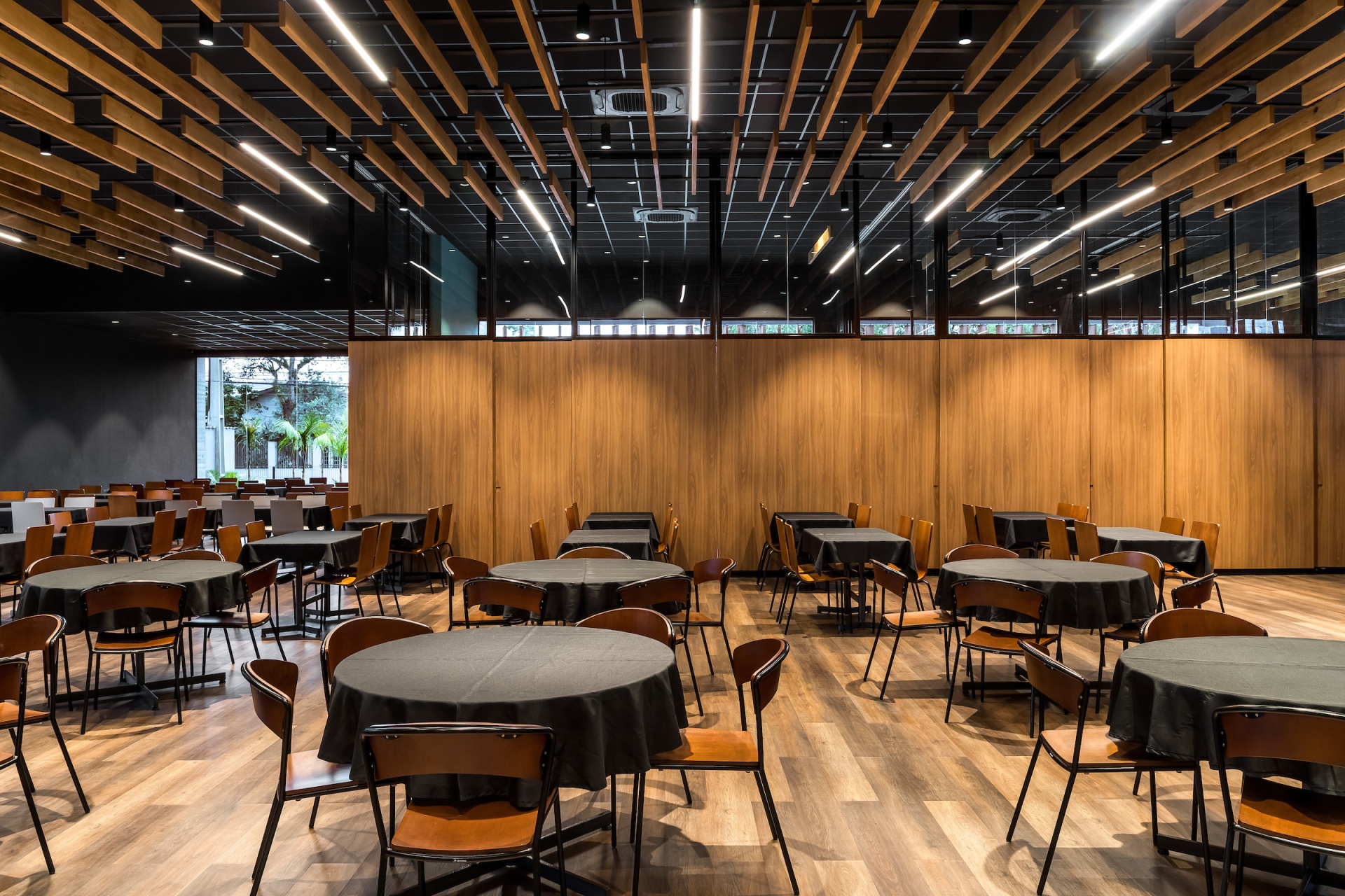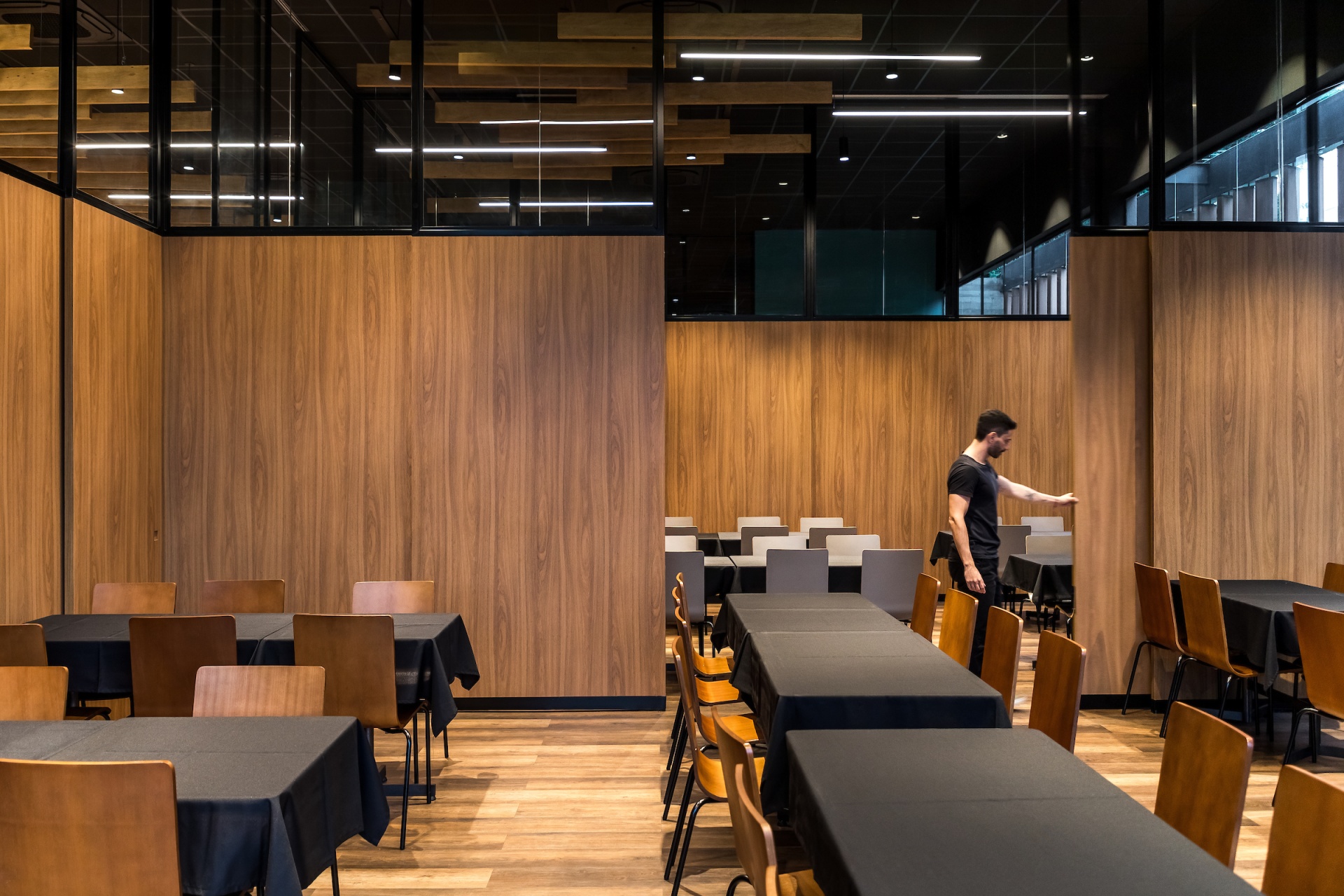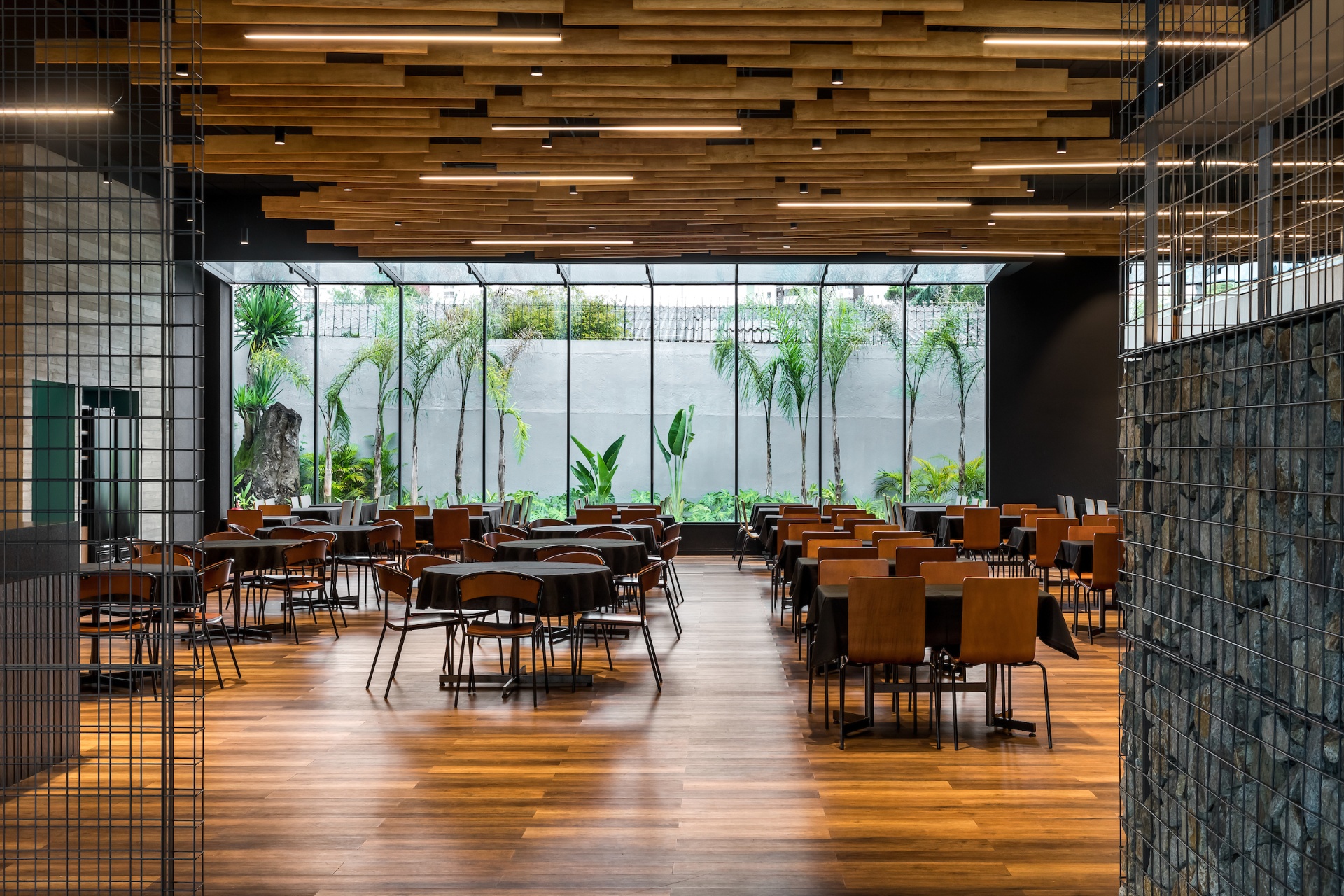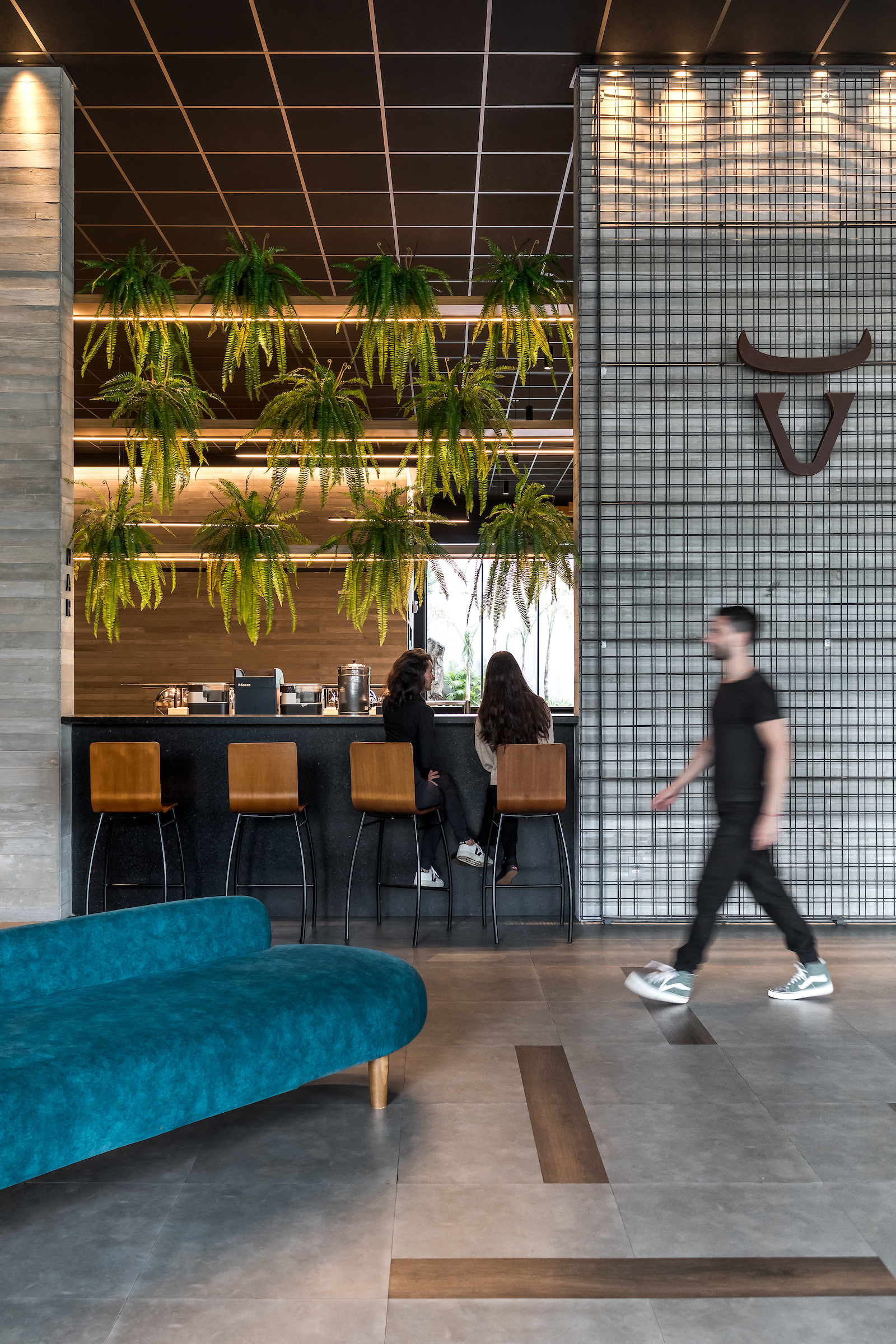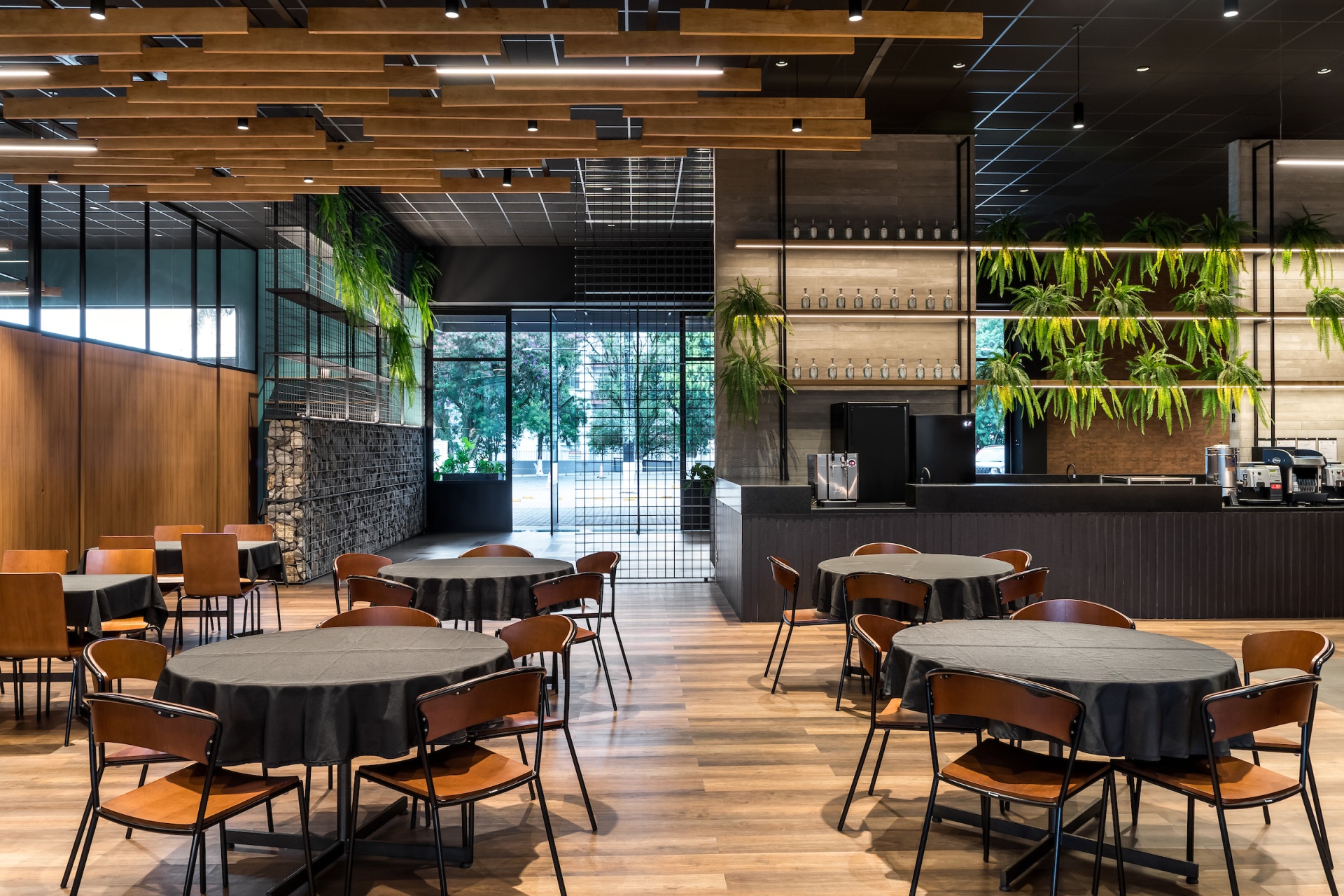 No projeto da churrascaria, com 740m² de área de interiores, as soluções de acabamento fazem uma organização visual enquanto dividem os diferentes usos dentro do espaço. O lounge de recepção e o bar fazem a transição entre a área externa - a partir de portas pivotantes em metal e vidro na entrada - e o salão principal, através dos planos verticais revestidos com ripas de concreto e armação metálica e do muro gabião, no plano horizontal. Elemento de destaque, as ripas em madeira suspensas, além de solução estética, têm a função de diminuir a altura do pé direito para se aproximar da escala da pessoa e compensar a amplitude da arquitetura. Por baixo do forro mineral preto, dão conforto acústico ao ambiente, melhorando a experiência durante a refeição. Painéis de correr criam planos que definem áreas menores dentro do amplo salão e dão flexibilidade de uso para o restaurante, dividindo os ambientes em salas reservadas. As portas misturam o acabamento amadeirado com uma bandeira em vidro, que mantém a luminosidade nos espaços sem dar sensação de fechamento. O equilíbrio entre os elementos frios com caráter bruto - concreto, pedra, ferro - e os quentes e acolhedores - vegetação pendente, painéis amadeirados, tecidos - é o que transforma a atmosfera do ambiente, ganhando um ar de sofisticação apesar da composição de itens industriais.